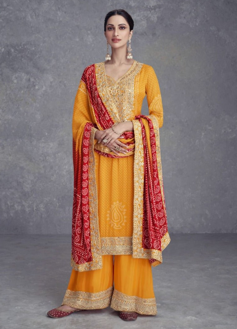 YELLOW & PURPLE CHINON BANDHANI PARTY WEAR SUIT WITH FLAIRED PLAZO