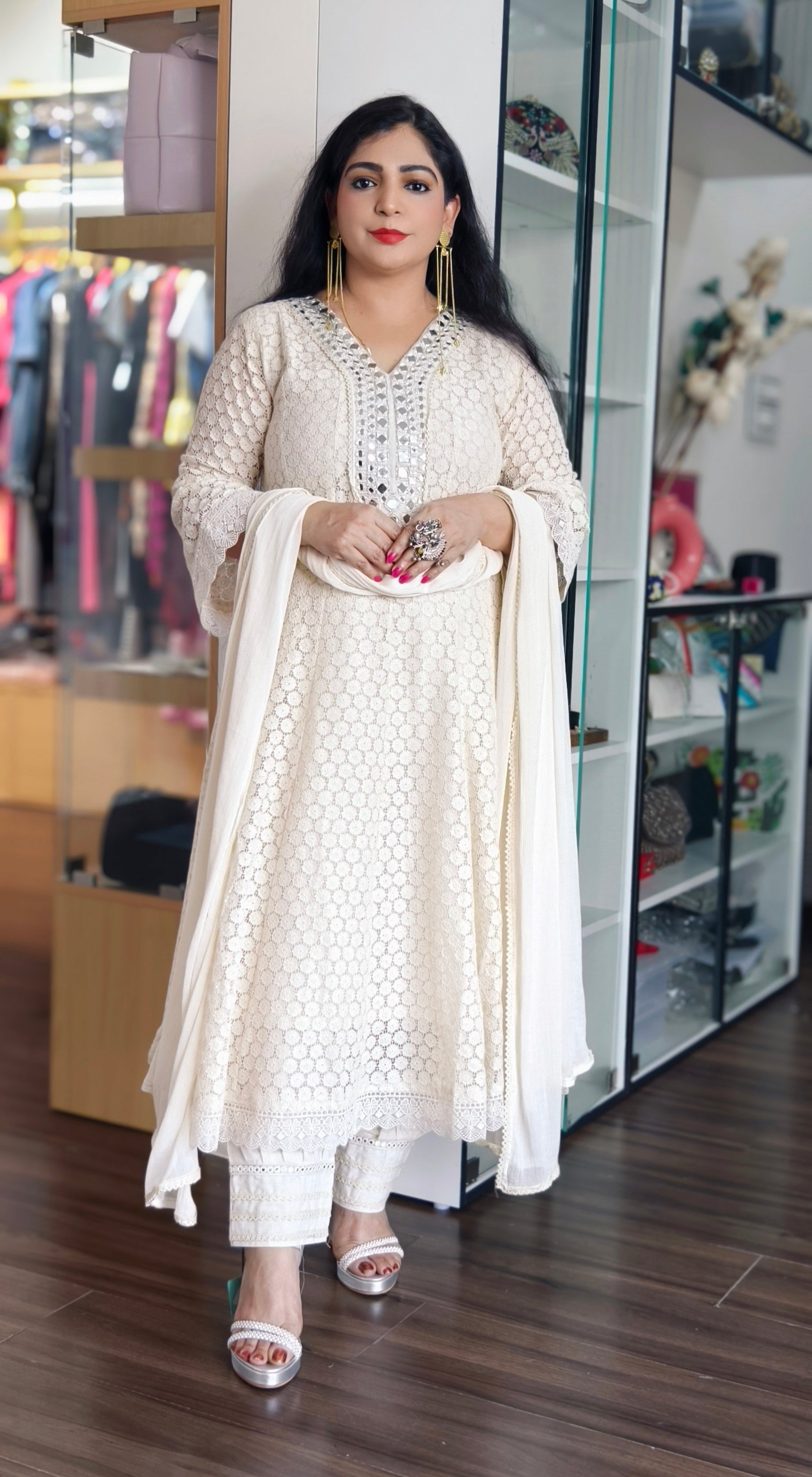 A BEIGE COTTON ANARKALI WITH AFGHANI COTTON is a perfect blend of elegance and comfort. The outfit features a soft, breathable cotton fabric, offering all-day comfort while maintaining a refined look. The adds a modern twist to the traditional Anarkali silhouette, enhancing its flow and movement. The delicate around the edges provide a feminine, intricate touch, elevating the overall design. Paired with matching afghani pants, this ensemble combines traditional elements with contemporary style, making it ideal for casual outings, festive events, or semi-formal occasions.