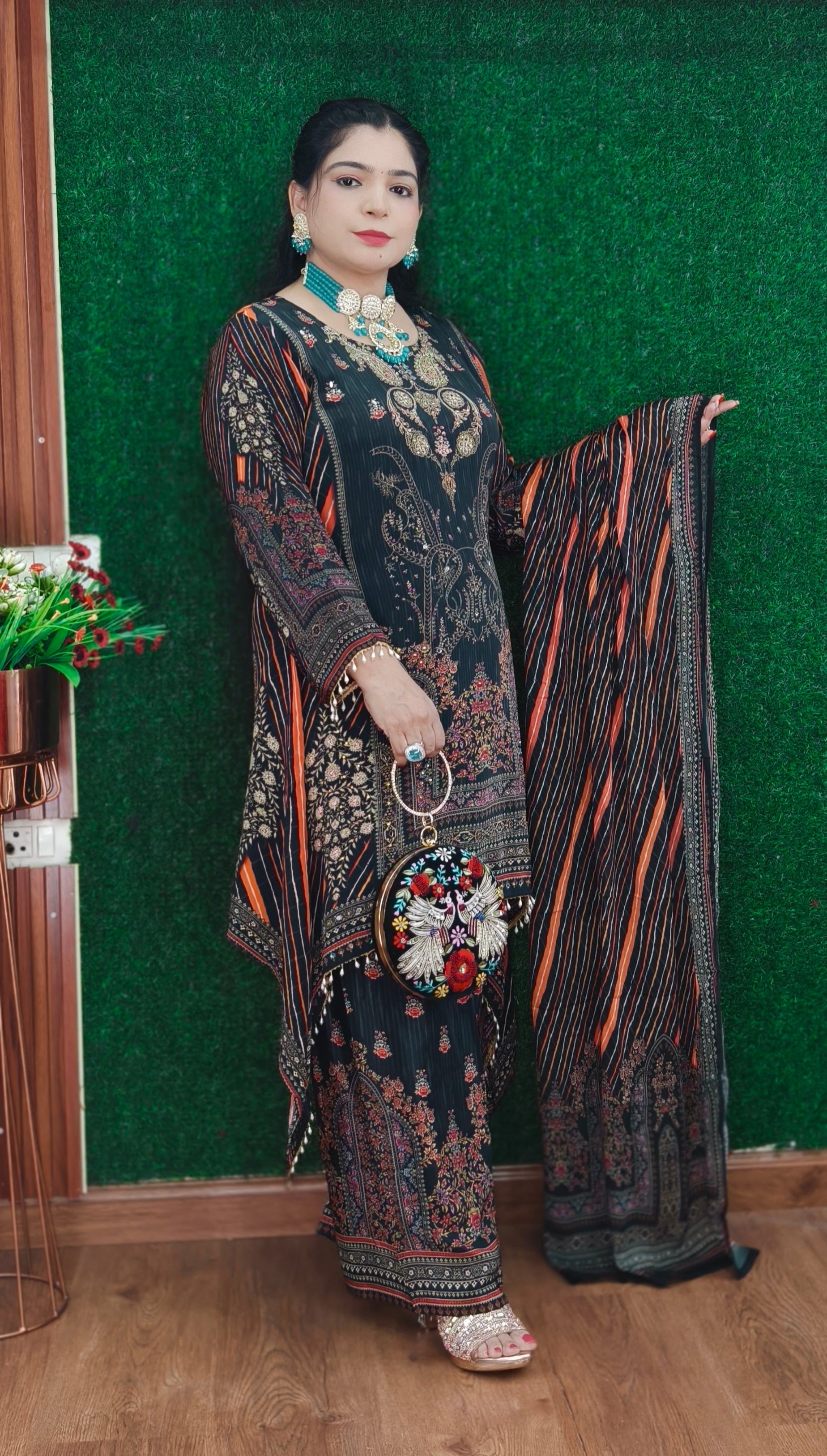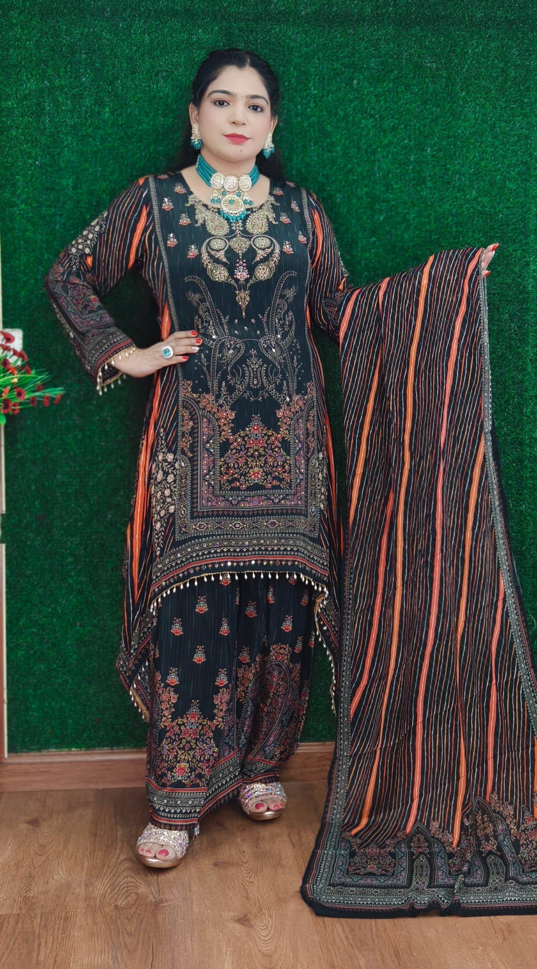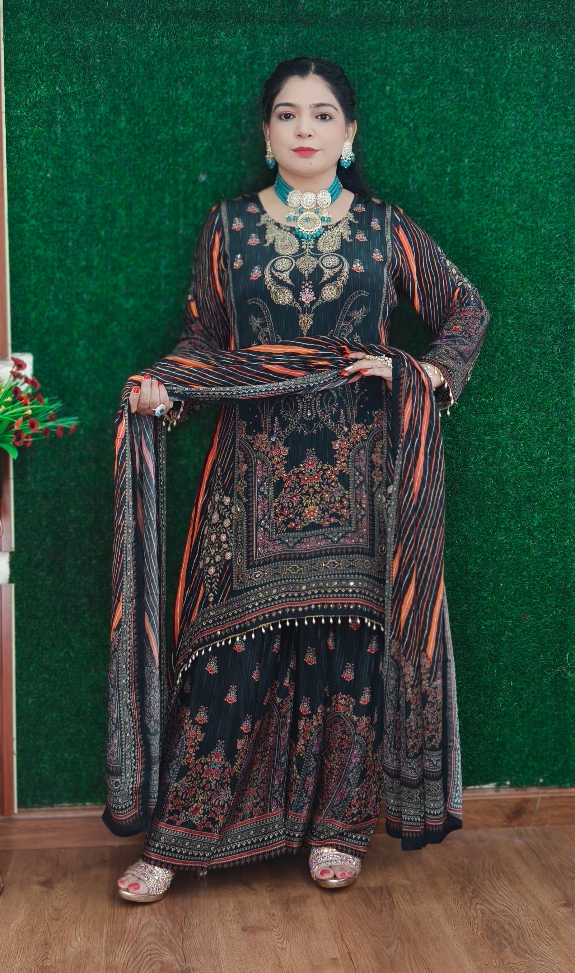 The BLACK FLORAL CREPE C CUT SUIT WITH PLAZO is a stunning ensemble that blends elegance and contemporary style. This lehenga features a rich emerald green base adorned with intricate floral patterns, creating a vibrant and captivating look. The flowing organza fabric adds a touch of ethereal grace, while the chic cape design provides a modern twist. Perfect for festive occasions or weddings, this outfit promises to make a statement, exuding sophistication and charm.