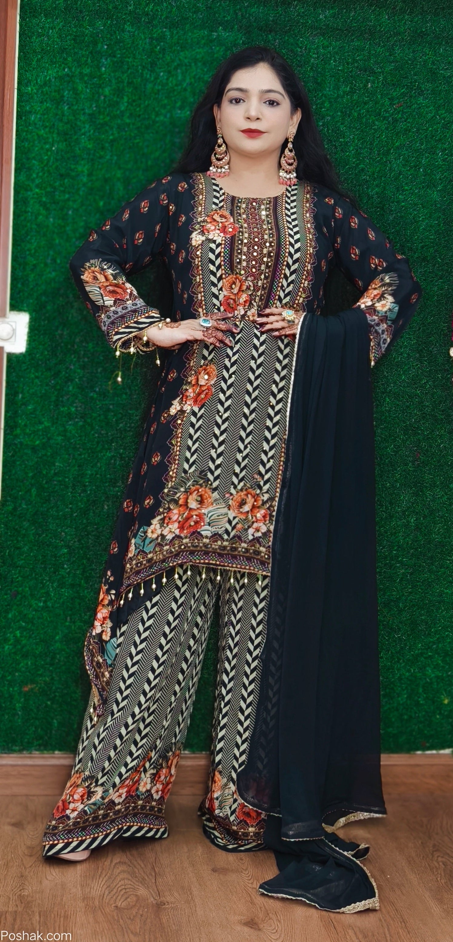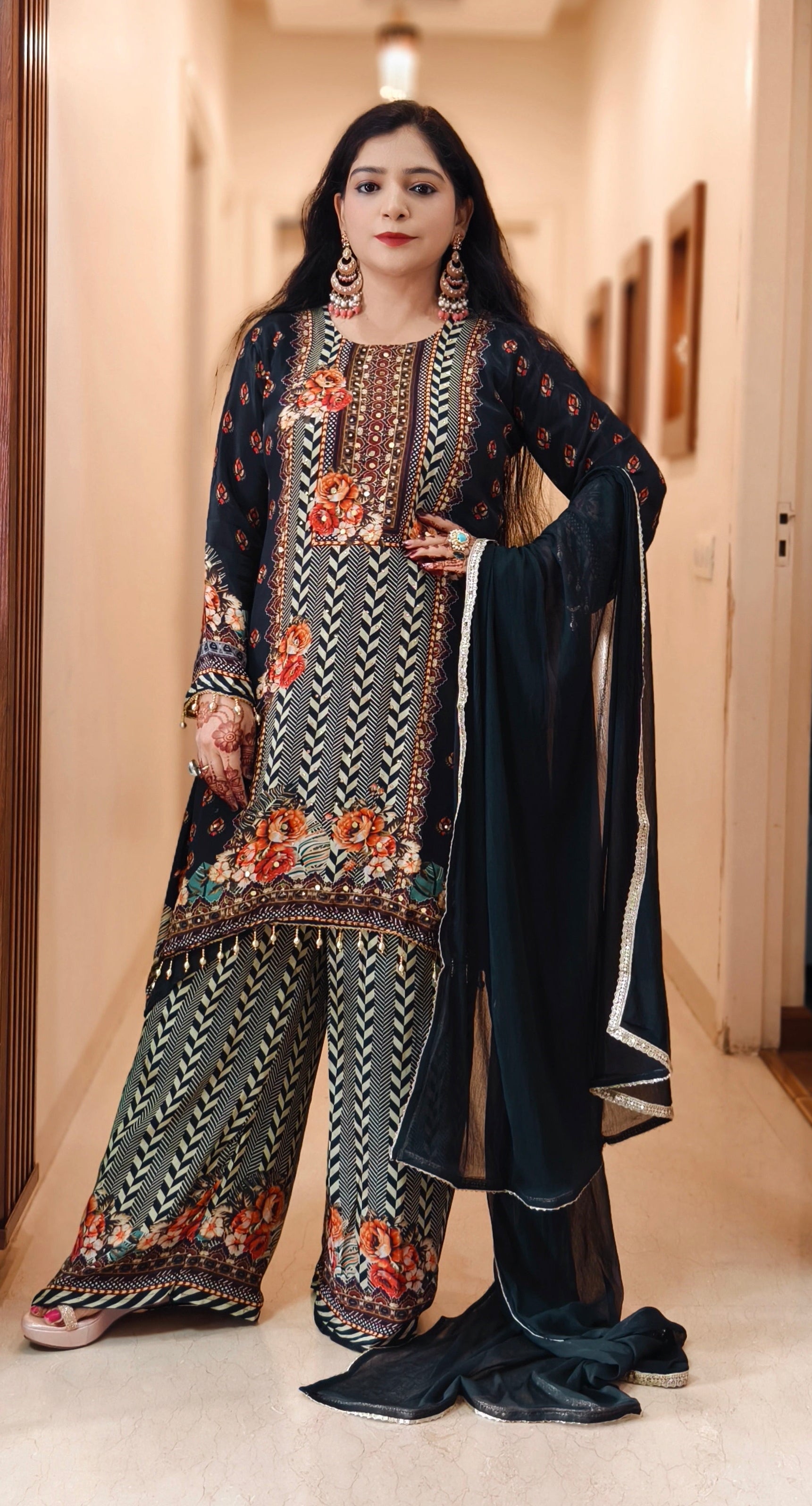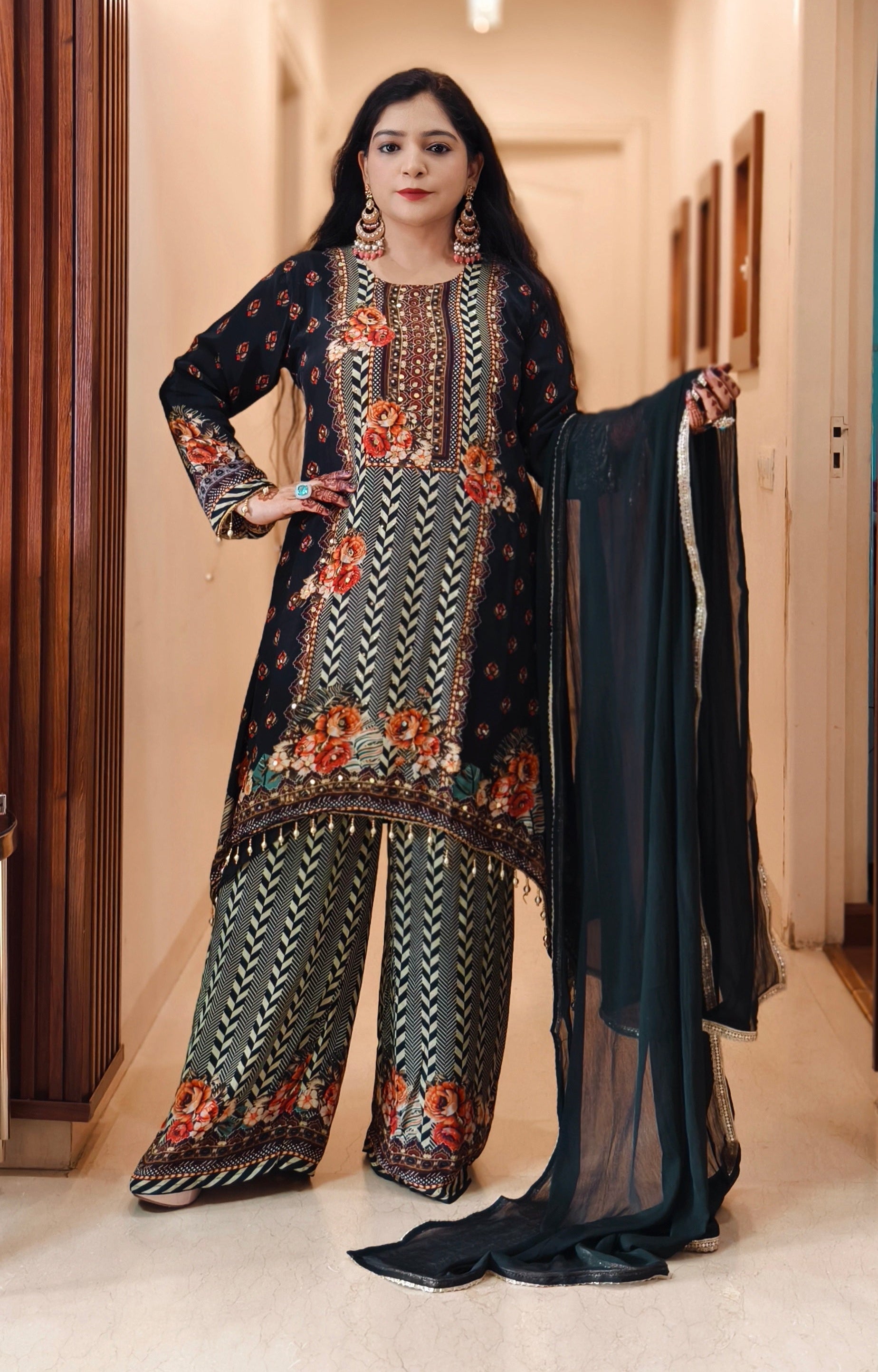 The BLACK FLORAL CREPE C CUT SUIT WITH PLAZO is a stunning ensemble that blends elegance and contemporary style. This lehenga features a rich emerald green base adorned with intricate floral patterns, creating a vibrant and captivating look. The flowing organza fabric adds a touch of ethereal grace, while the chic cape design provides a modern twist. Perfect for festive occasions or weddings, this outfit promises to make a statement, exuding sophistication and charm.