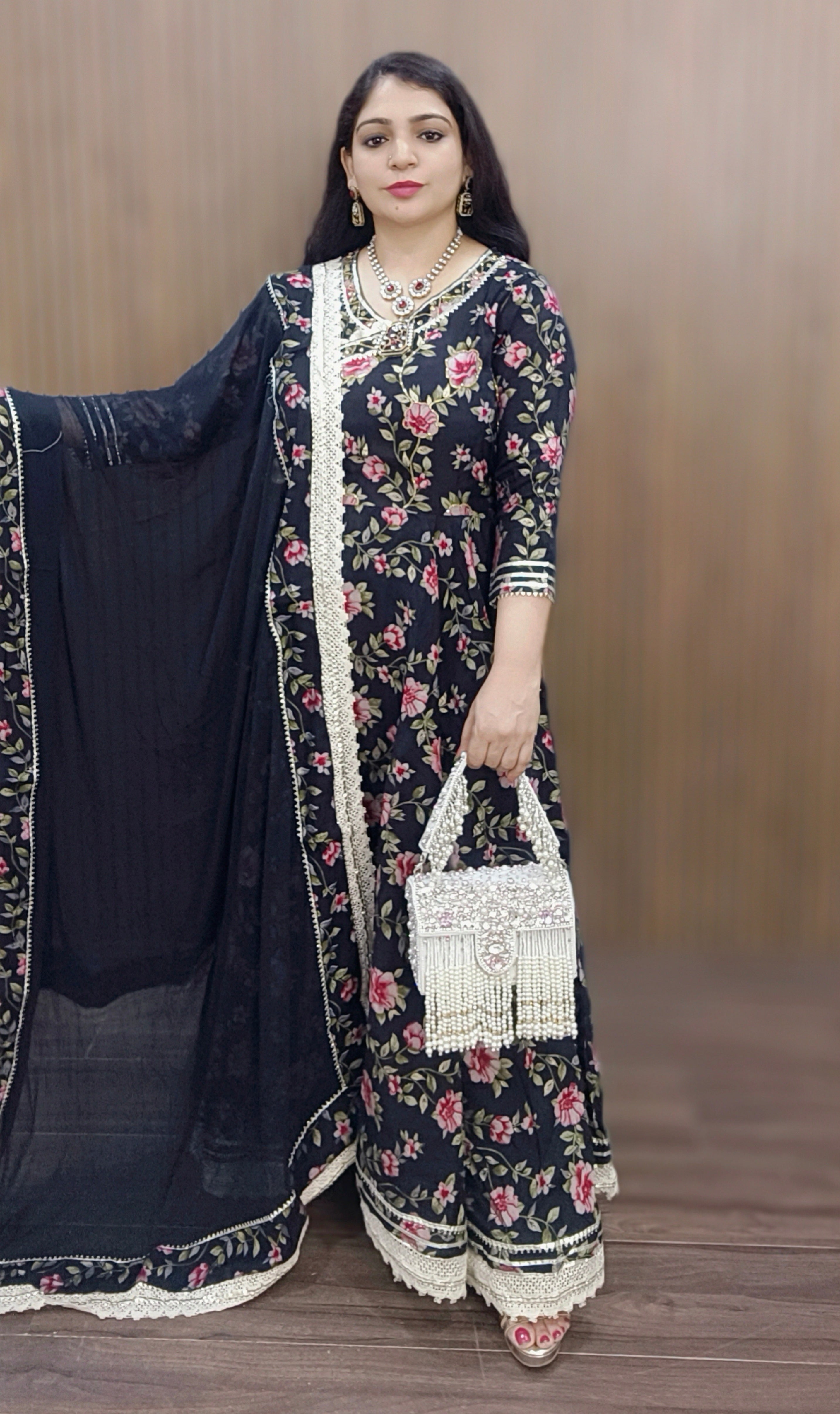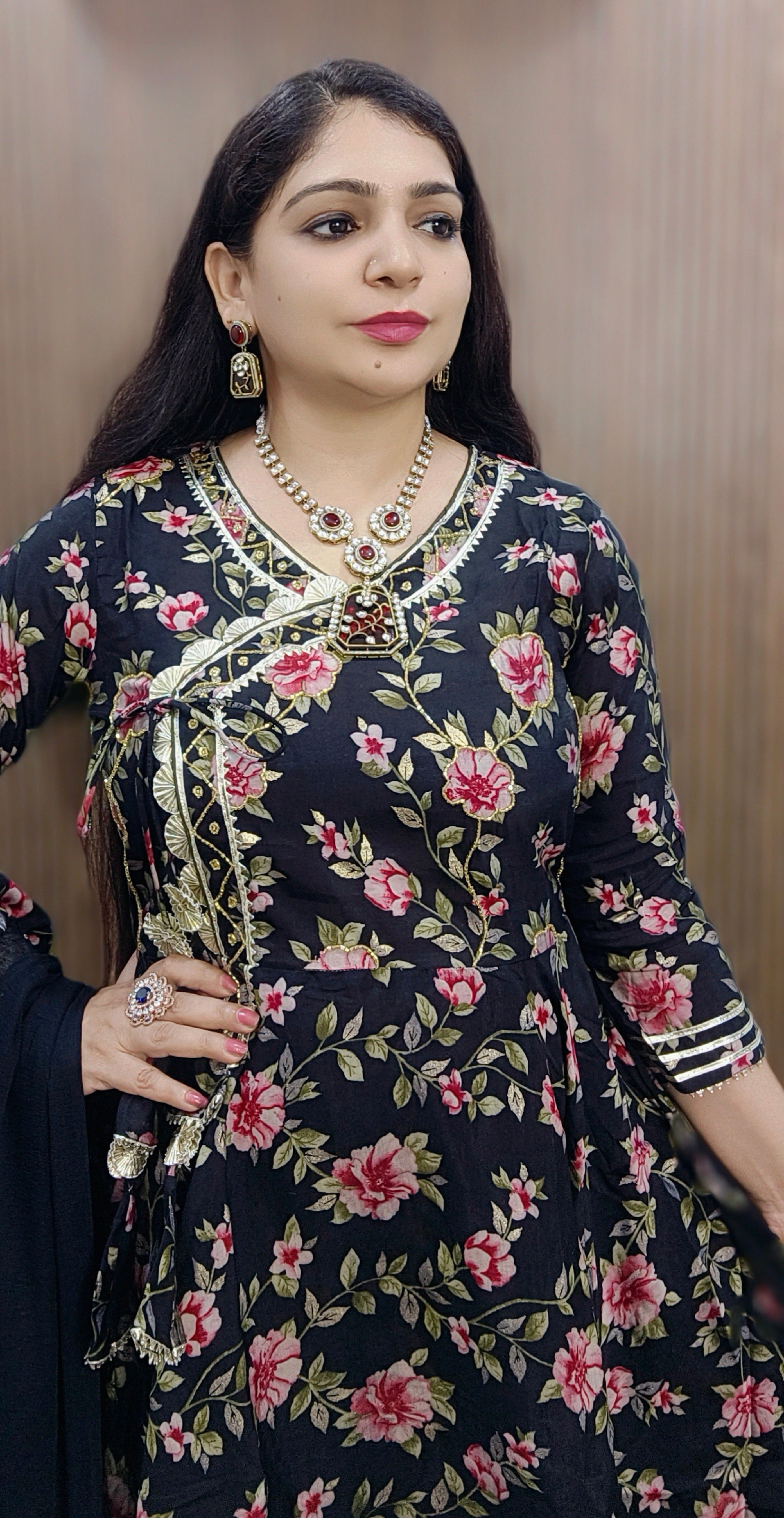 BLACK & MAROON MUSLIN FLORAL ANGRAKHA FLAIRED ANARKALI