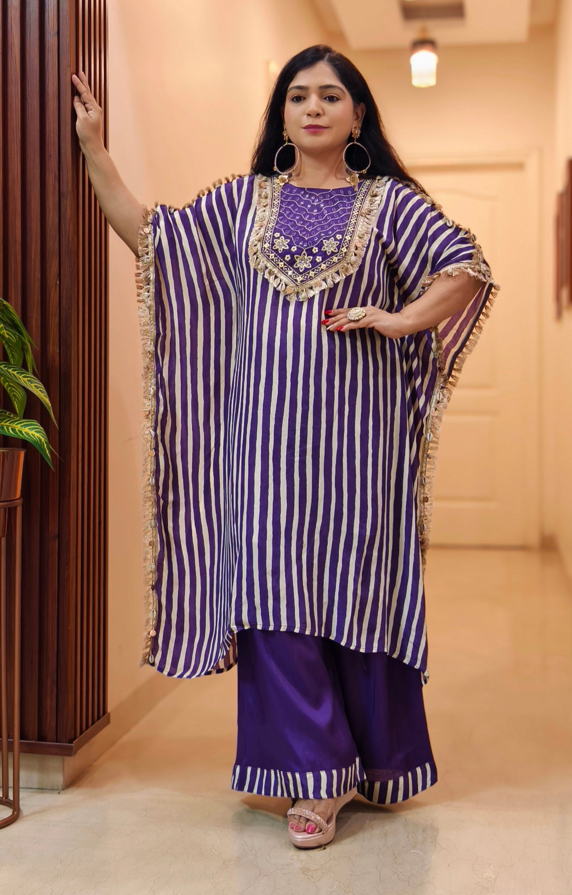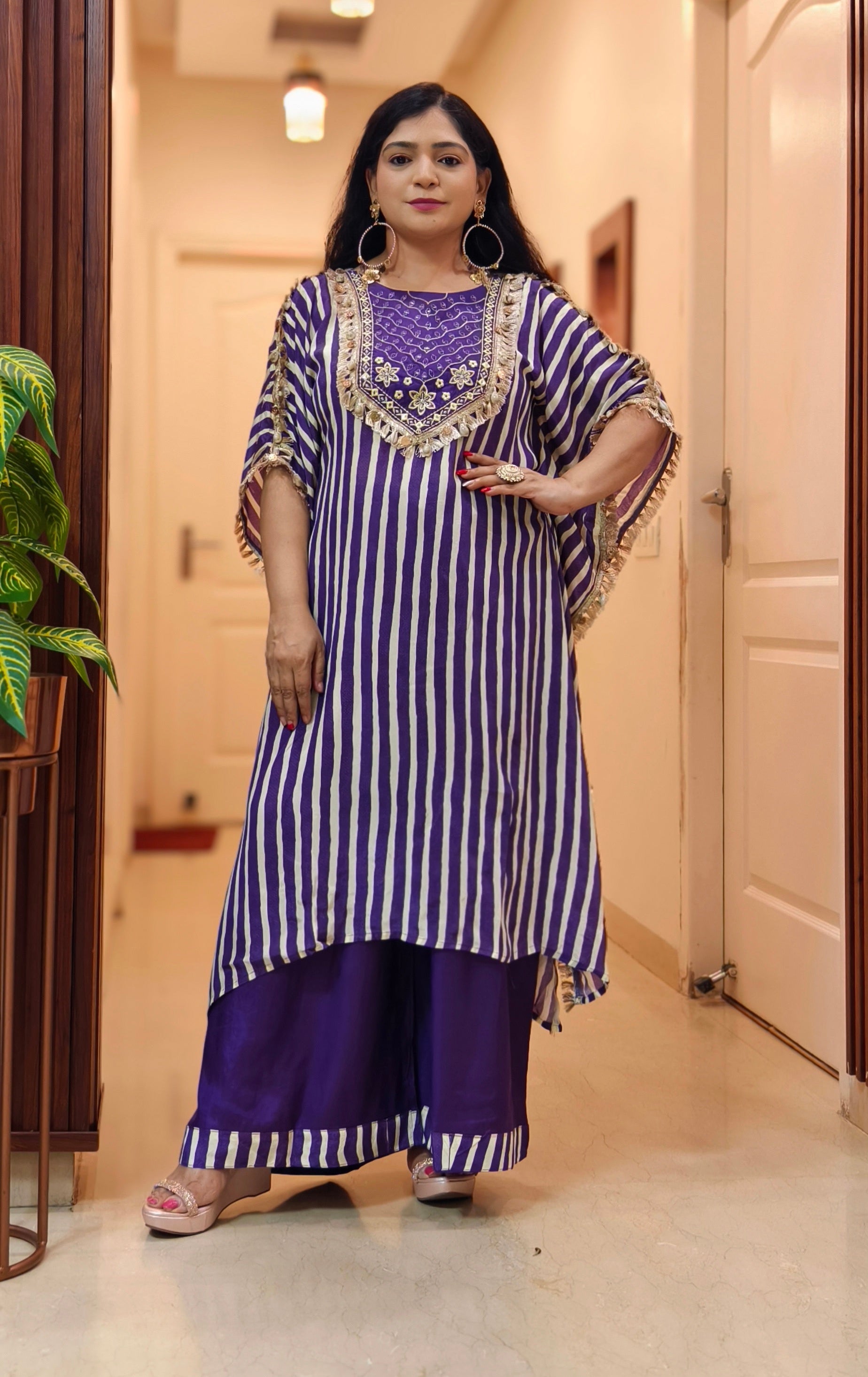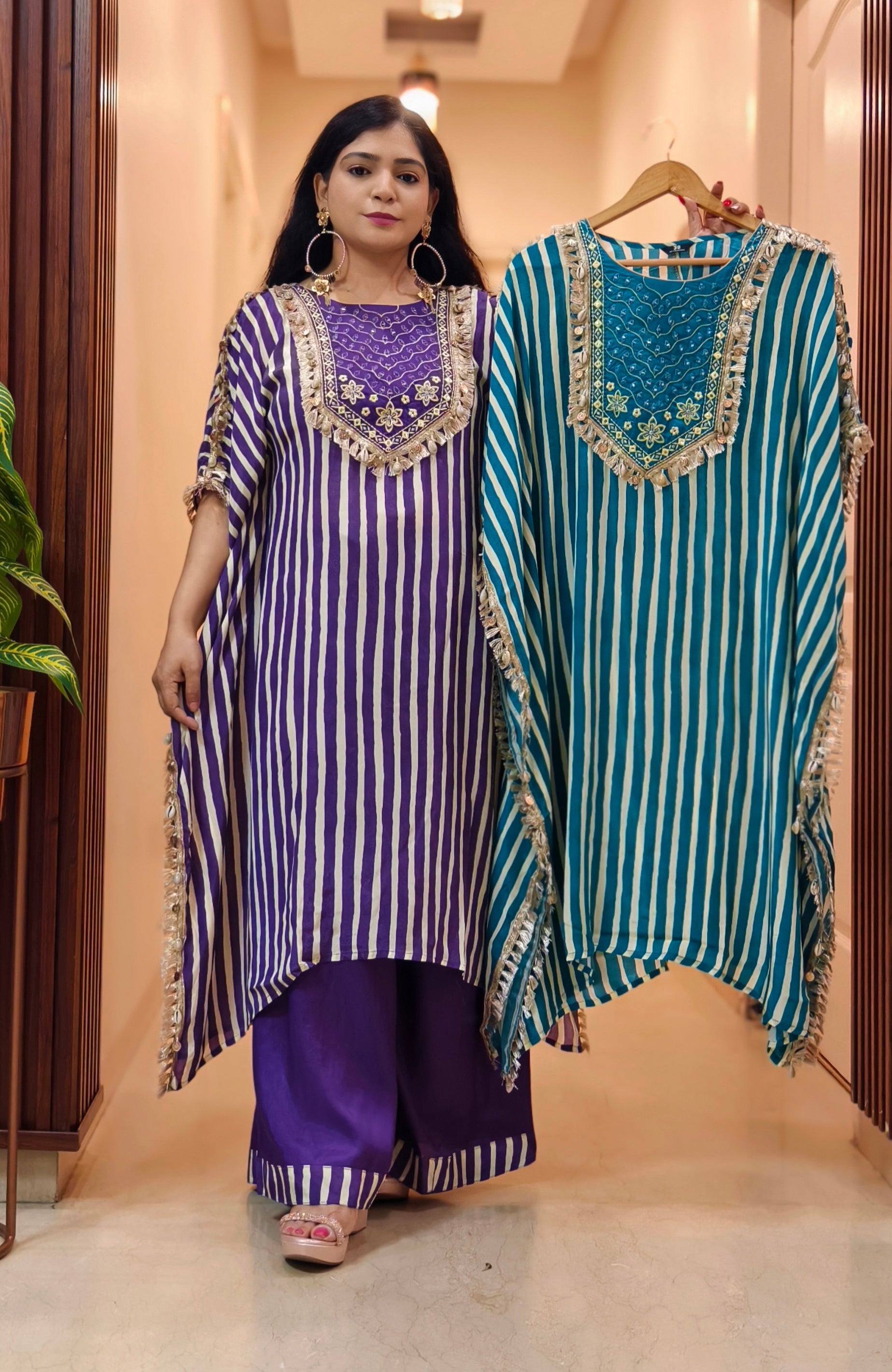 A must have PURPLE AND FIROZI PREMIUM CREPE DESIGNER PARTY WEAR KAFTAN WITH FULL HANDWORK AND PLAZO in your wardrobe.