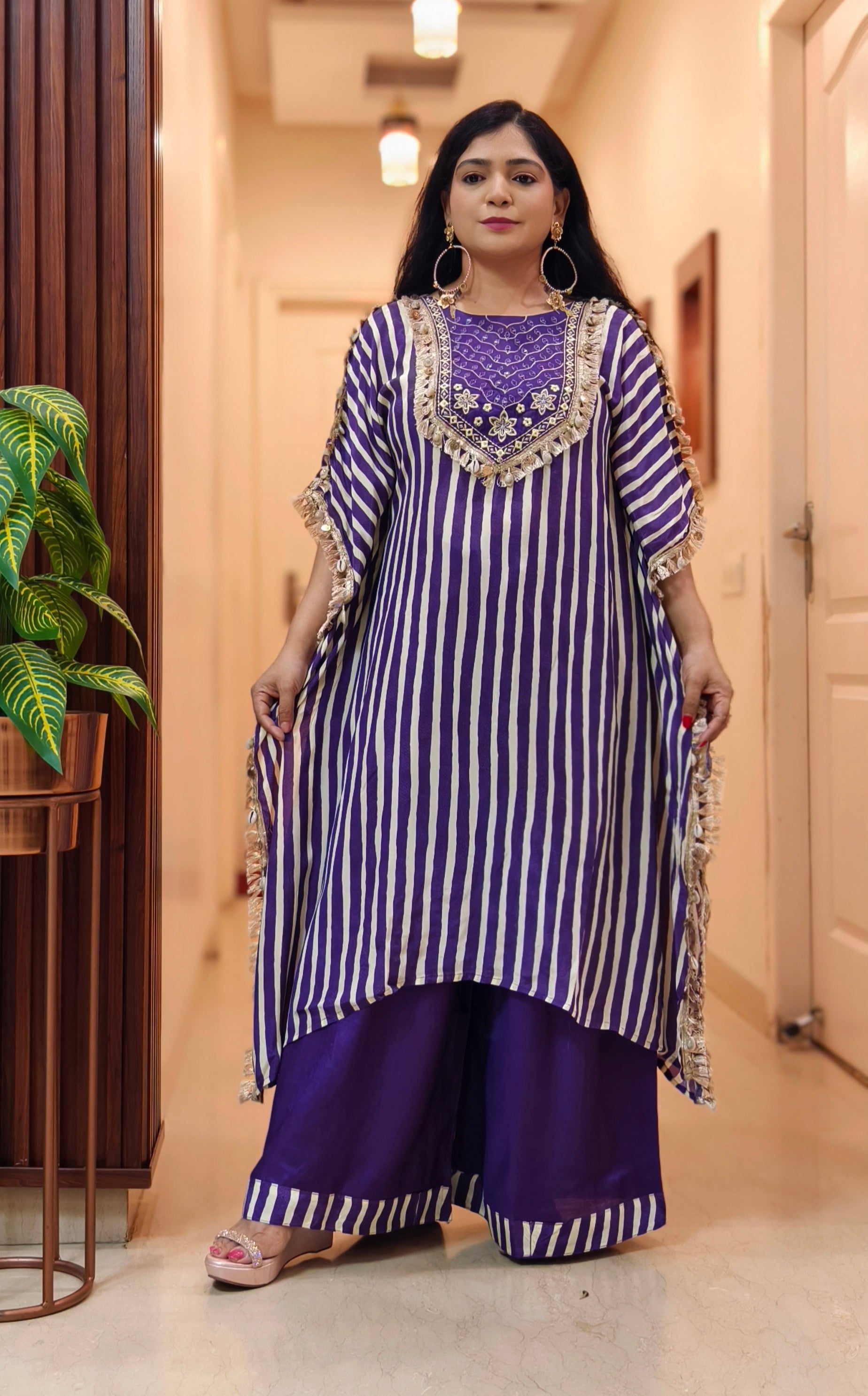 PURPLE AND FIROZI PREMIUM CREPE DESIGNER PARTY WEAR KAFTAN WITH FULL HANDWORK AND PLAZO