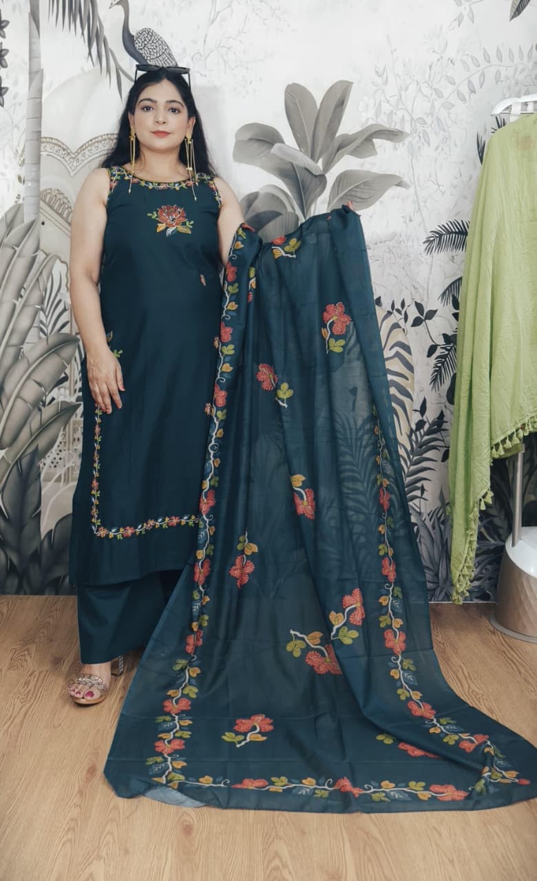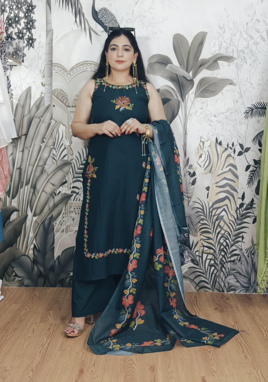 BLUE AND GREEN COTTON SLEEVELESS SUIT WITH EMBROIDERY WORK AND SLEEVES INSIDE