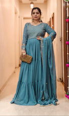 This elegant BLUE AND PURPLE GEORGETTE FLAIRED GOWN WITH DUPATTA features intricate floral embroidery, adding a touch of sophistication to your wardrobe. The suit comes with a matching dupatta, completing the look with a cohesive and stylish ensemble. Perfect for special occasions or formal events, this outfit is sure to make a statement and turn heads wherever you go.