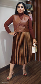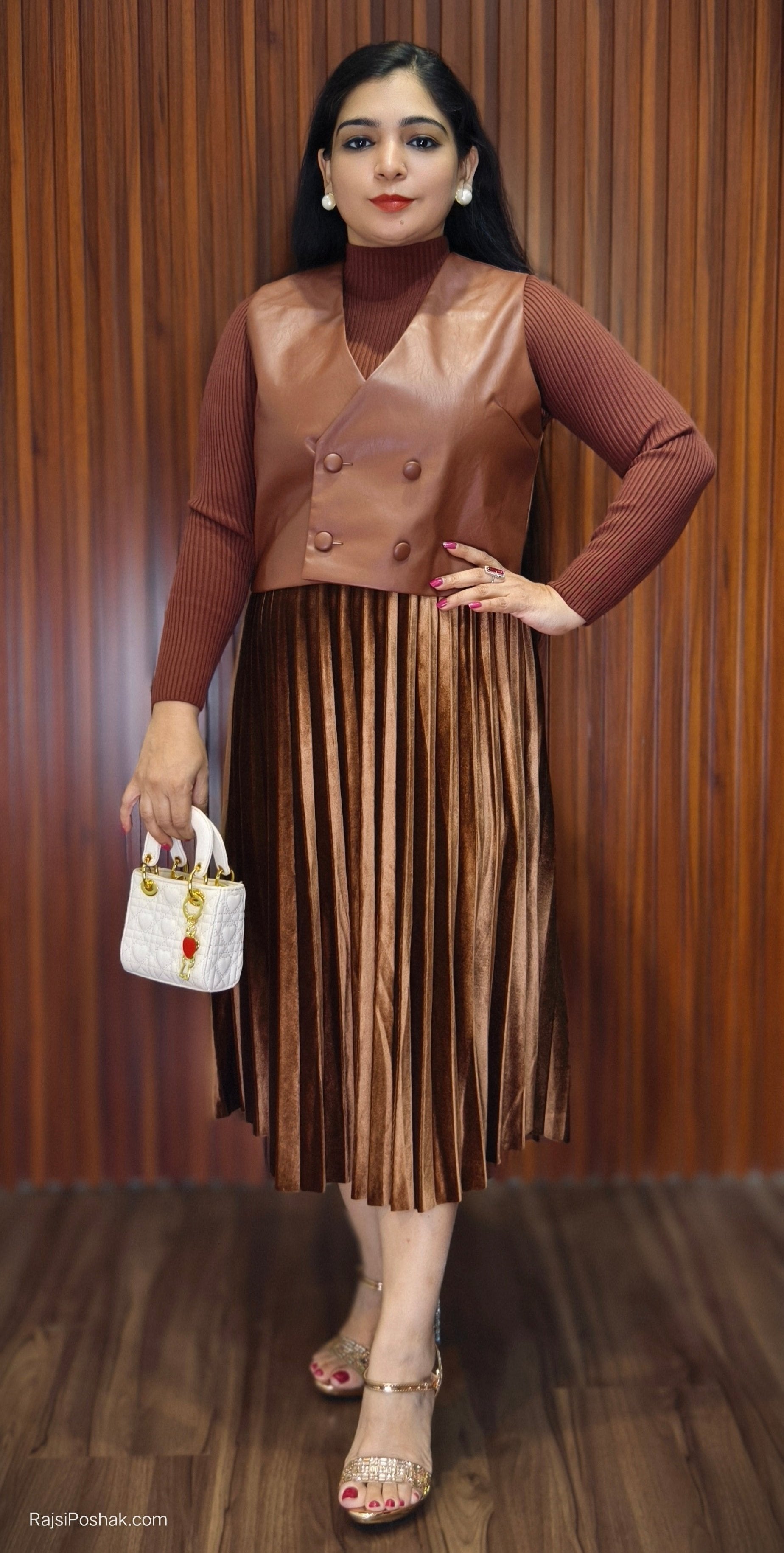 This Chic Winter Party Long Dress features a stylish LEATHER JACKET, perfect for holiday gatherings and special occasions. The set includes a flattering skirt, a coordinating top, and a matching outer layer, all crafted from soft, high-quality knit fabric and attached Velvet Skirt . The elegant design offers both comfort and sophistication, keeping you warm while maintaining a fashionable look. Whether you're attending a winter party or a formal event, this versatile set ensures you'll stand out with its timeless, polished aesthetic.