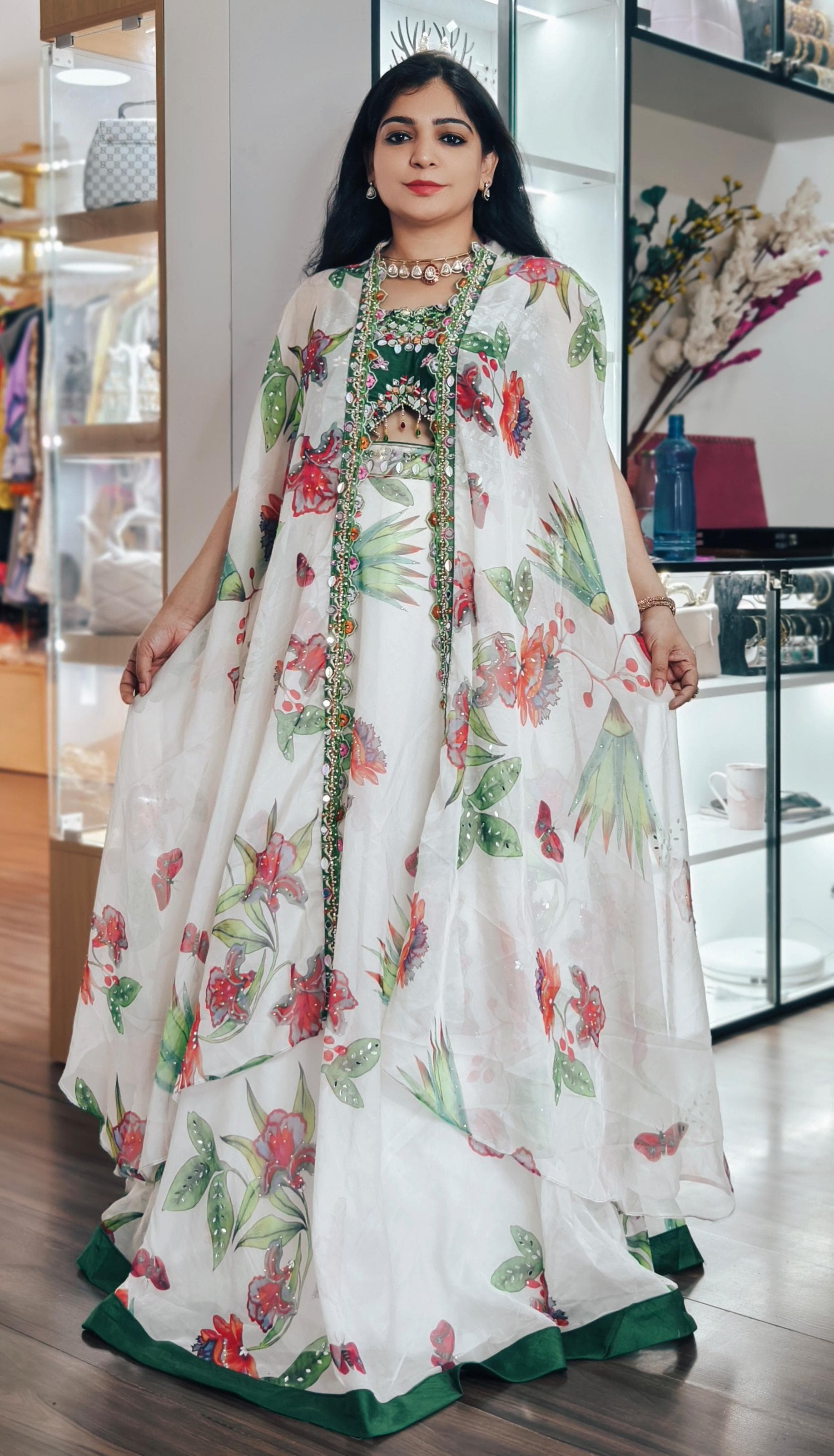 EMERALD GREEN & WHITE FLORAL ORGANZA CAPE LEHENGA