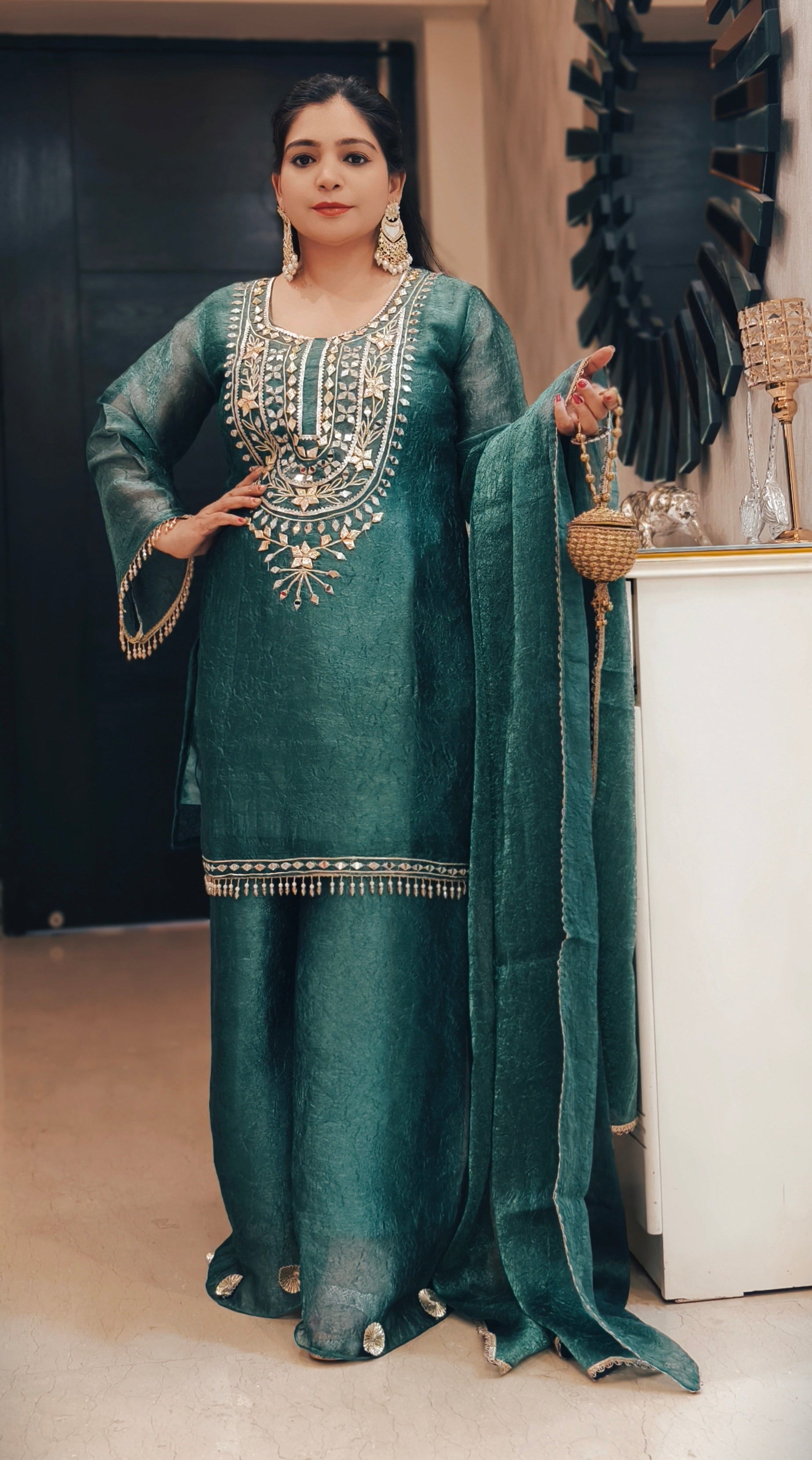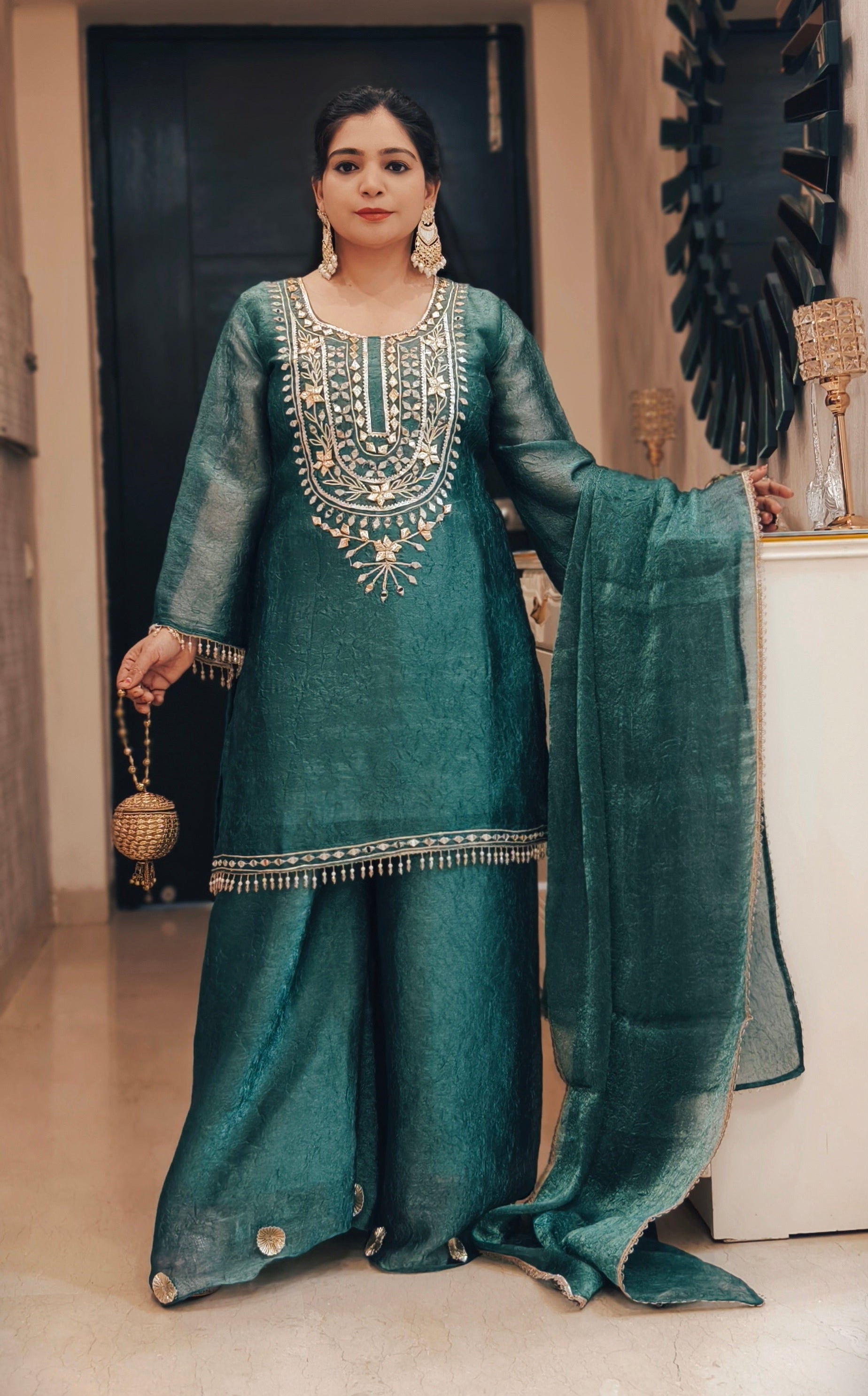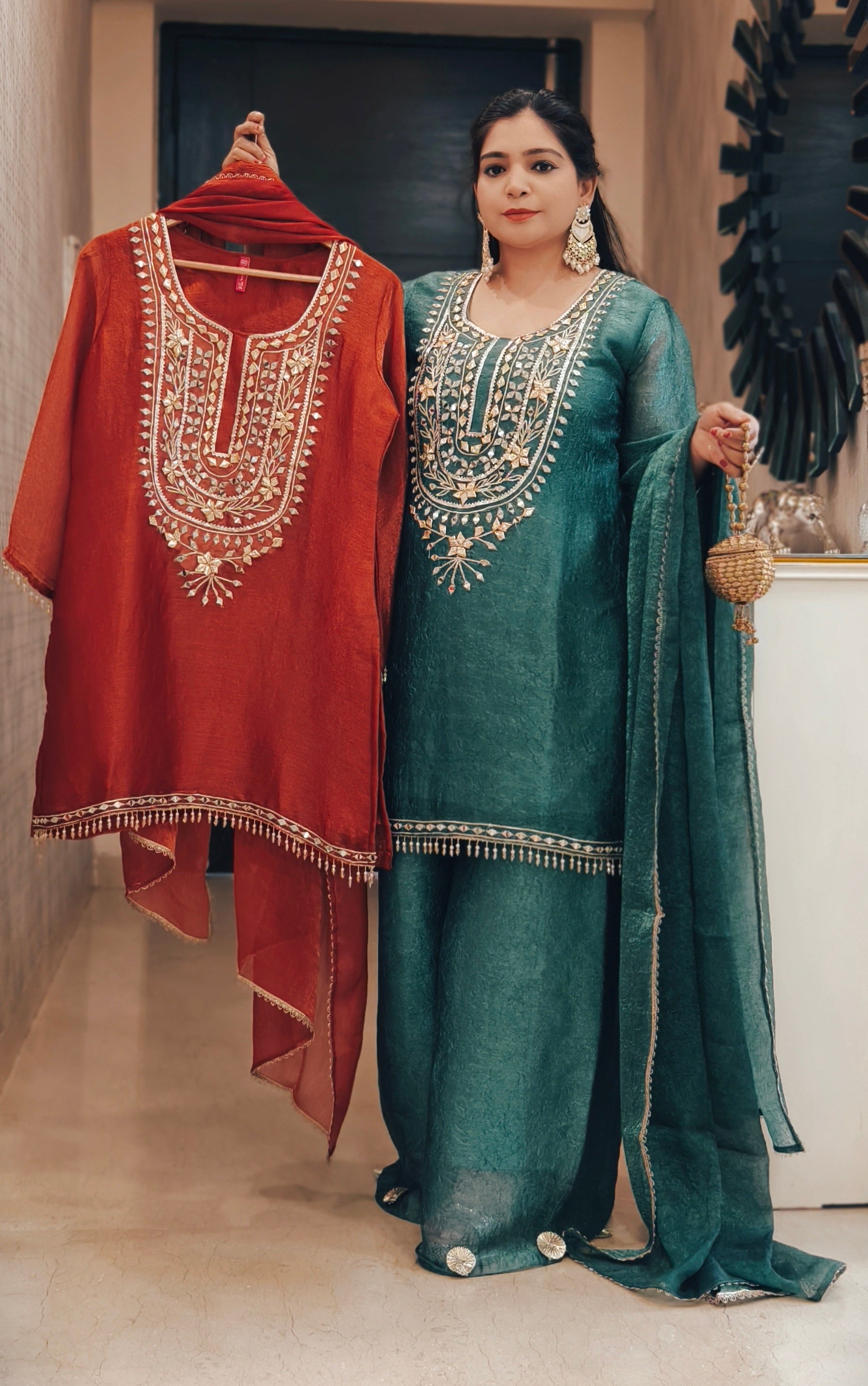 A must have FIROZI AND ORANGE PARTY WEAR TISSUE FABRIC SUIT WITH PLAZO in your wardrobe.Perfect for any occasion in this Summer Season