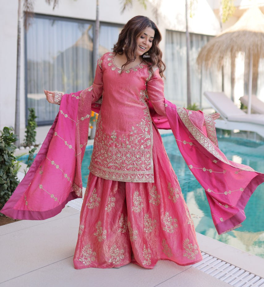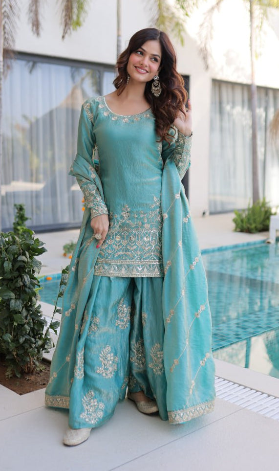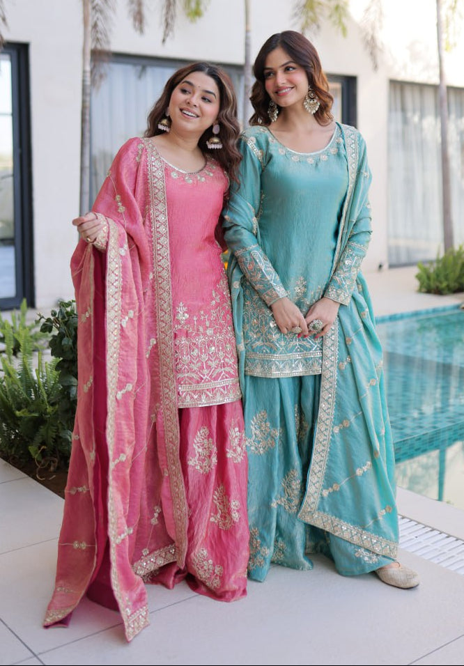 FIROZI AND PINK SHARARA SUIT WITH ZARI AND SEQUENCE WORK AND FULL LINING