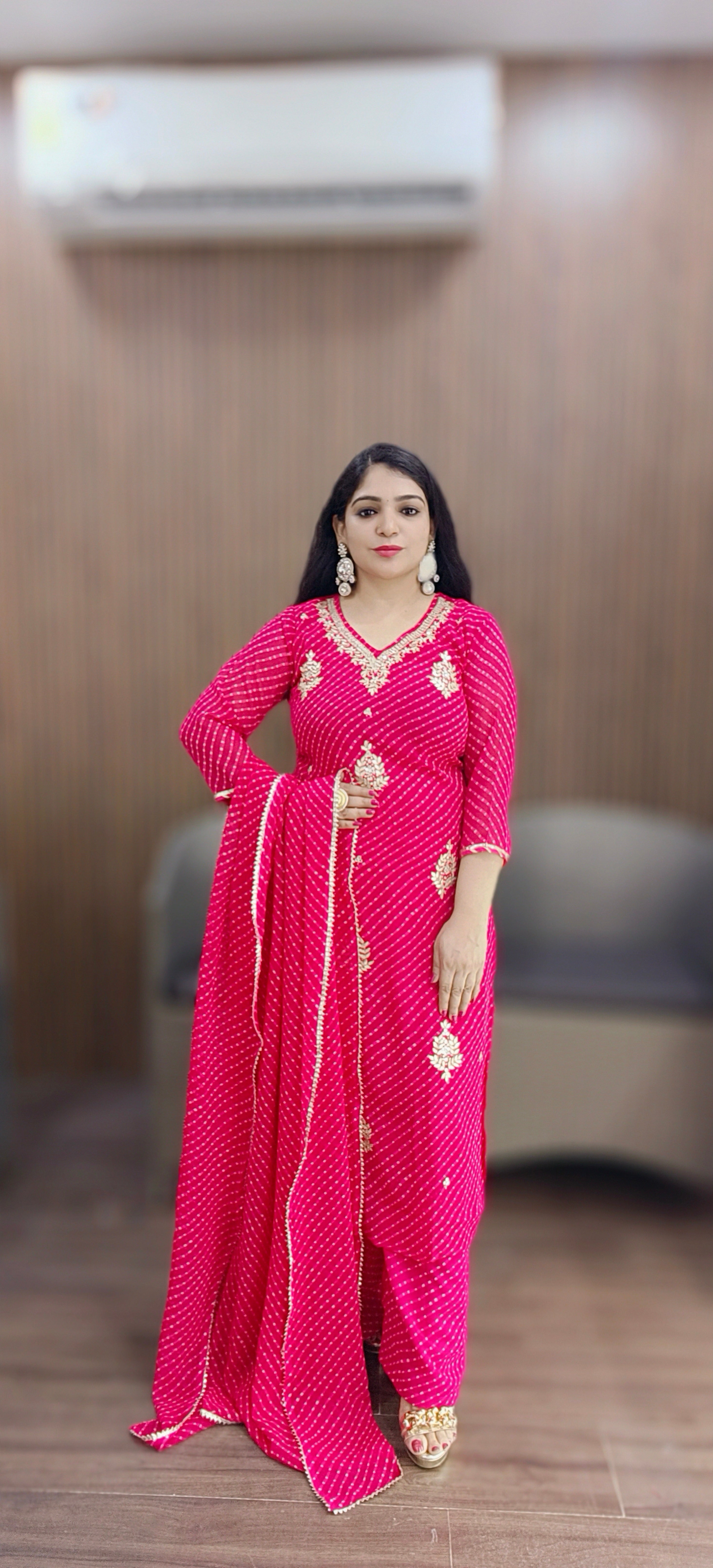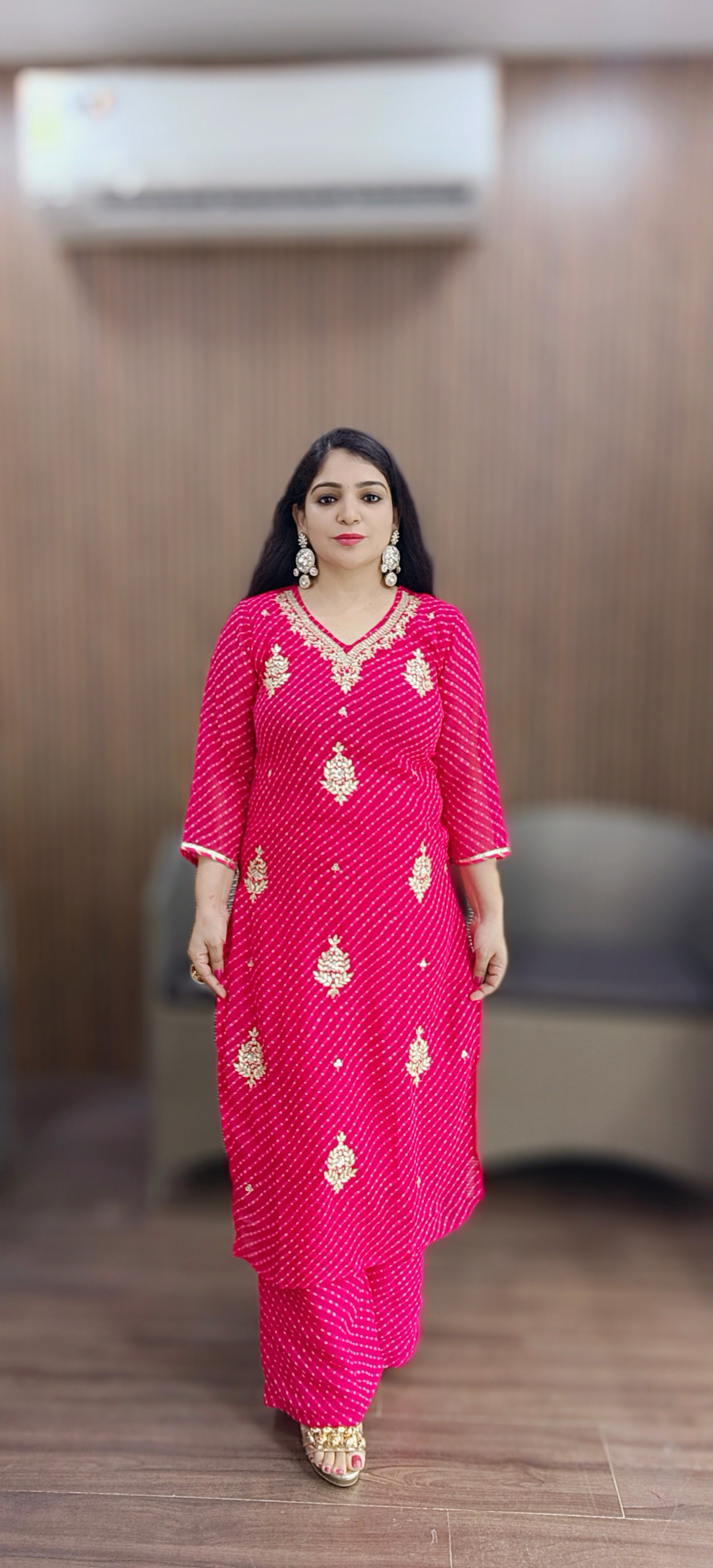 HOT PINK PURE GEORGETTE LEHERIYA SUIT WITH PLAZO AND FULL LINING