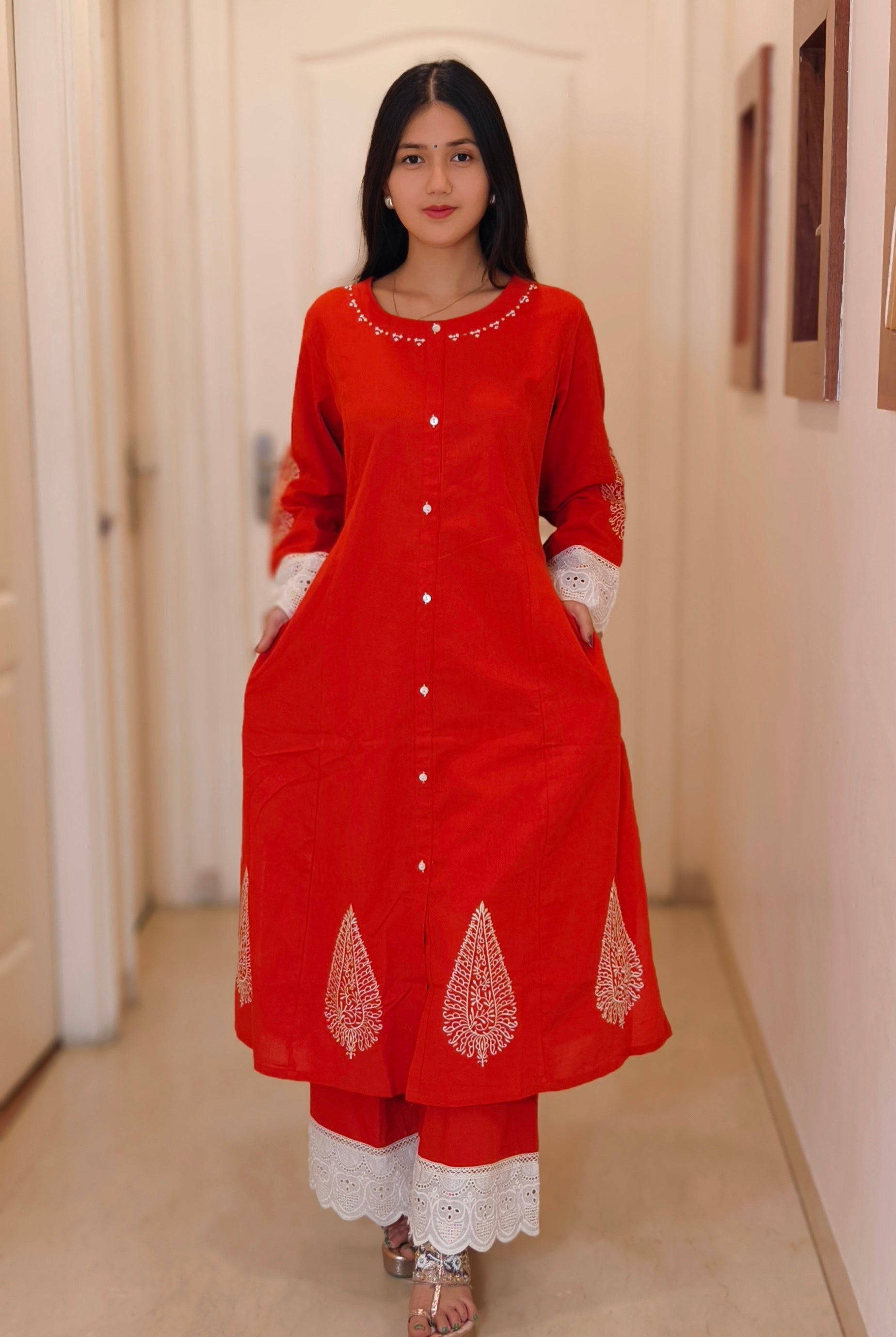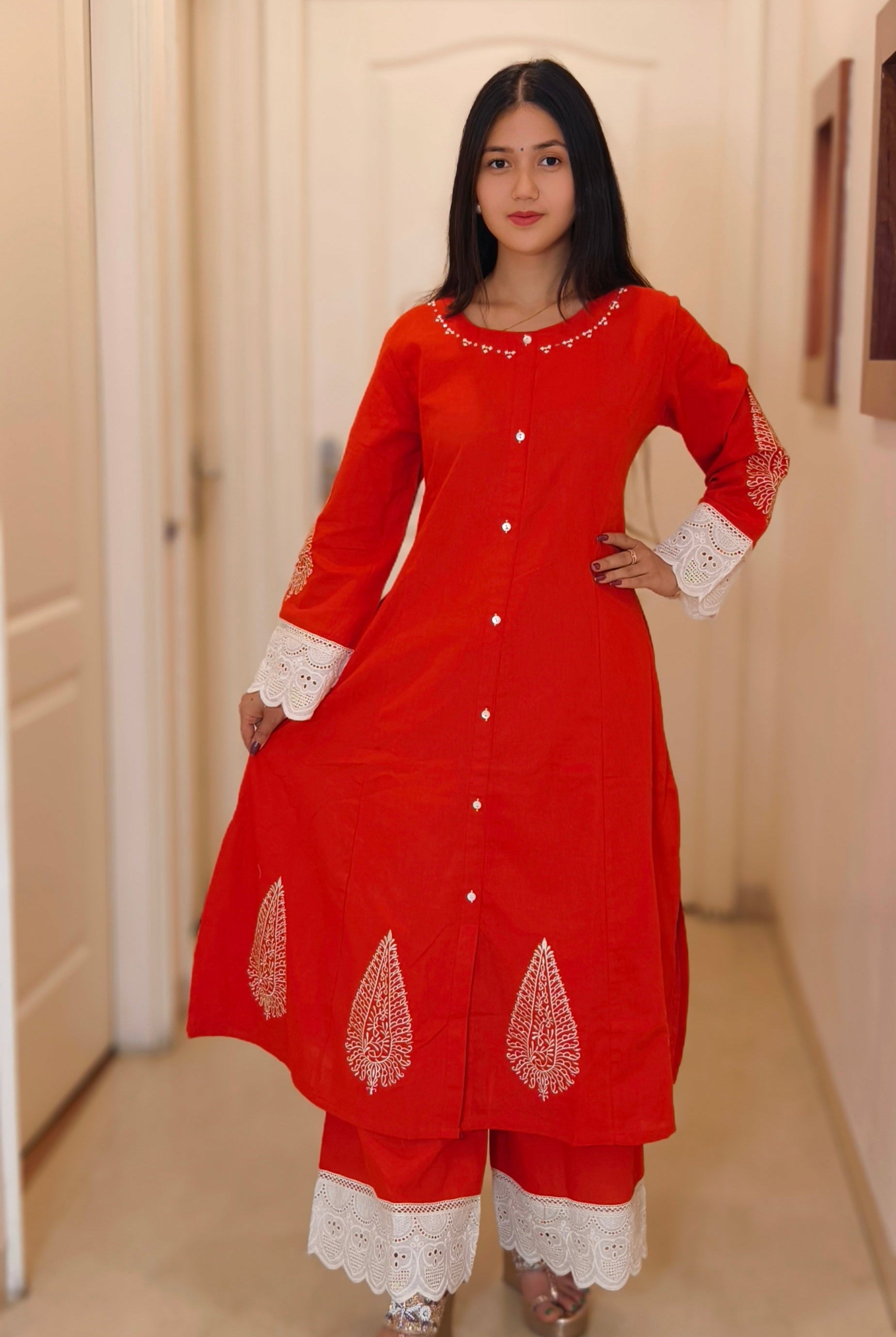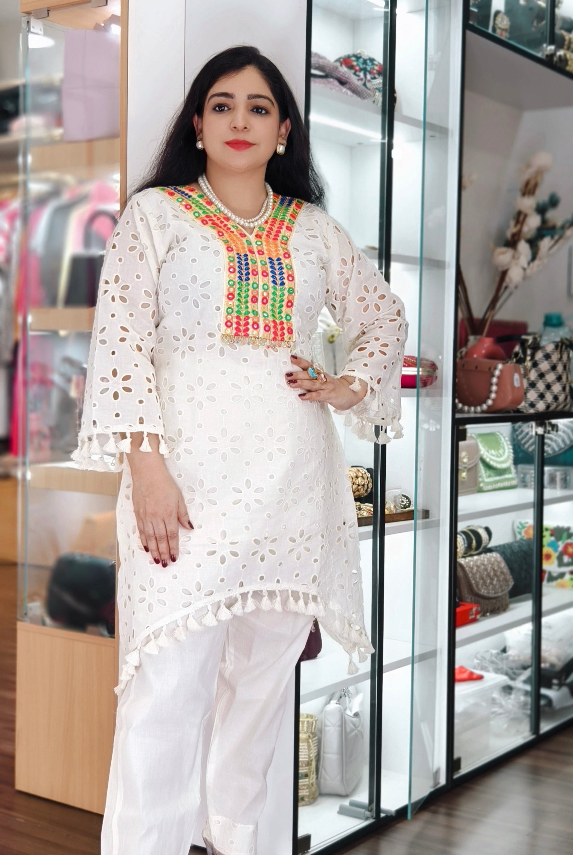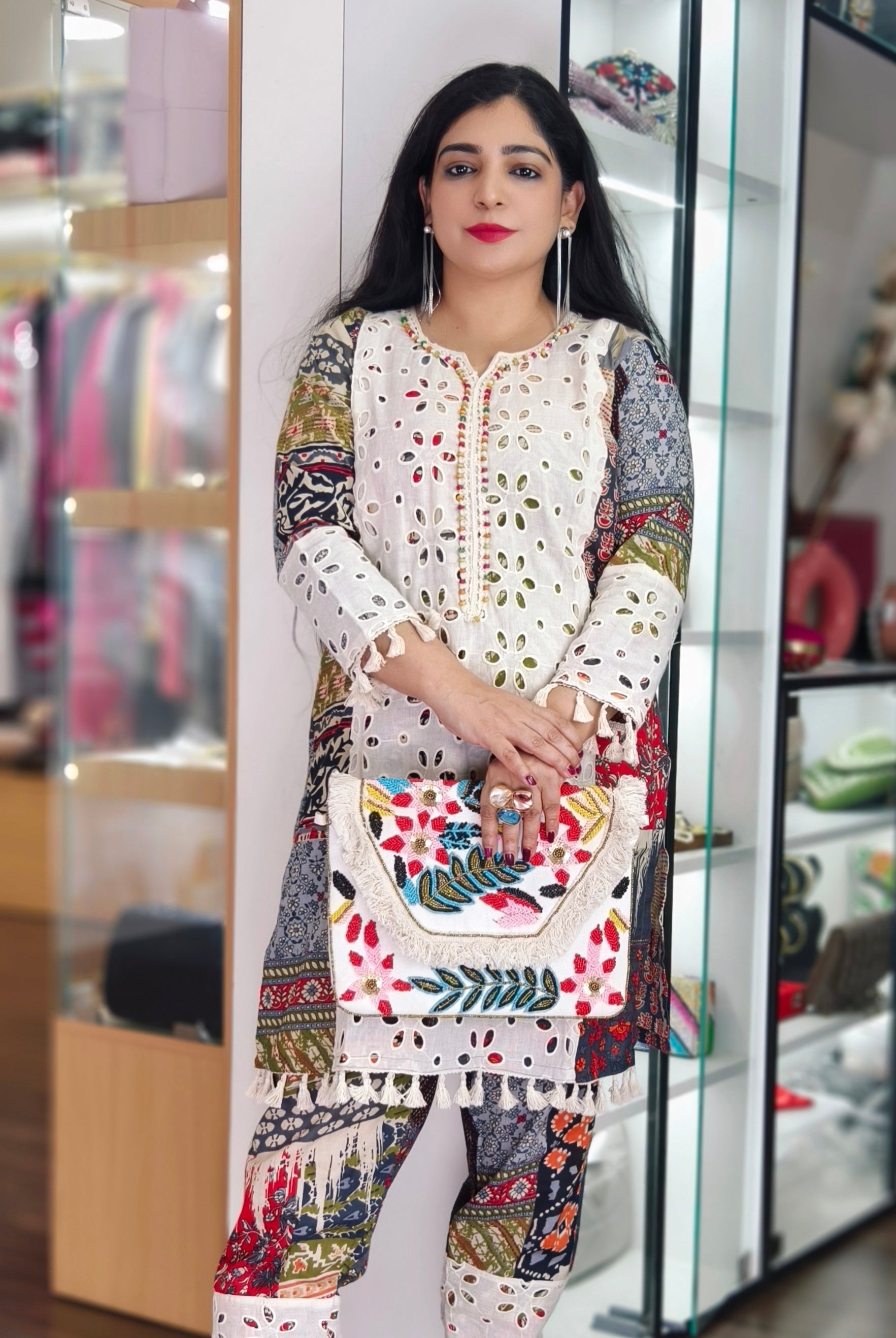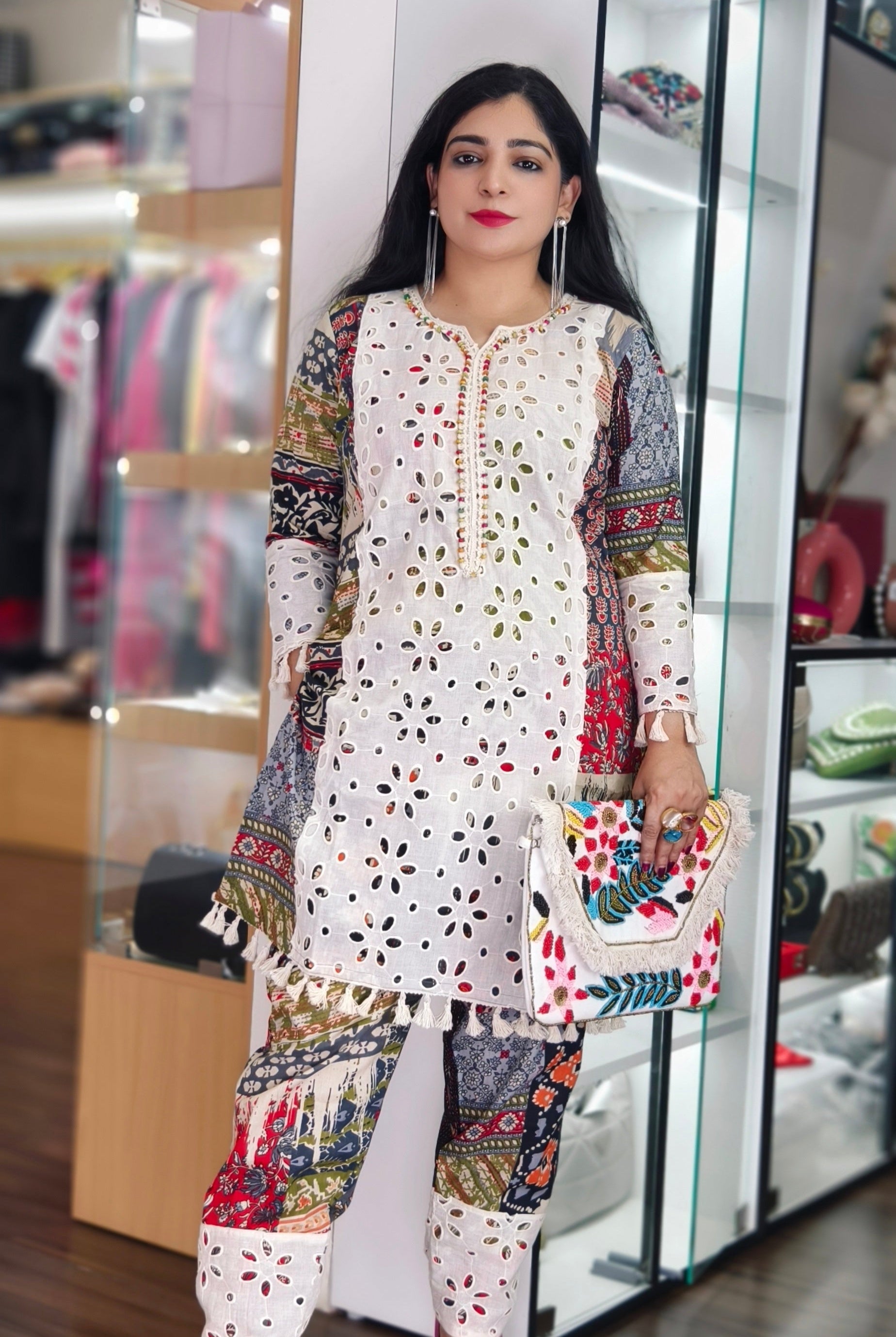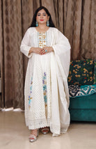 A IVORY SHIFALI COTTON ANARKALI WITH COTTON DUPATTA is a perfect blend of elegance and comfort. The outfit features a soft, breathable cotton fabric, offering all-day comfort while maintaining a refined look. The adds a modern twist to the traditional Anarkali silhouette, enhancing its flow and movement. The delicate around the edges provide a feminine, intricate touch, elevating the overall design. Paired with matching afghani pants, this ensemble combines traditional elements with contemporary style, making it ideal for casual outings, festive events, or semi-formal occasions.