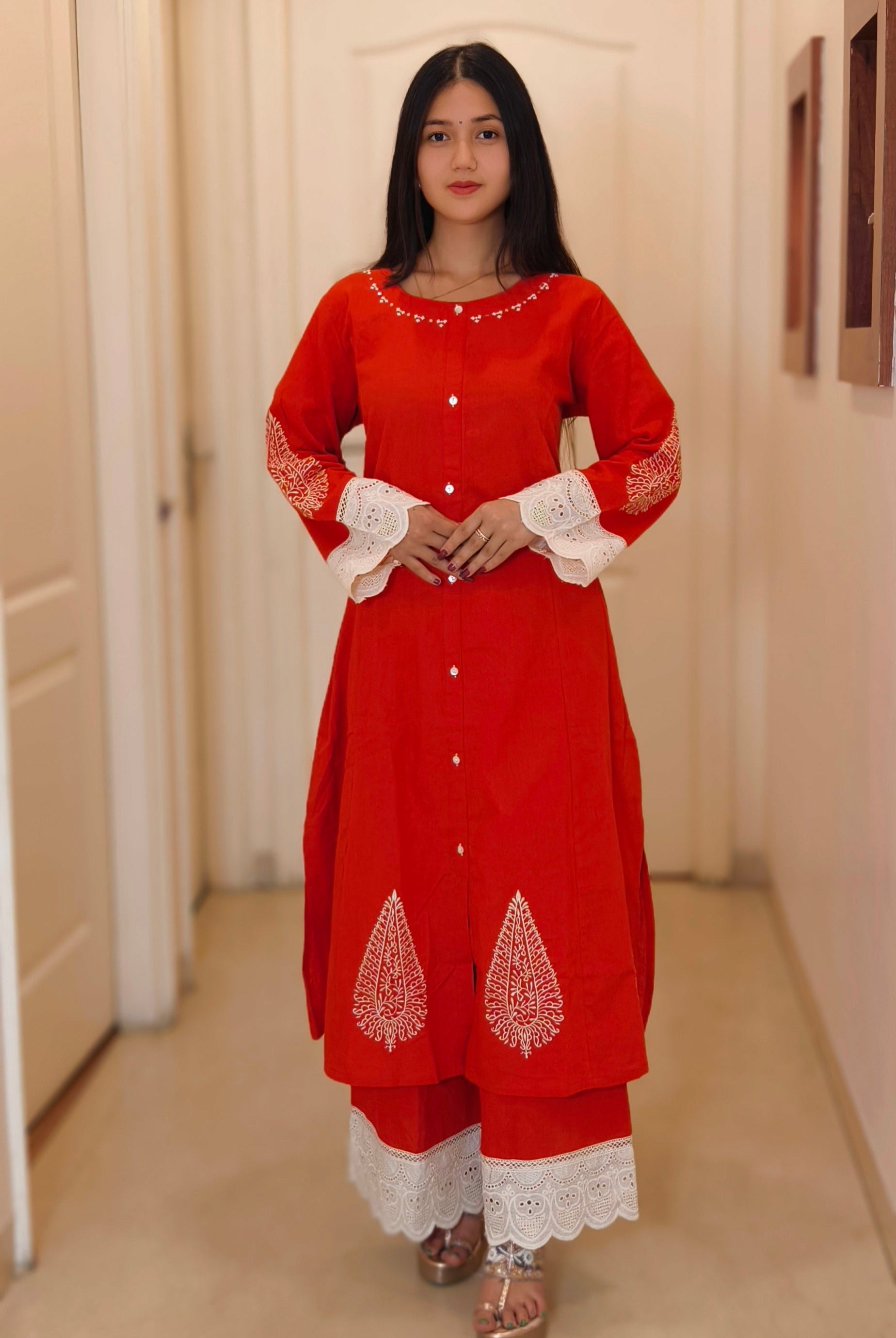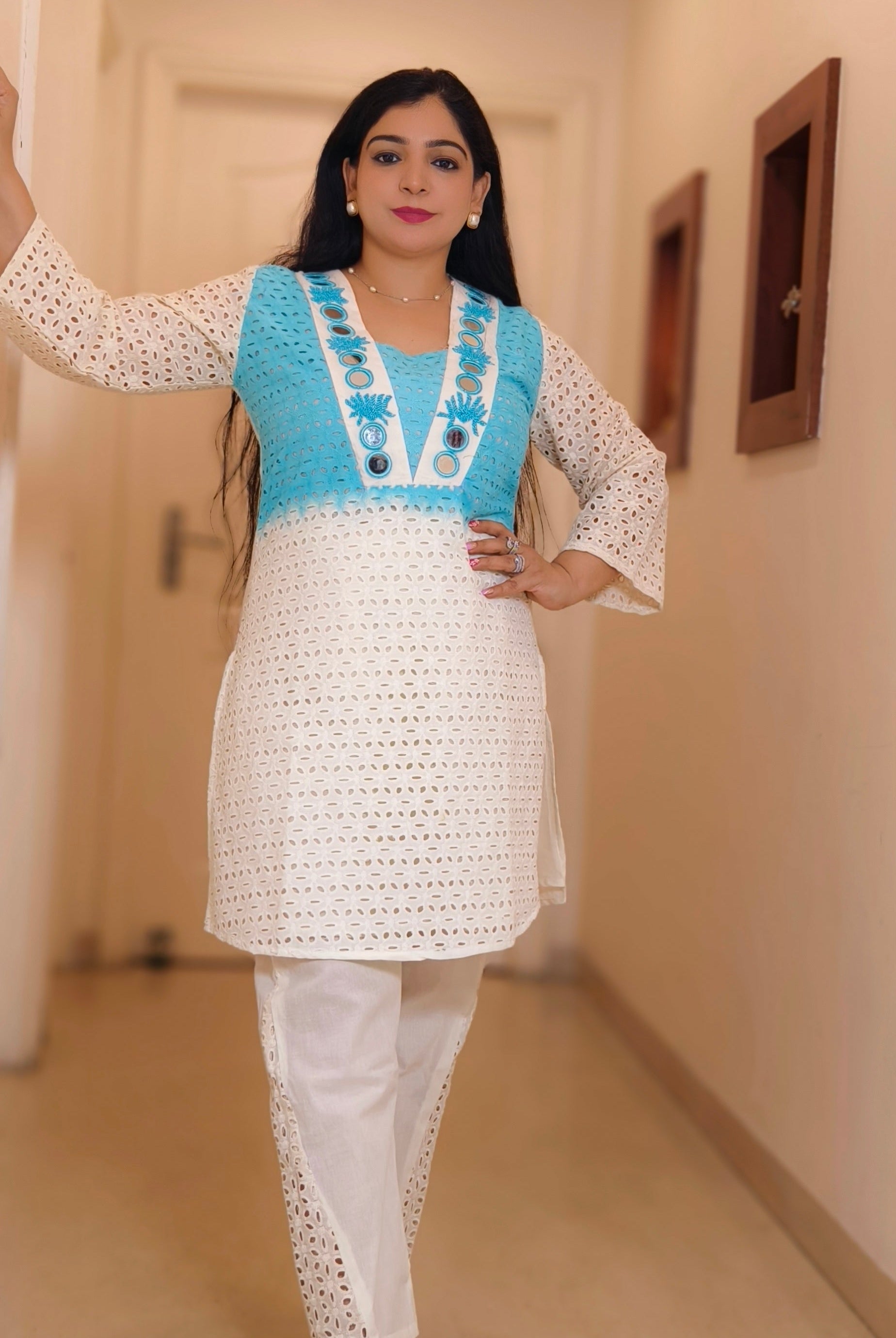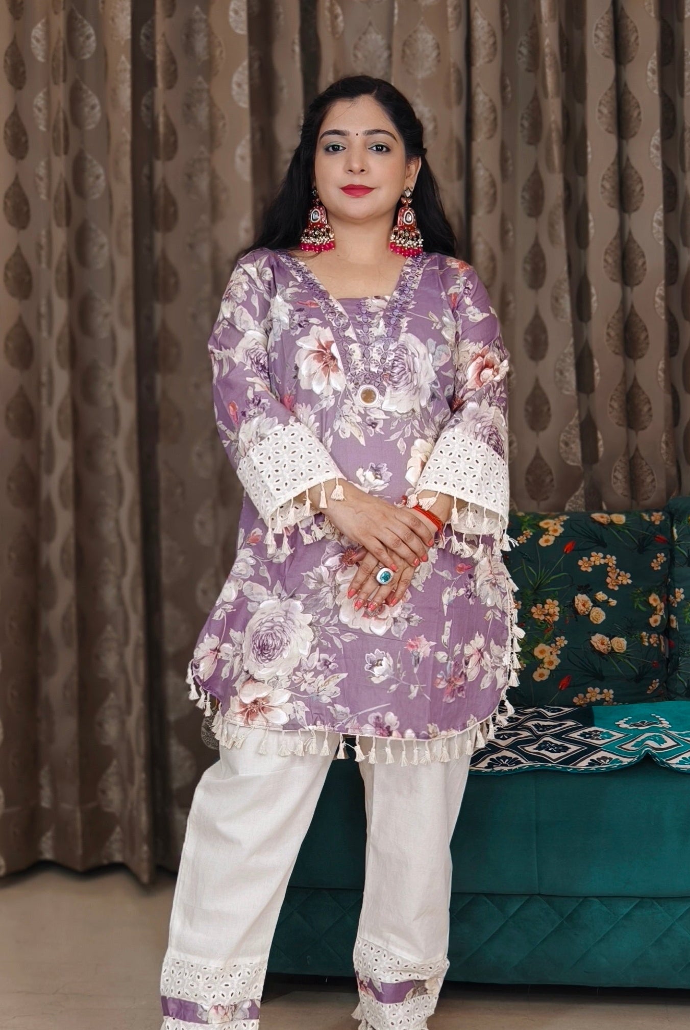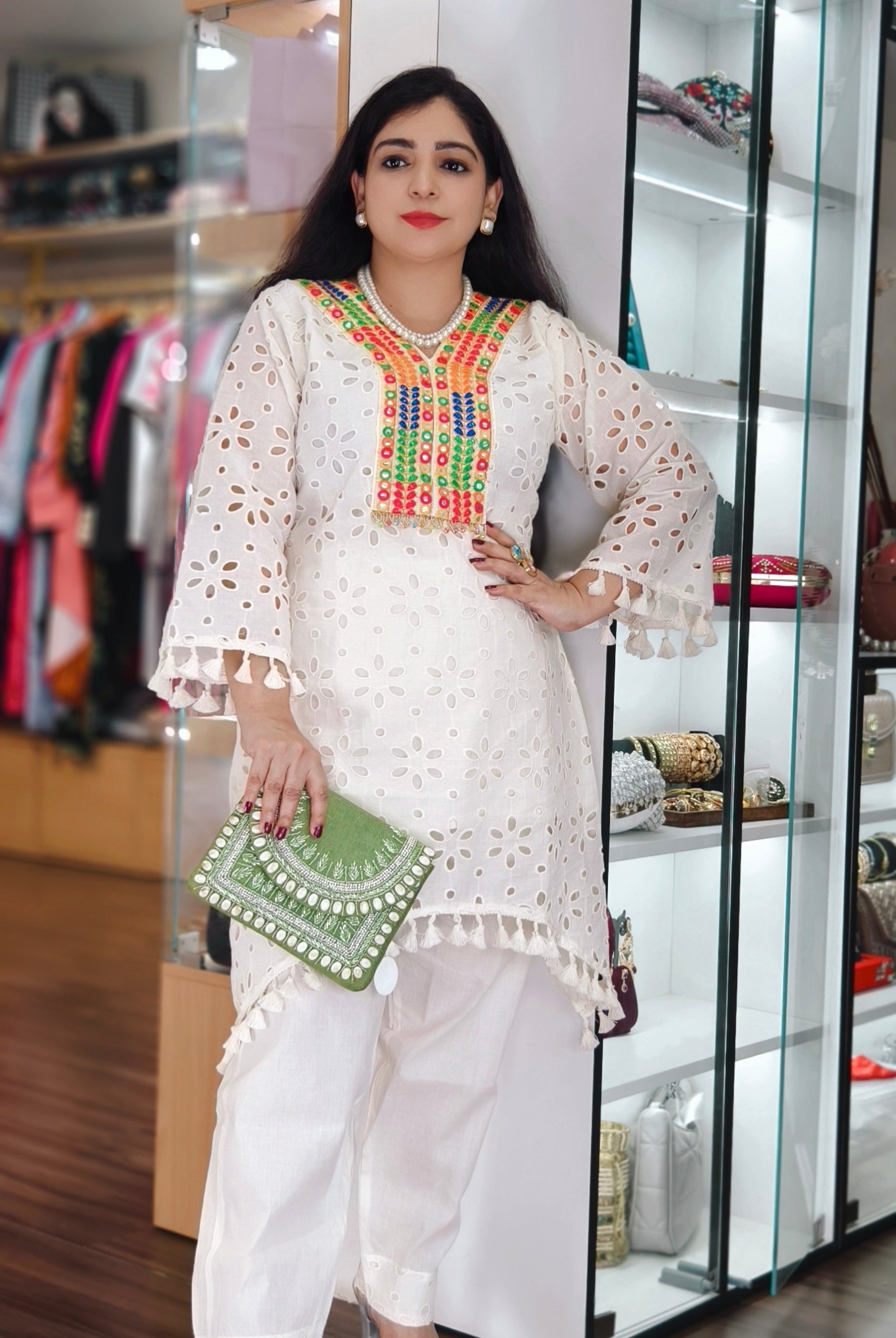 A IVORY SHIFALI COTTON ANARKALI WITH COTTON DUPATTA is a perfect blend of elegance and comfort. The outfit features a soft, breathable cotton fabric, offering all-day comfort while maintaining a refined look. The adds a modern twist to the traditional Anarkali silhouette, enhancing its flow and movement. The delicate around the edges provide a feminine, intricate touch, elevating the overall design. Paired with matching afghani pants, this ensemble combines traditional elements with contemporary style, making it ideal for casual outings, festive events, or semi-formal occasions.