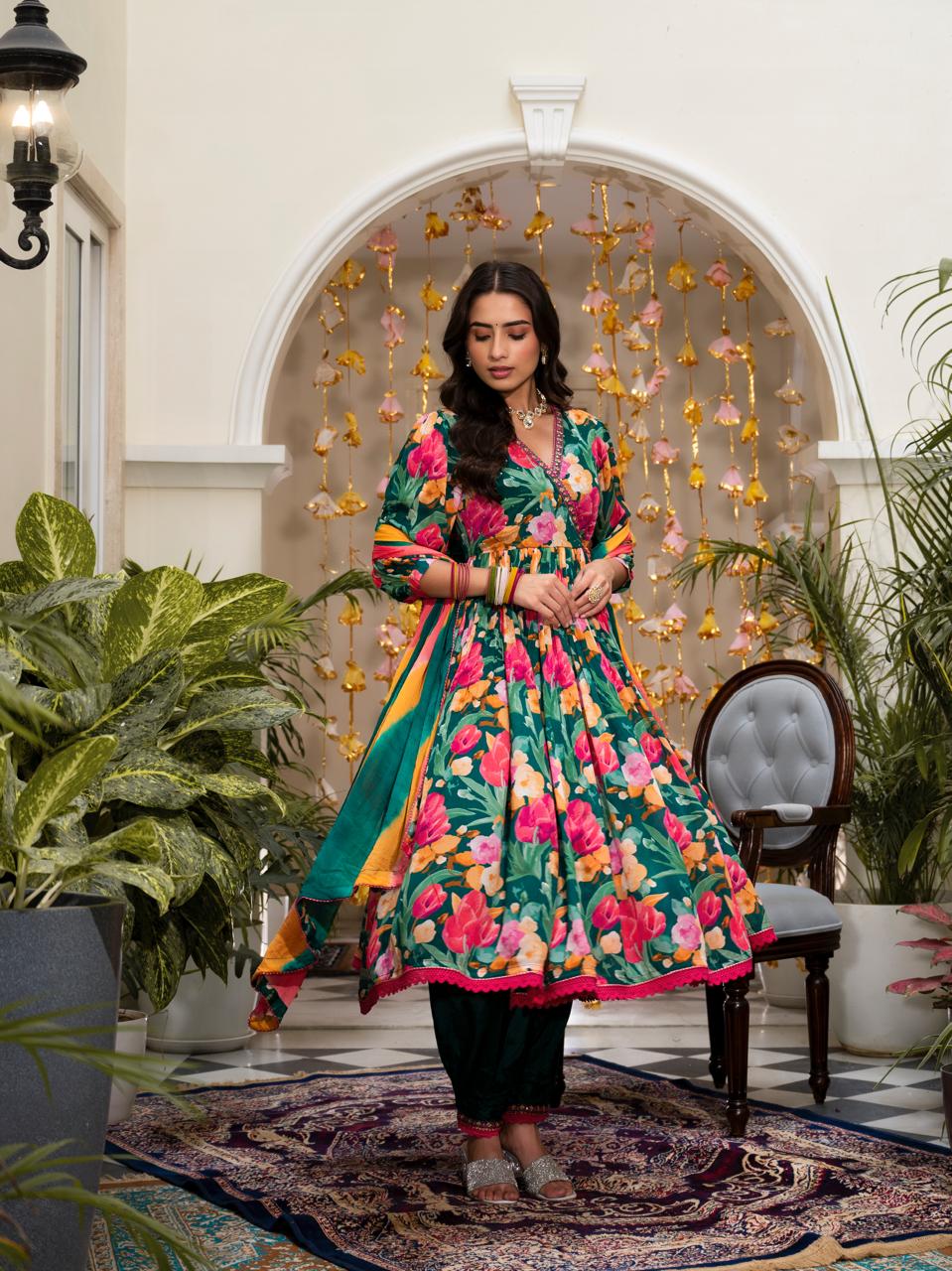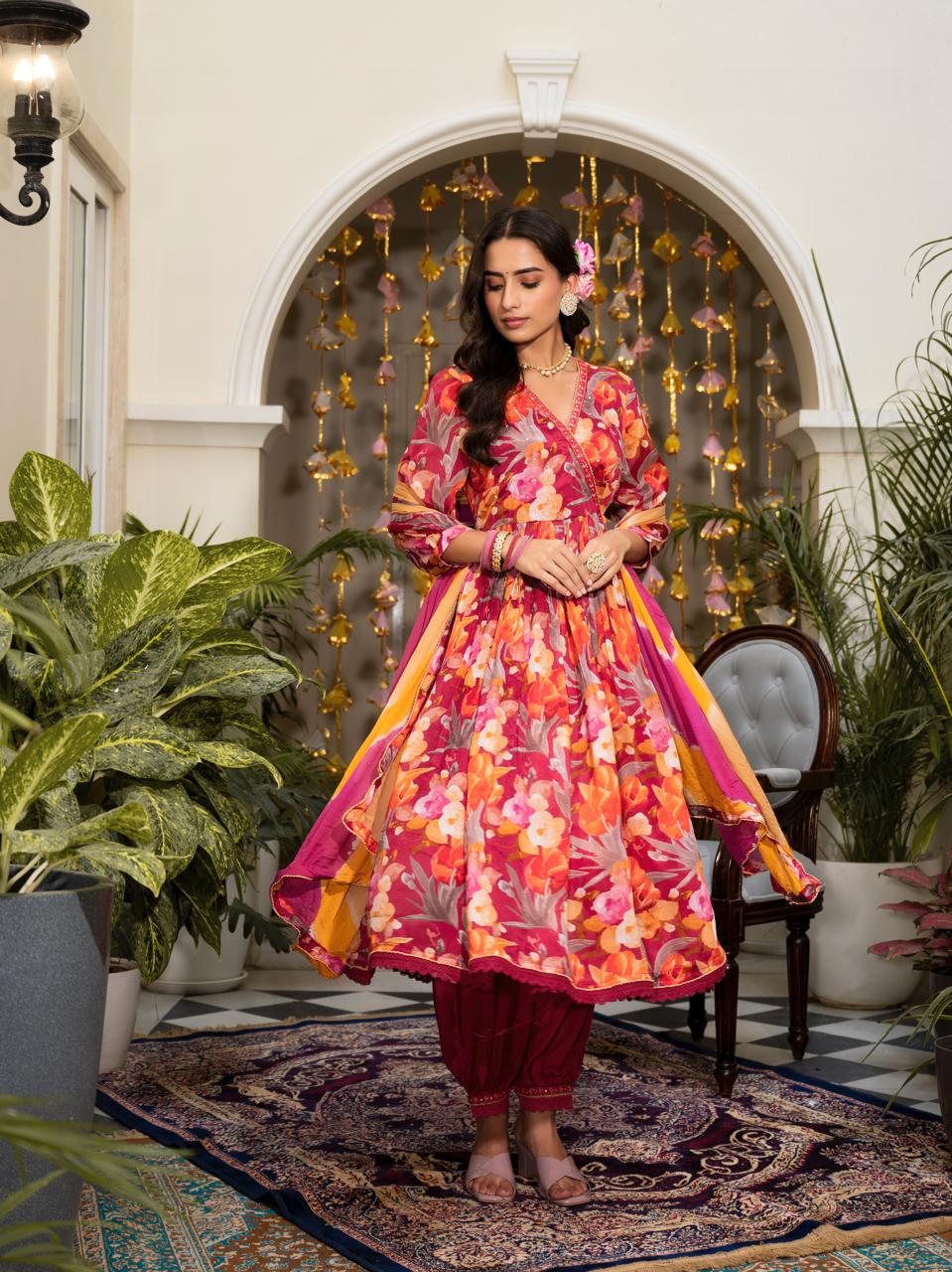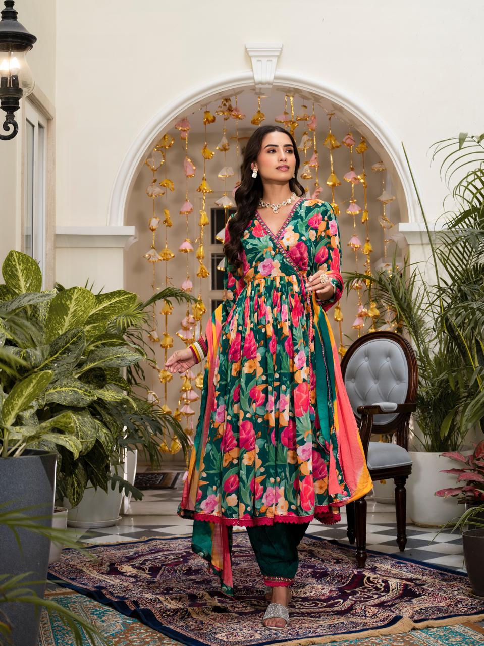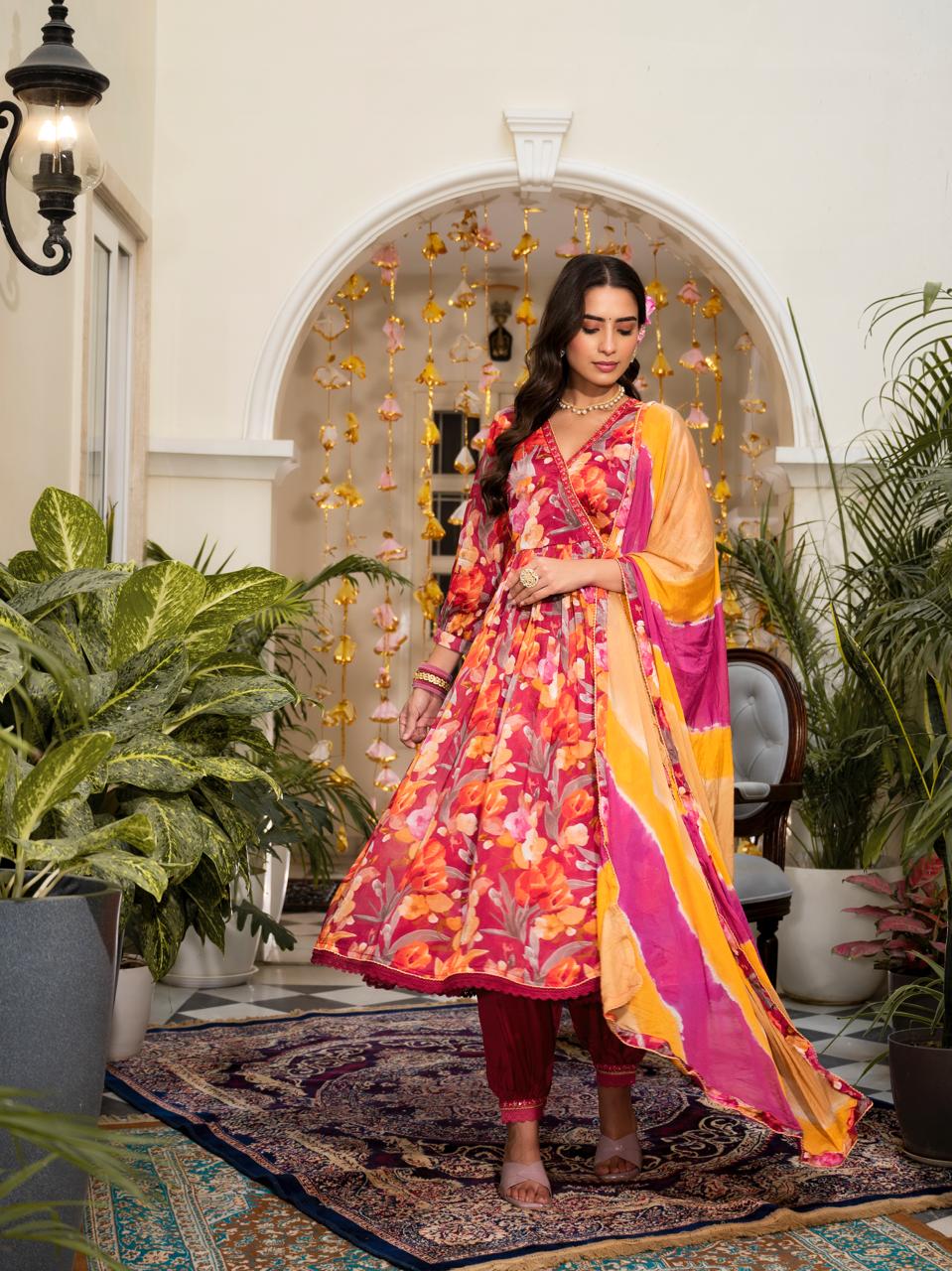 This elegant MAROON AND GREEN CHINON FABRIC ANGRAKHA SUIT WITH  AFGHANI BOTTOM  features intricate floral embroidery, adding a touch of sophistication to your wardrobe. The suit comes with a matching dupatta, completing the look with a cohesive and stylish ensemble. Perfect for special occasions or formal events, this outfit is sure to make a statement and turn heads wherever you go.