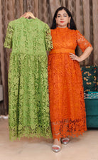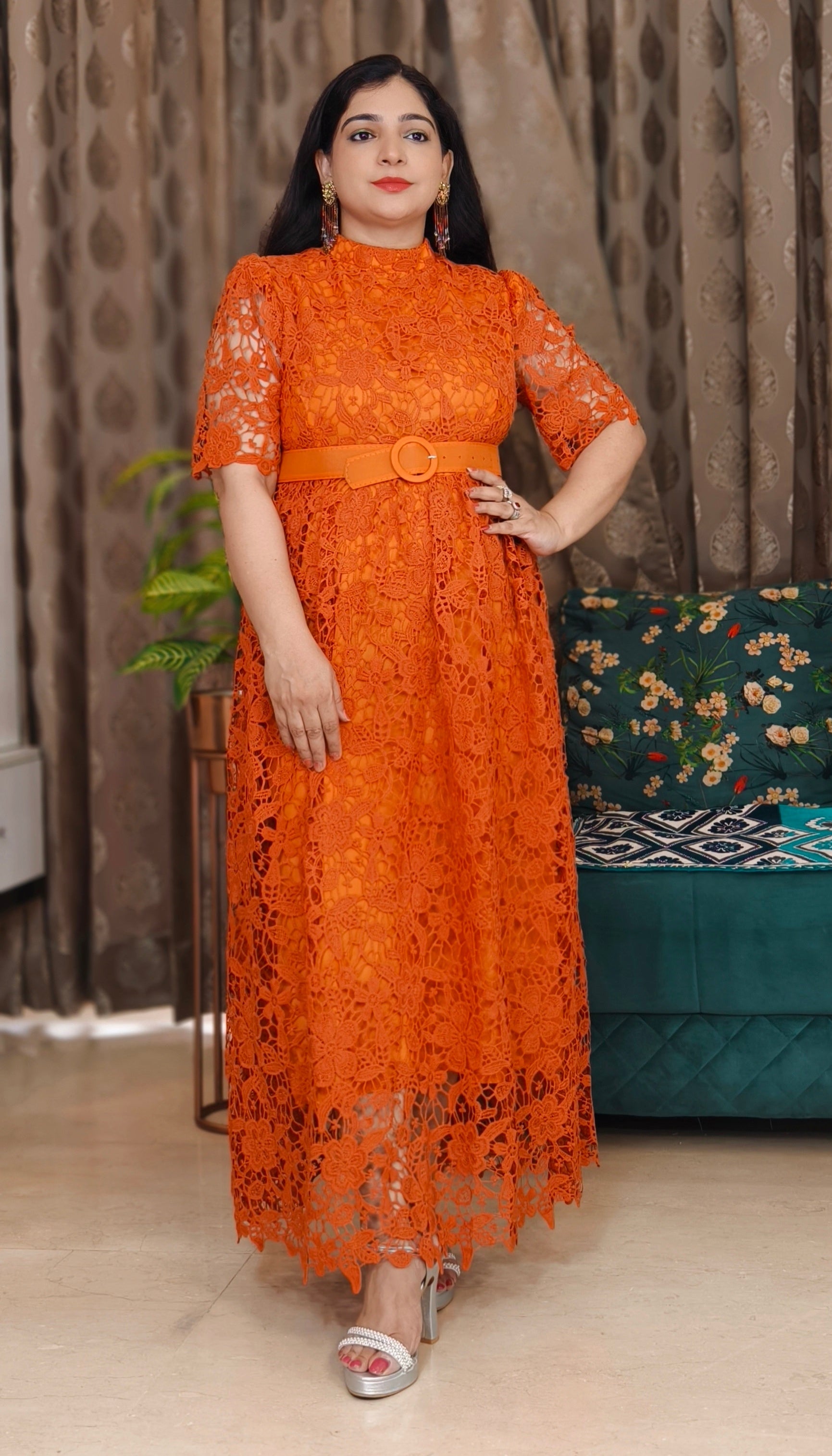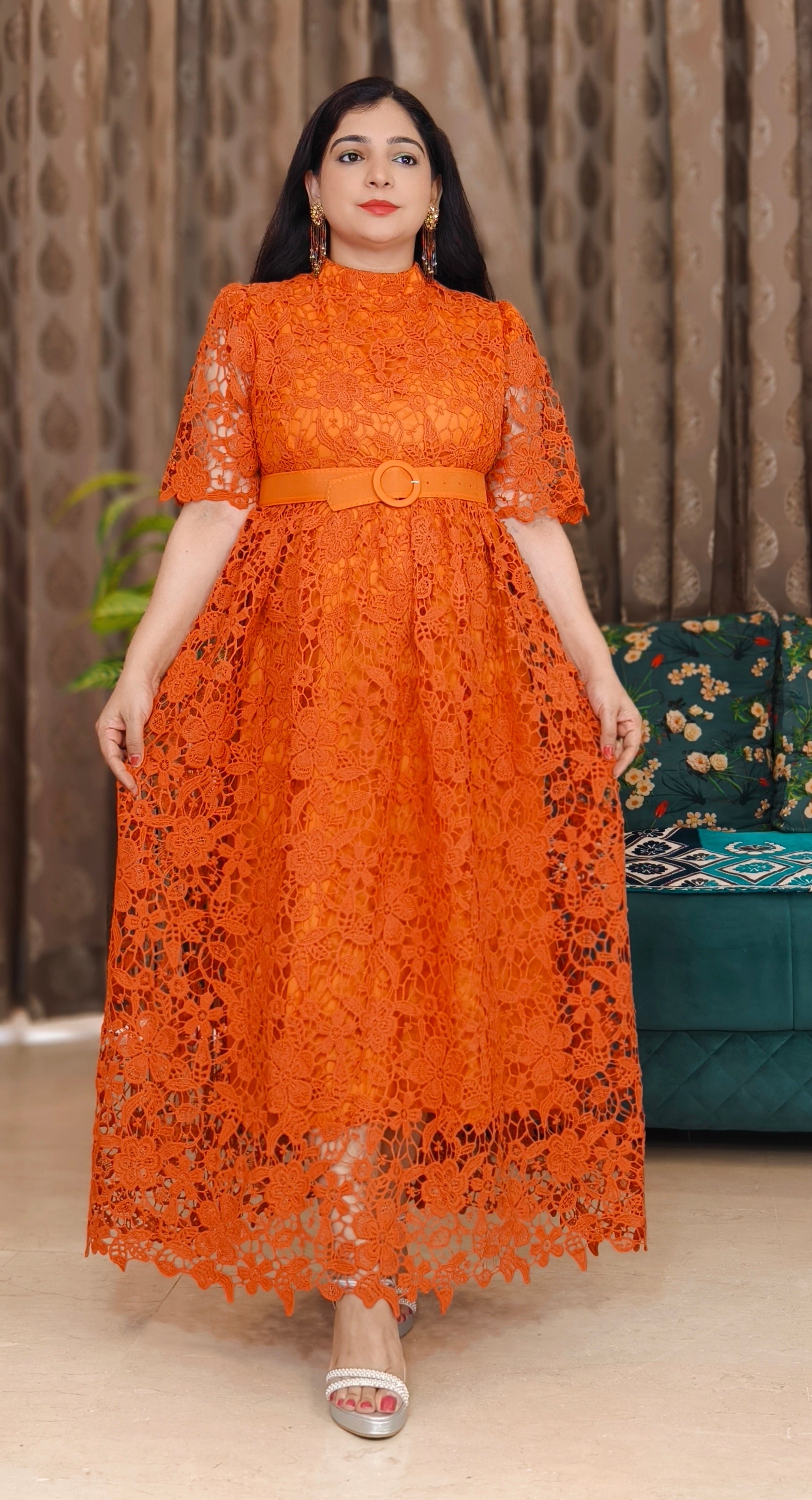 ORANGE AND GREEN IMPORTED FABRIC ONE PC DRESS WITH BELT