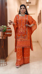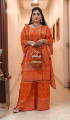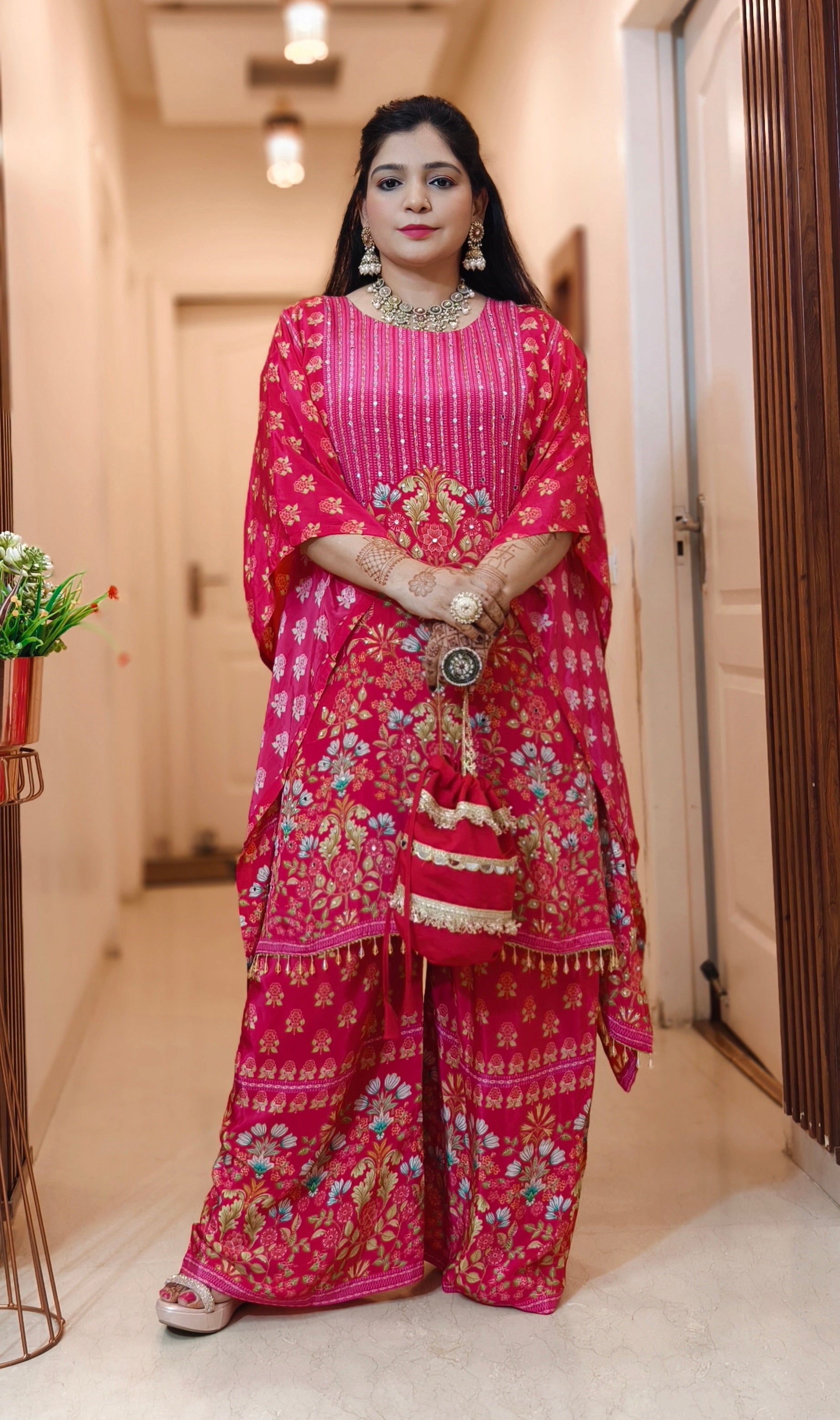 ORANGE AND PINK PREMIUM CREPE DESIGNER PARTY WEAR SHORT KAFTAN WITH FULL HANDWORK AND SARARA WITH POTLI