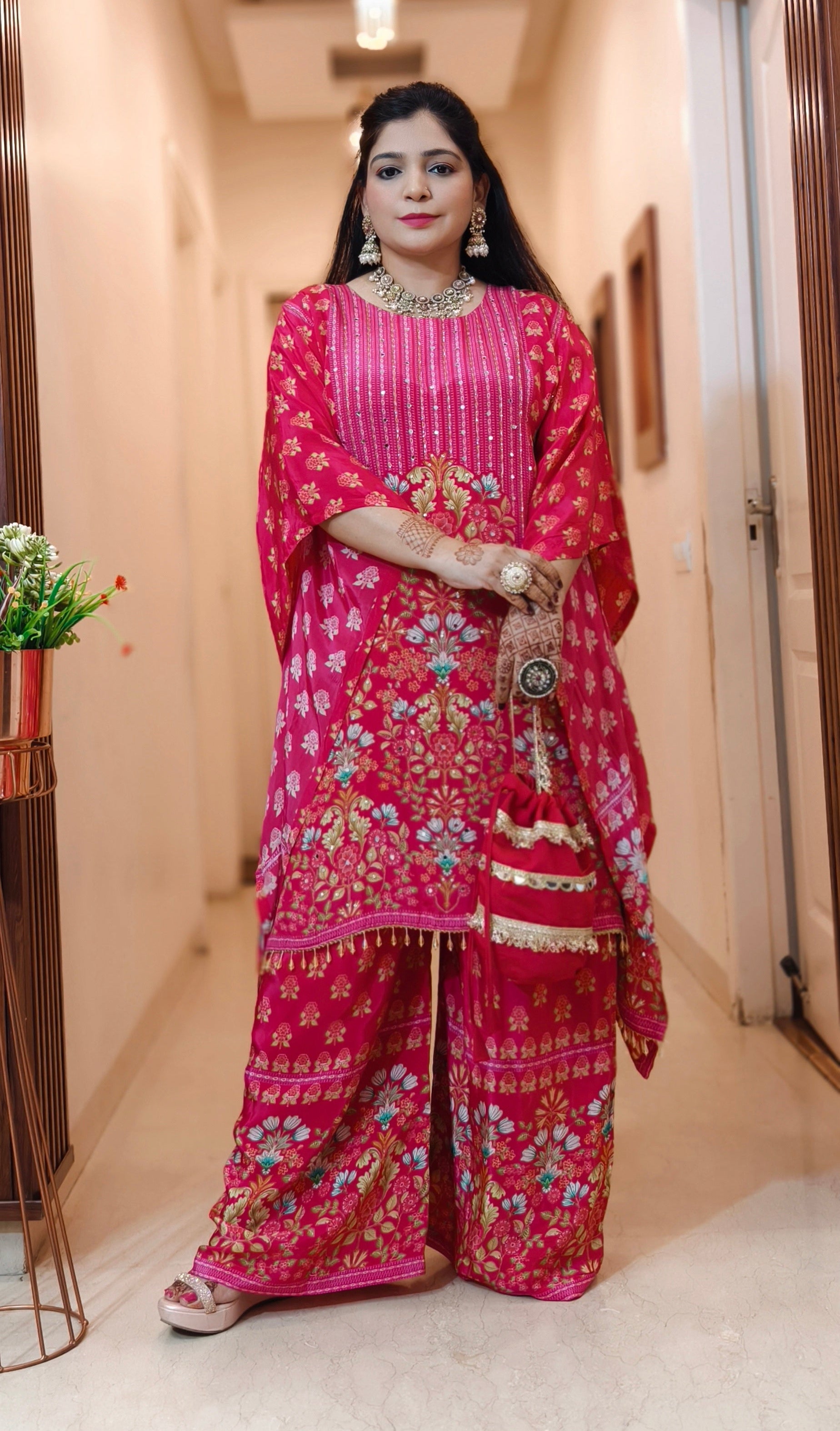 A must have ORANGE AND PINK PREMIUM CREPE DESIGNER PARTY WEAR SHORT KAFTAN WITH FULL HANDWORK AND SARARA WITH POTLI in your wardrobe.