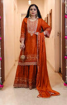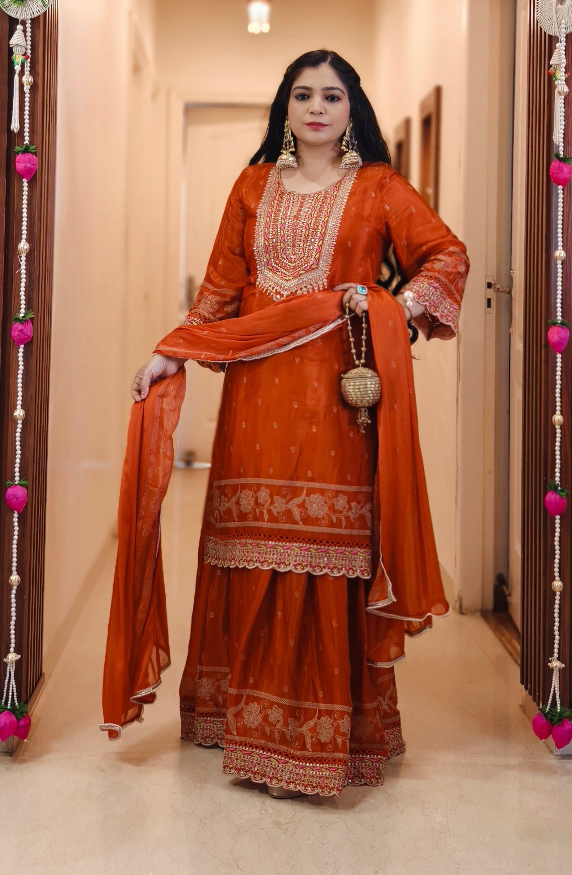 A must have ORANGE PREMIUM CREPE SILK KURTI WITH FLARED SKIRT AND HEAVY DUPATTA in your wardrobe. Perfect for special occasions or formal events, this outfit is sure to make a statement with its stunning design and attention to detail. Made with high-quality materials, this suit is both stylish and comfortable, making it a versatile addition to any fashion-forward individual's collection.