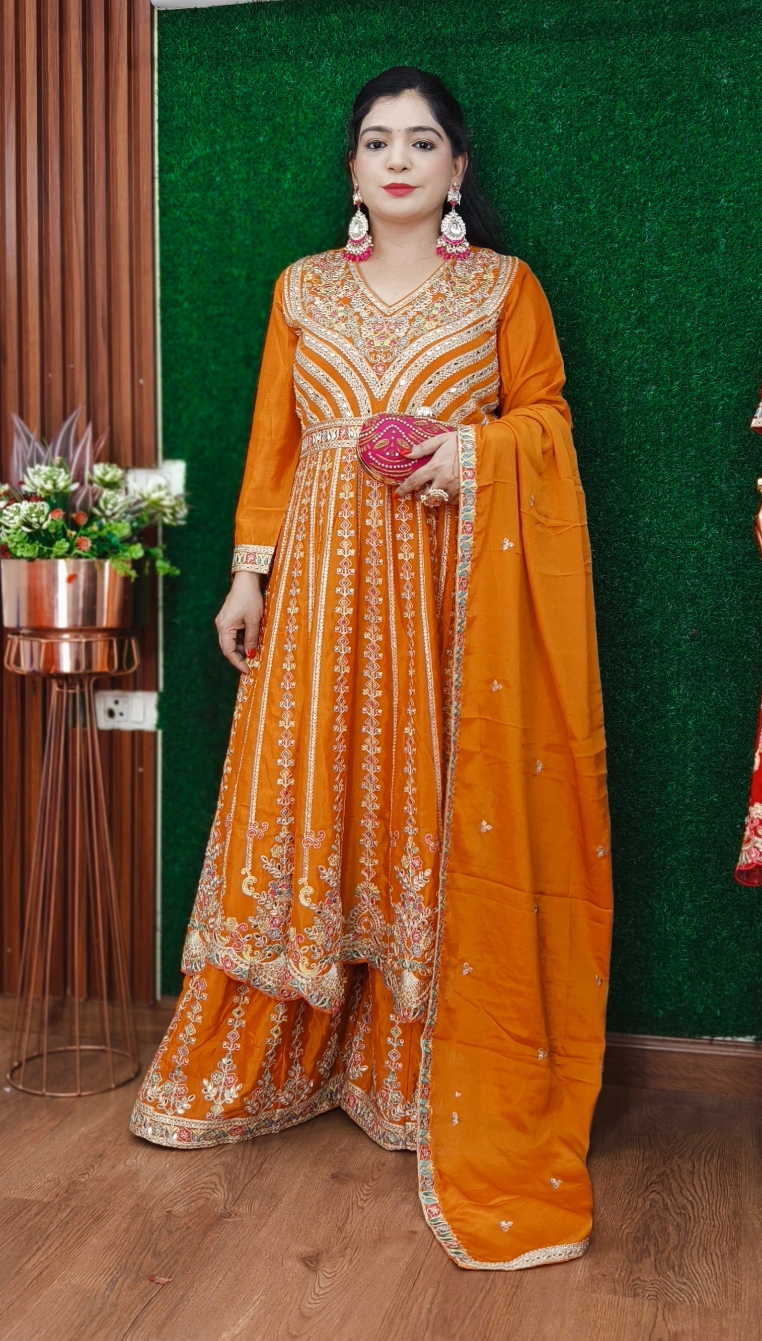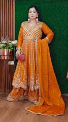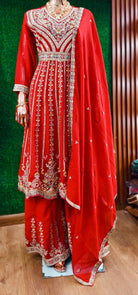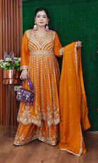 ORANGE & RED PREMIUM CHINON EMBRORAIRED SHARARA SUIT WITH FULL DUPATTA