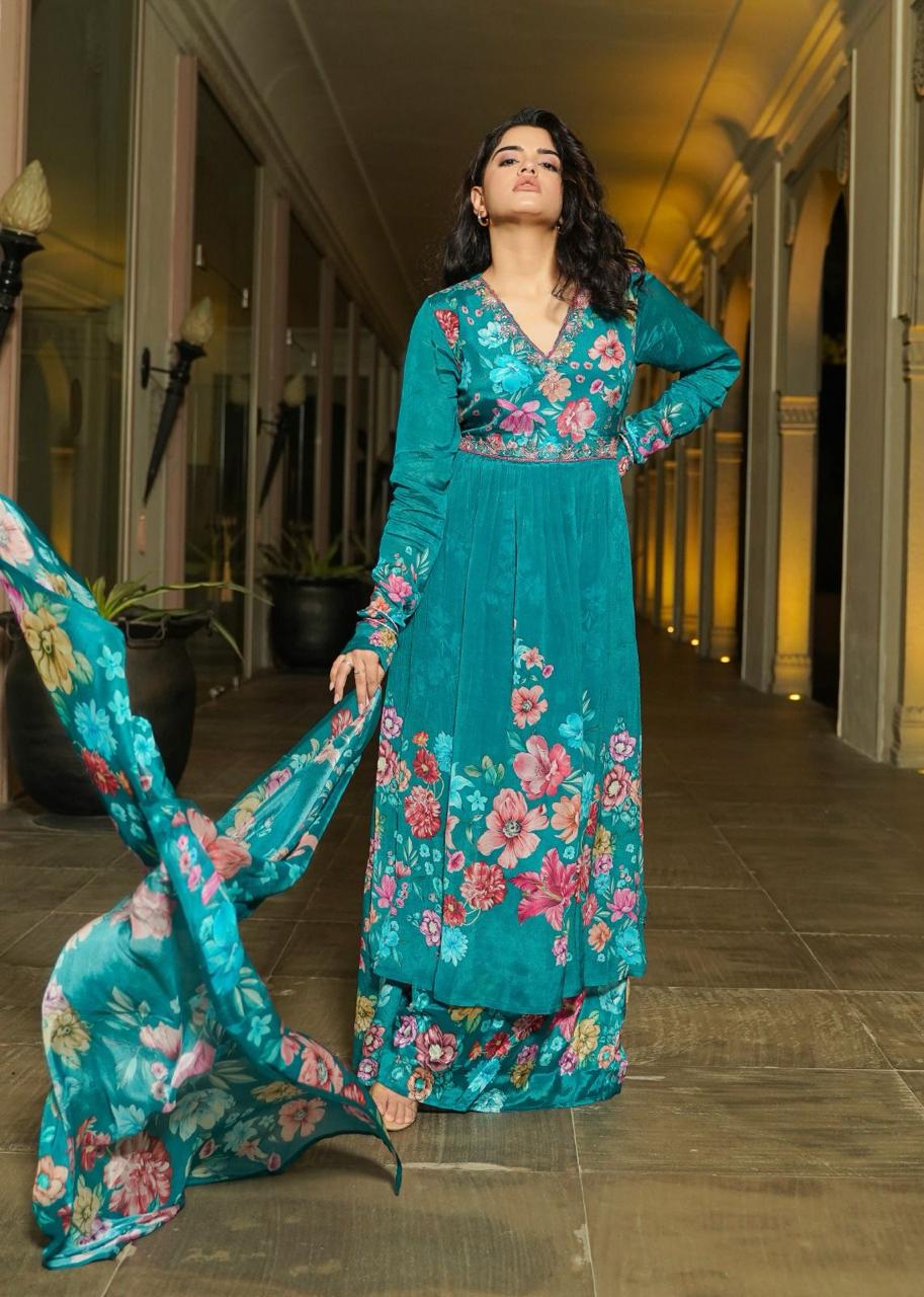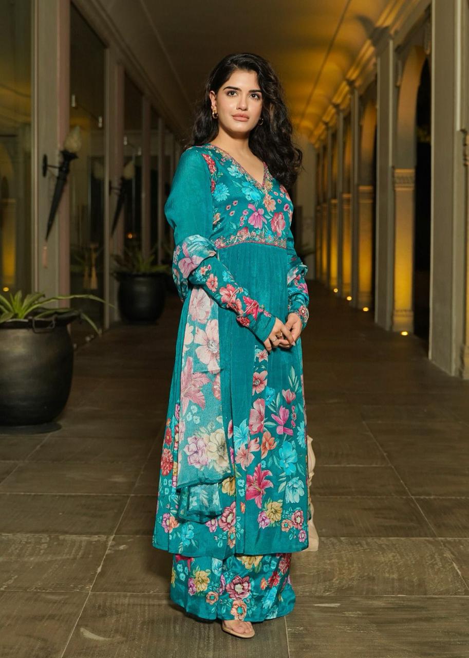 PEACOCK BLUE CHINON PARTY WEAR SARARA SUIT