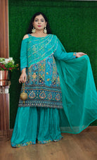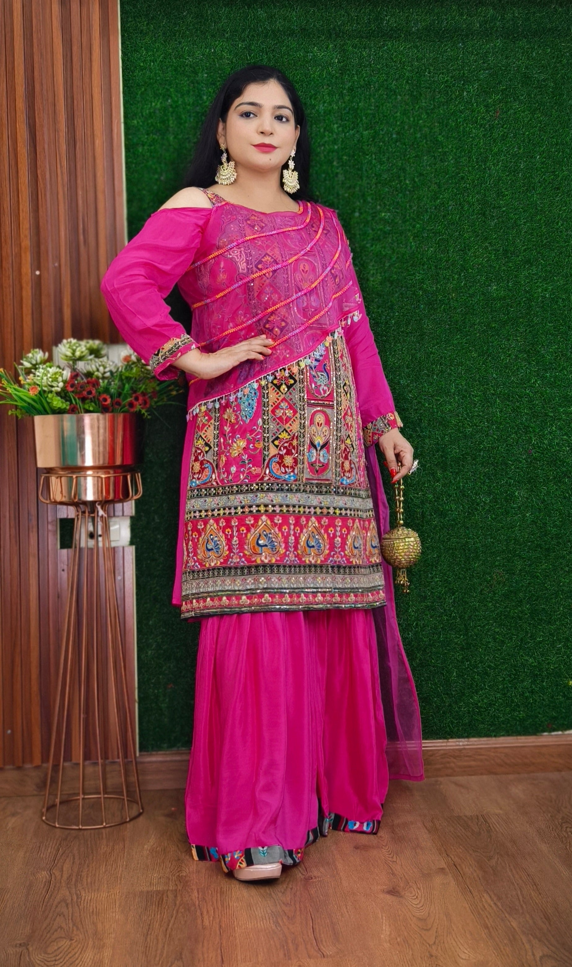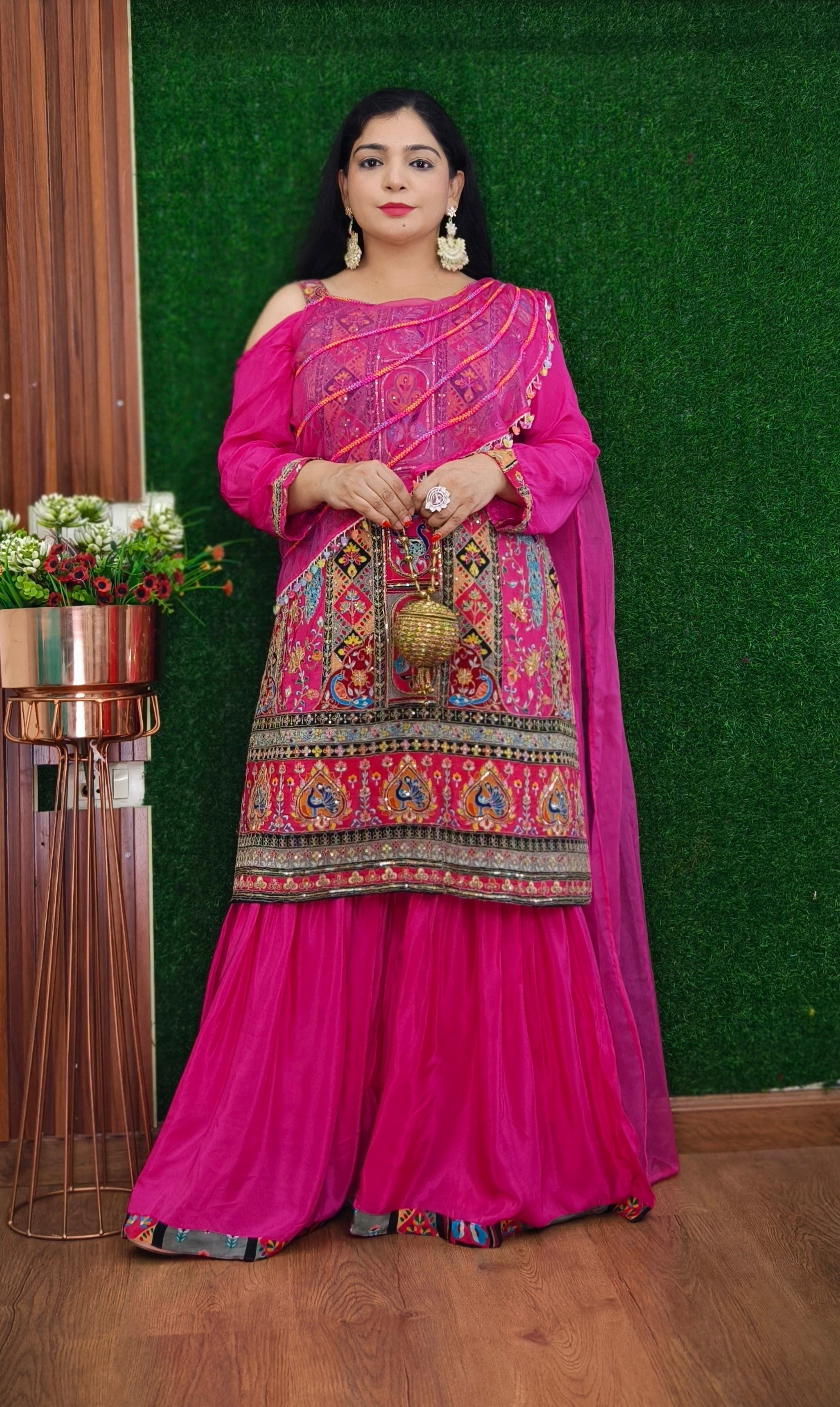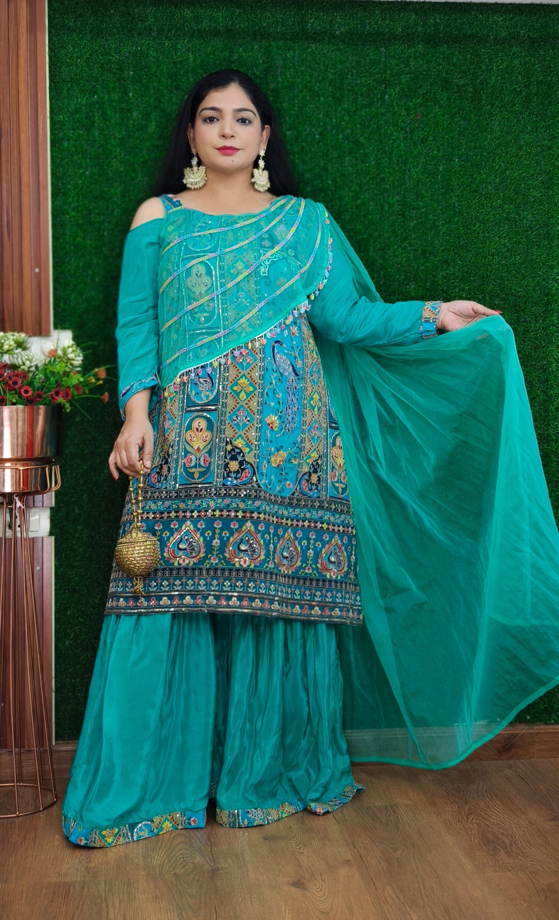 The PINK AND FIROZI FLORAL CREPE SUIT WITH PLAZO AND ATTACHED DESIGNER DUPATTA  is a stunning ensemble that blends elegance and contemporary style. This lehenga features a rich emerald green base adorned with intricate floral patterns, creating a vibrant and captivating look. The flowing organza fabric adds a touch of ethereal grace, while the chic cape design provides a modern twist. Perfect for festive occasions or weddings, this outfit promises to make a statement, exuding sophistication and charm.