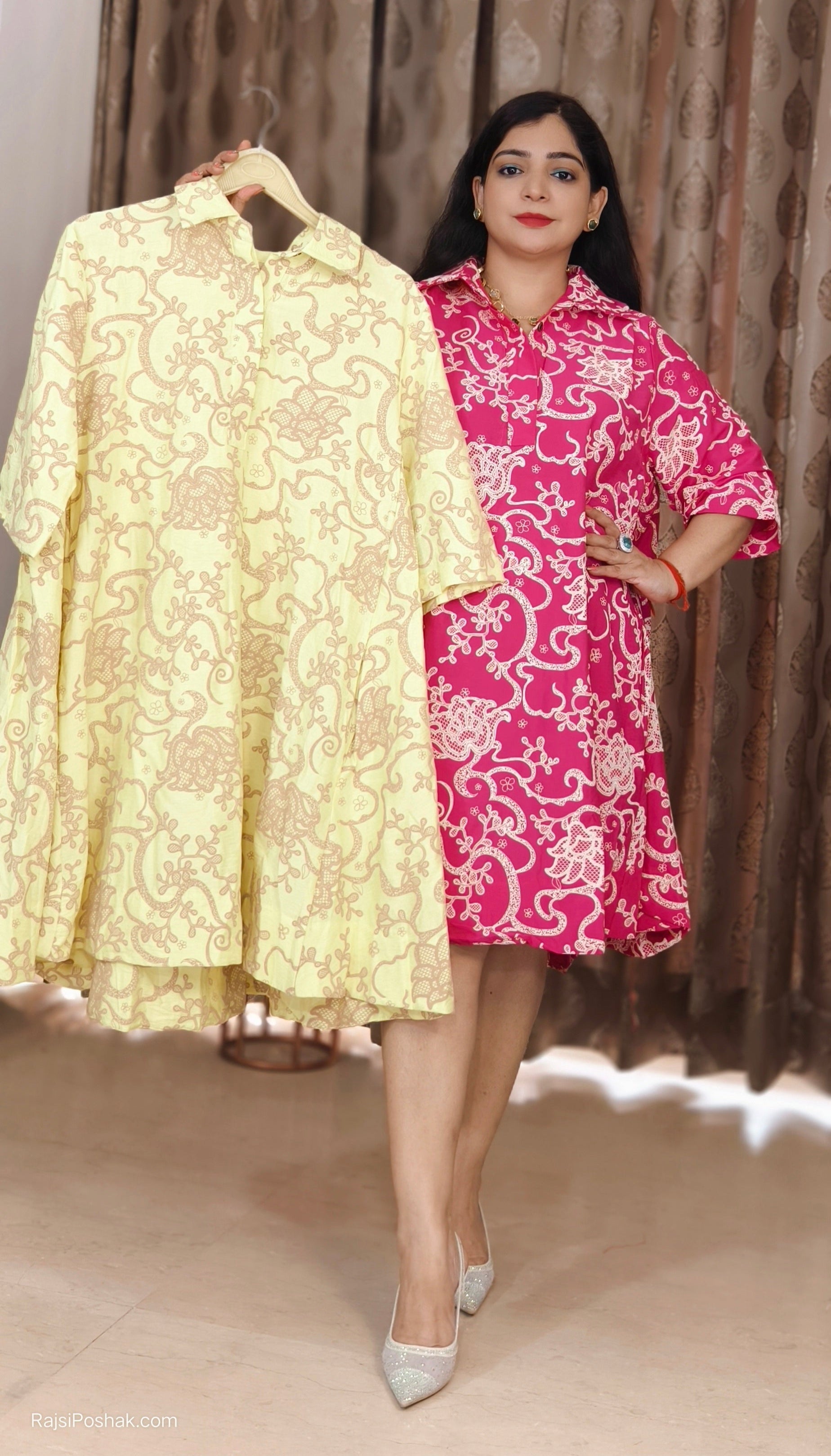 The PINK AND YELLOW IMPORTED FABRIC ONE PC DRESS features a vibrant, bold magenta pink color, creating a striking and elegant look. Crafted from high-quality wrinkle-resistant fabric, it ensures comfort and durability while maintaining a stylish, effortlessly chic appearance. This dress is perfect for both casual and semi-formal occasions, offering a flattering silhouette with its unique fabric texture. The lightweight and breathable material adds to its appeal, making it an ideal choice for warmer weather or layering during cooler months.