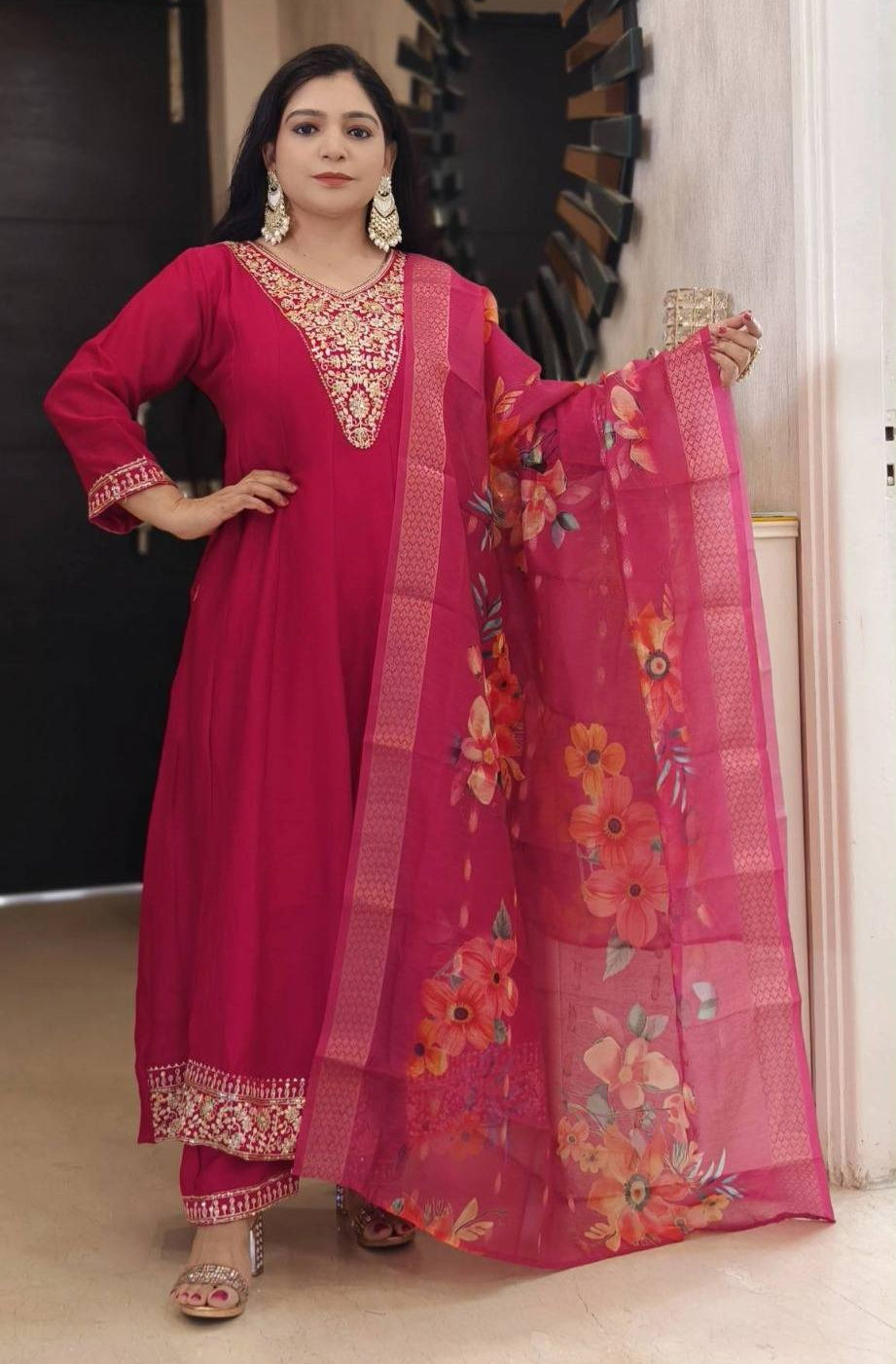 This elegant PINK CHINON ANARKALI WITH BEAUTIFUL DUPATTA  features intricate work, adding a touch of sophistication to your wardrobe. The suit comes with a matching dupatta, completing the look with a cohesive and stylish ensemble. Perfect for special occasions  this outfit is sure to make a statement and turn heads wherever you go.