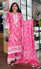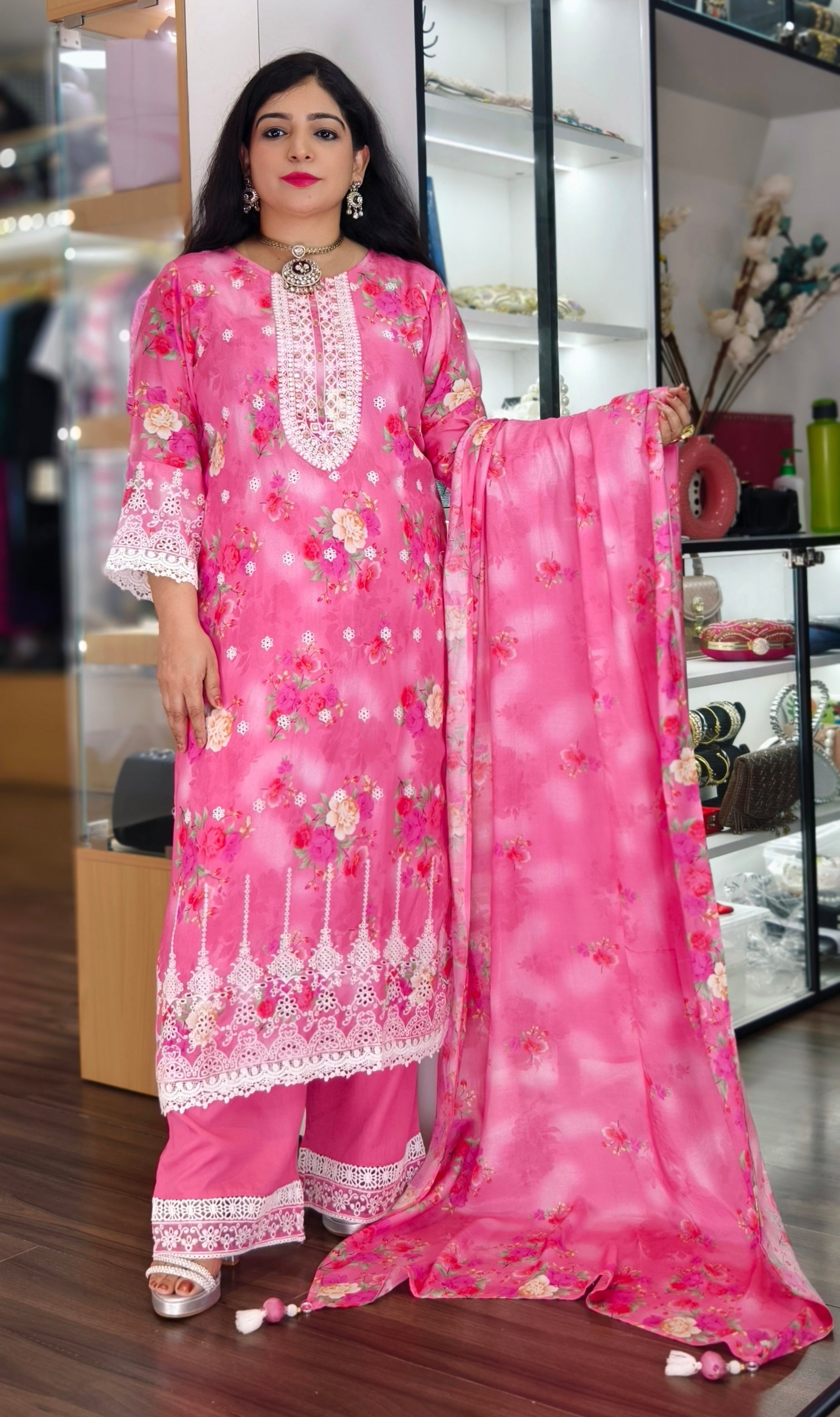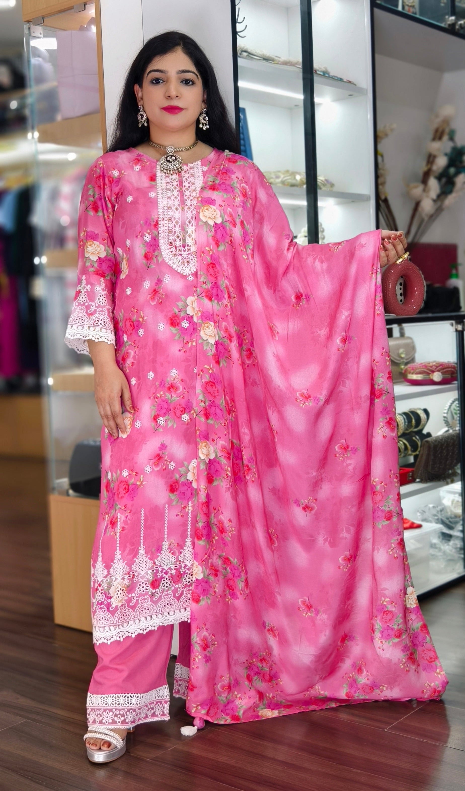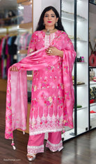 This elegant ensemble features a Pure Viscose Maslin Top, designed with intricate all-over handwork that adds a touch of sophistication. The top is adorned with exquisite delicate lace detailing, enhancing its visual appeal. It is paired with a Premium Shantoon Bottom, offering both comfort and style. Perfect for special occasions, this outfit exudes timeless charm and elegance.