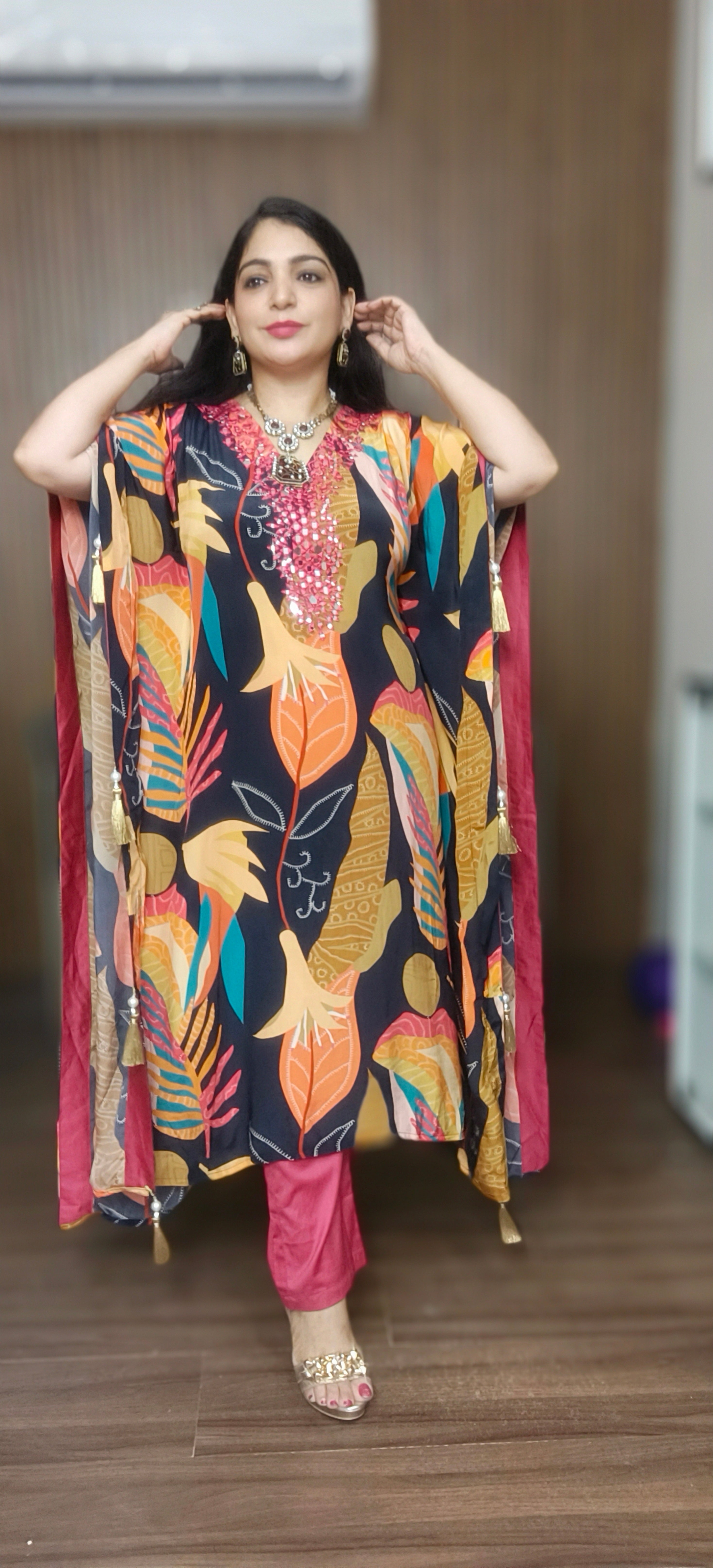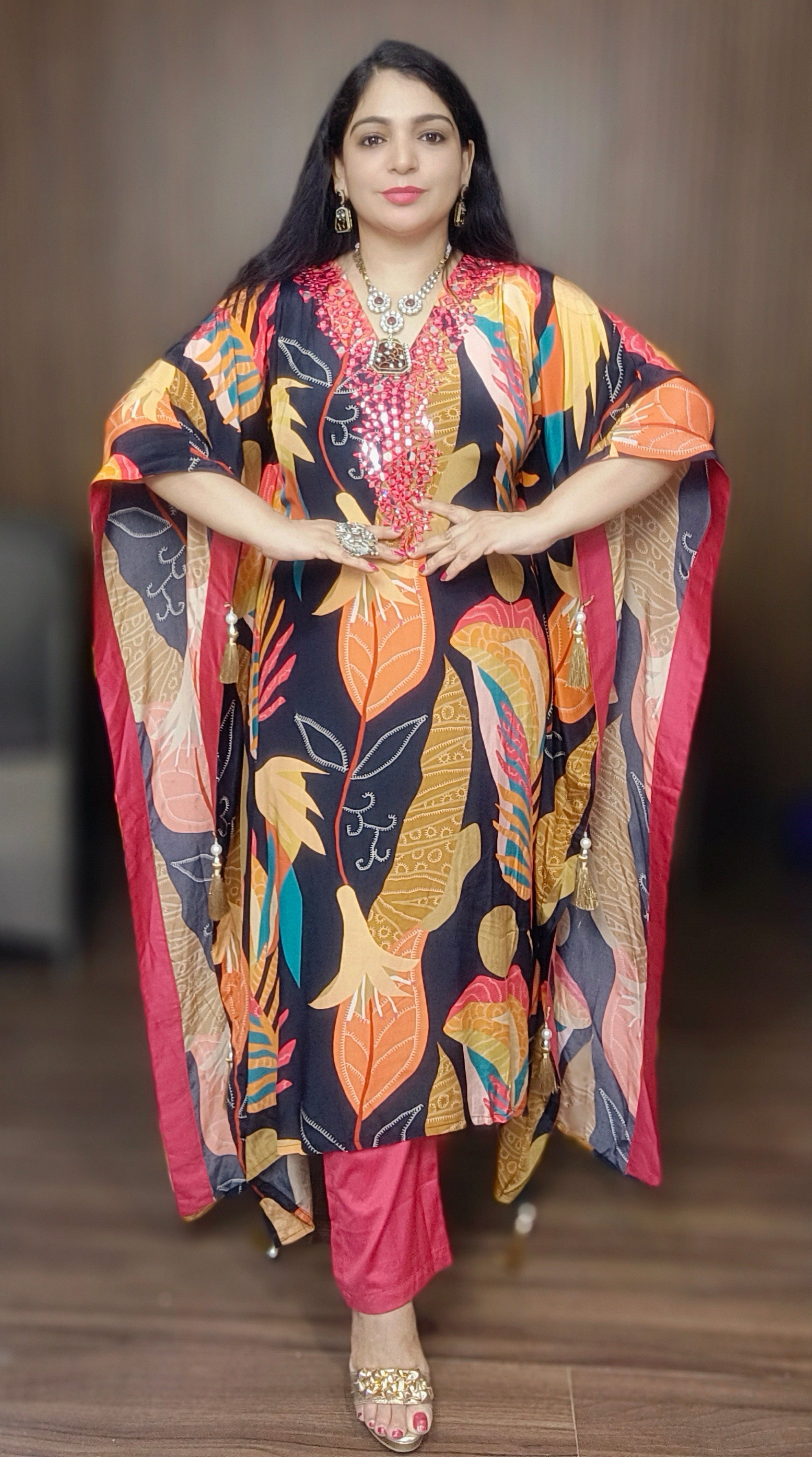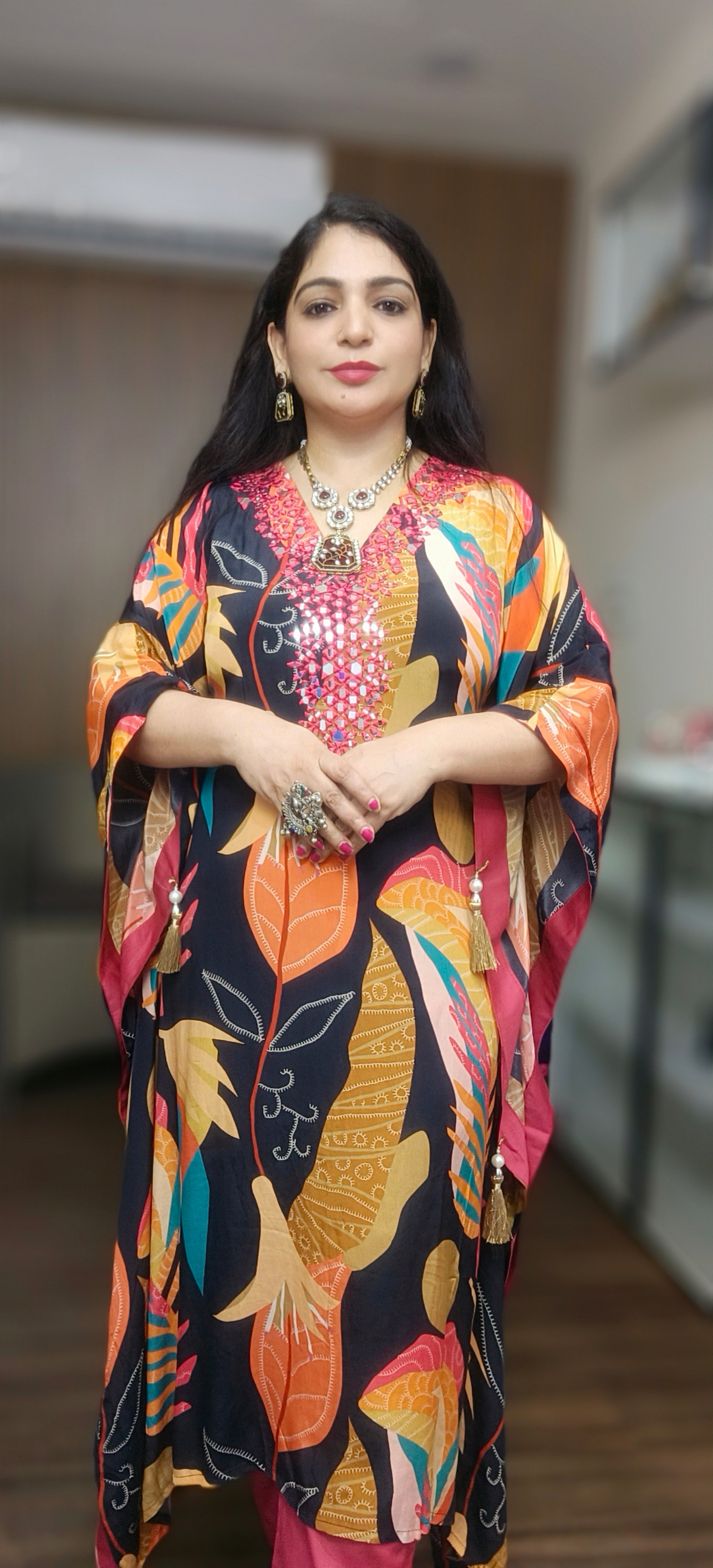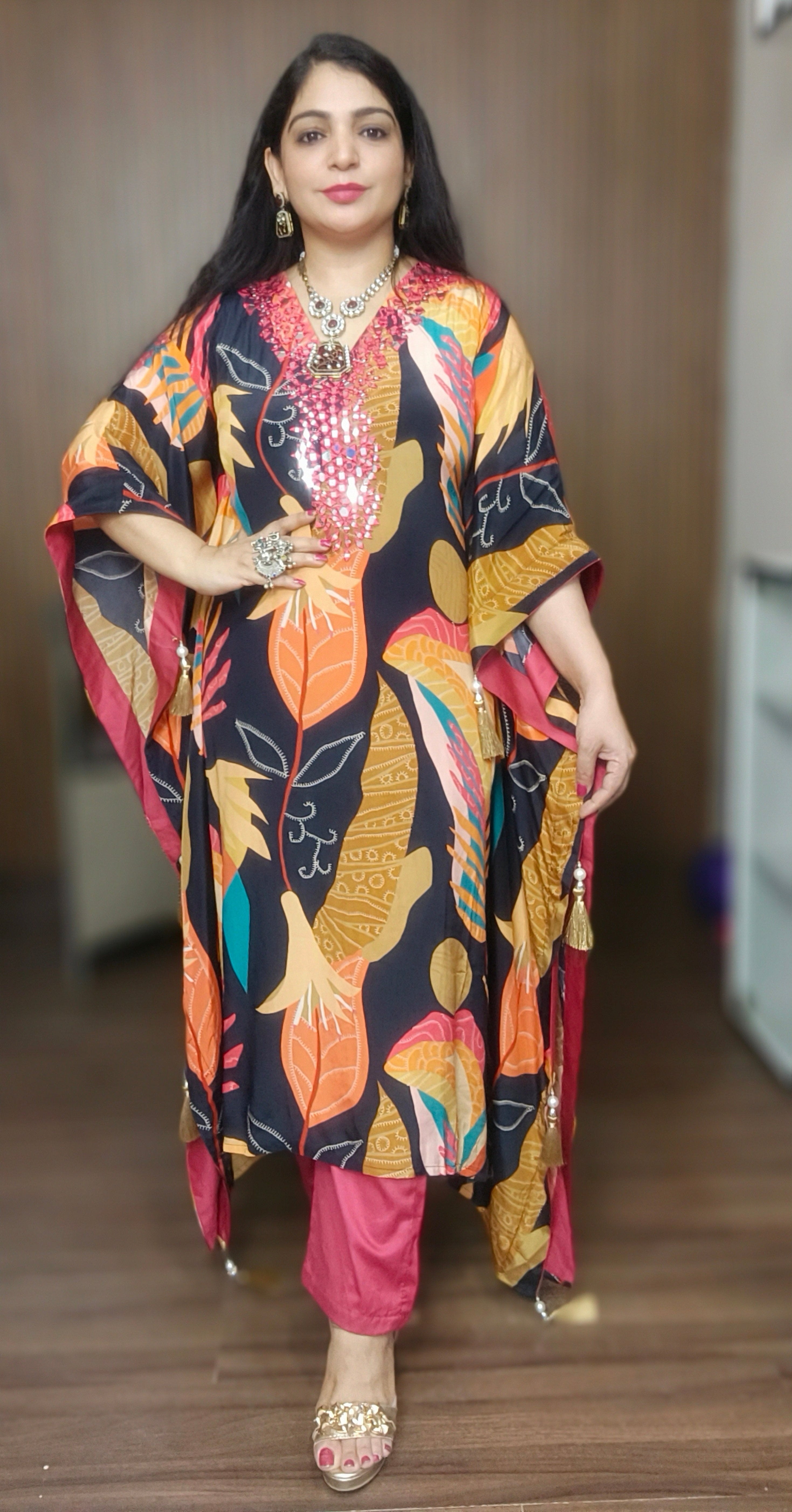 PREMIUM PURE CREPE KAFTAN WITH REAL MIRROR WORK AND PANTS