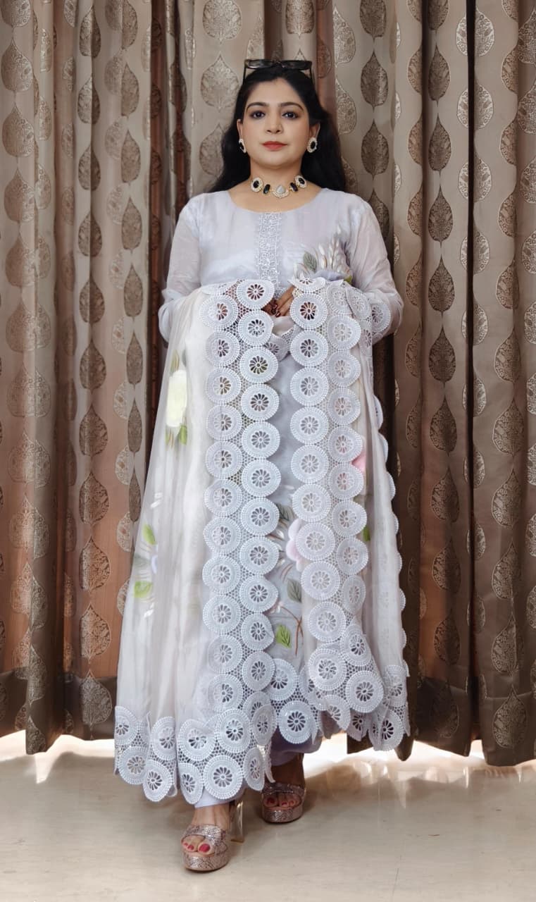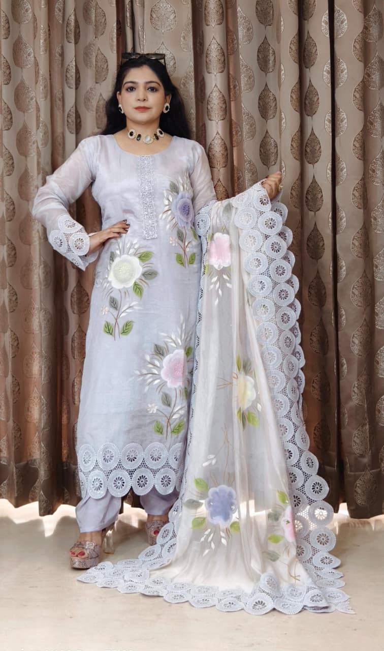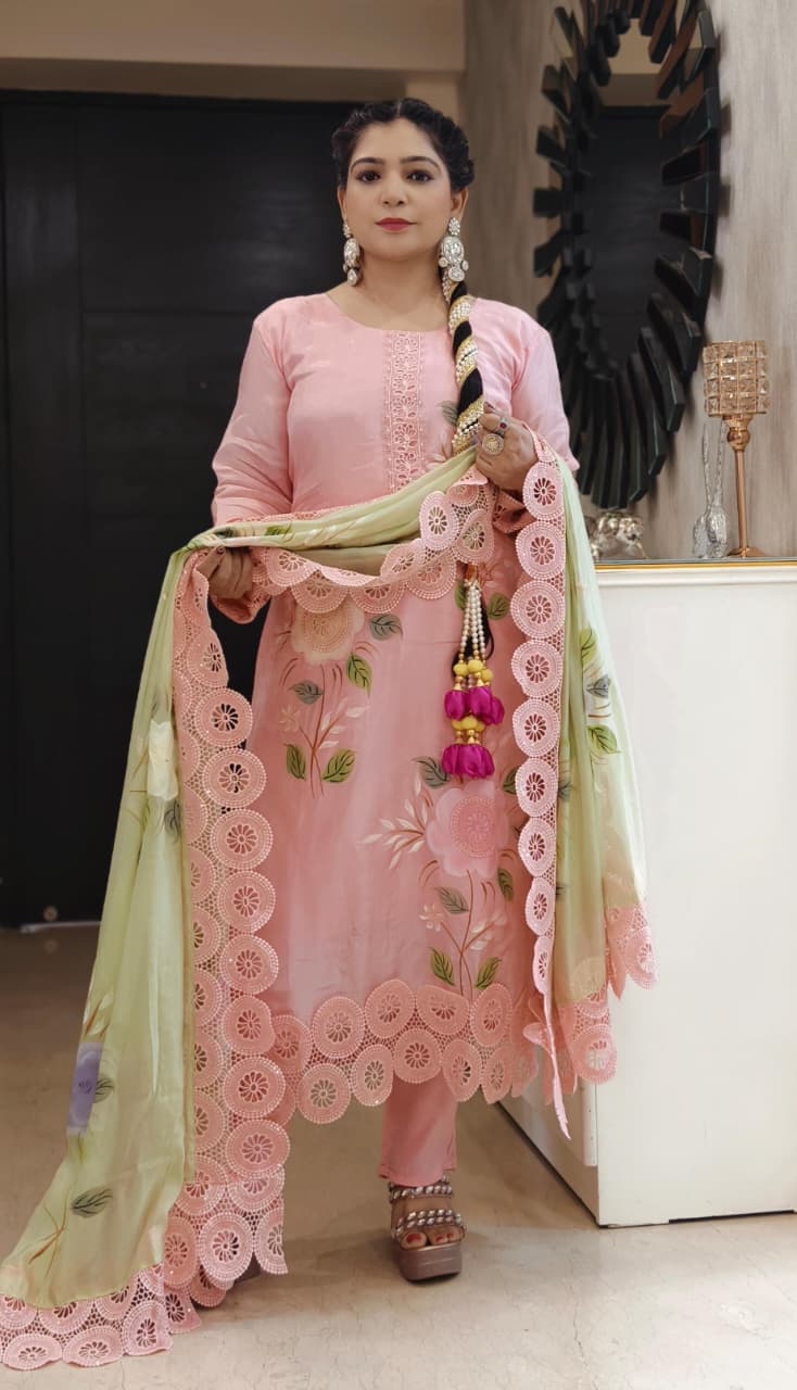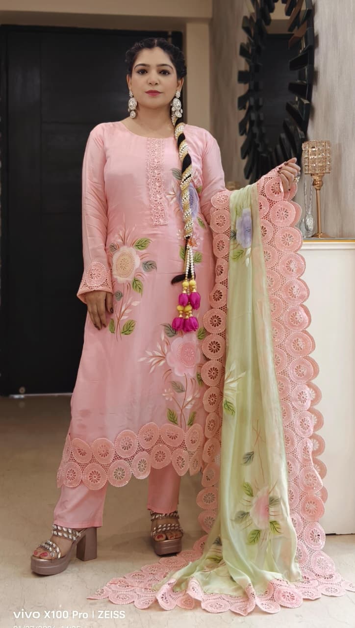 This PURPLE AND PINK ROMAN SILK DESIGNER PAKISTANI SUIT WITH CONTRAST DUPATTA elegant pink embroidered suit with a matching dupatta is the perfect addition to your wardrobe. The intricate embroidery and delicate detailing make it a timeless and sophisticated choice for any special occasion. Made with high-quality fabric, this suit is not only stylish but also comfortable to wear. Whether you're attending a wedding, a party, or a festive celebration, this suit is sure to make you stand out in the crowd.