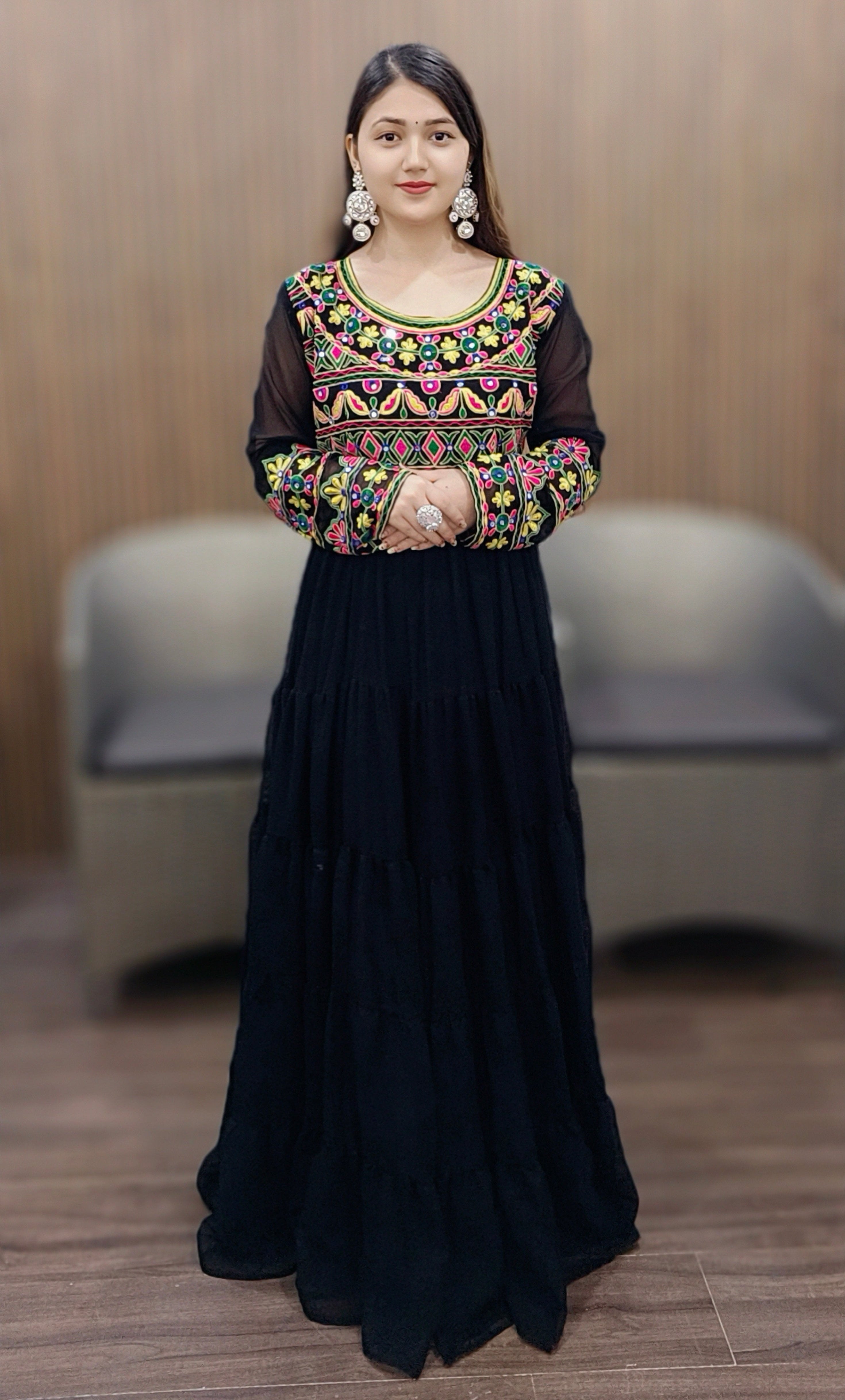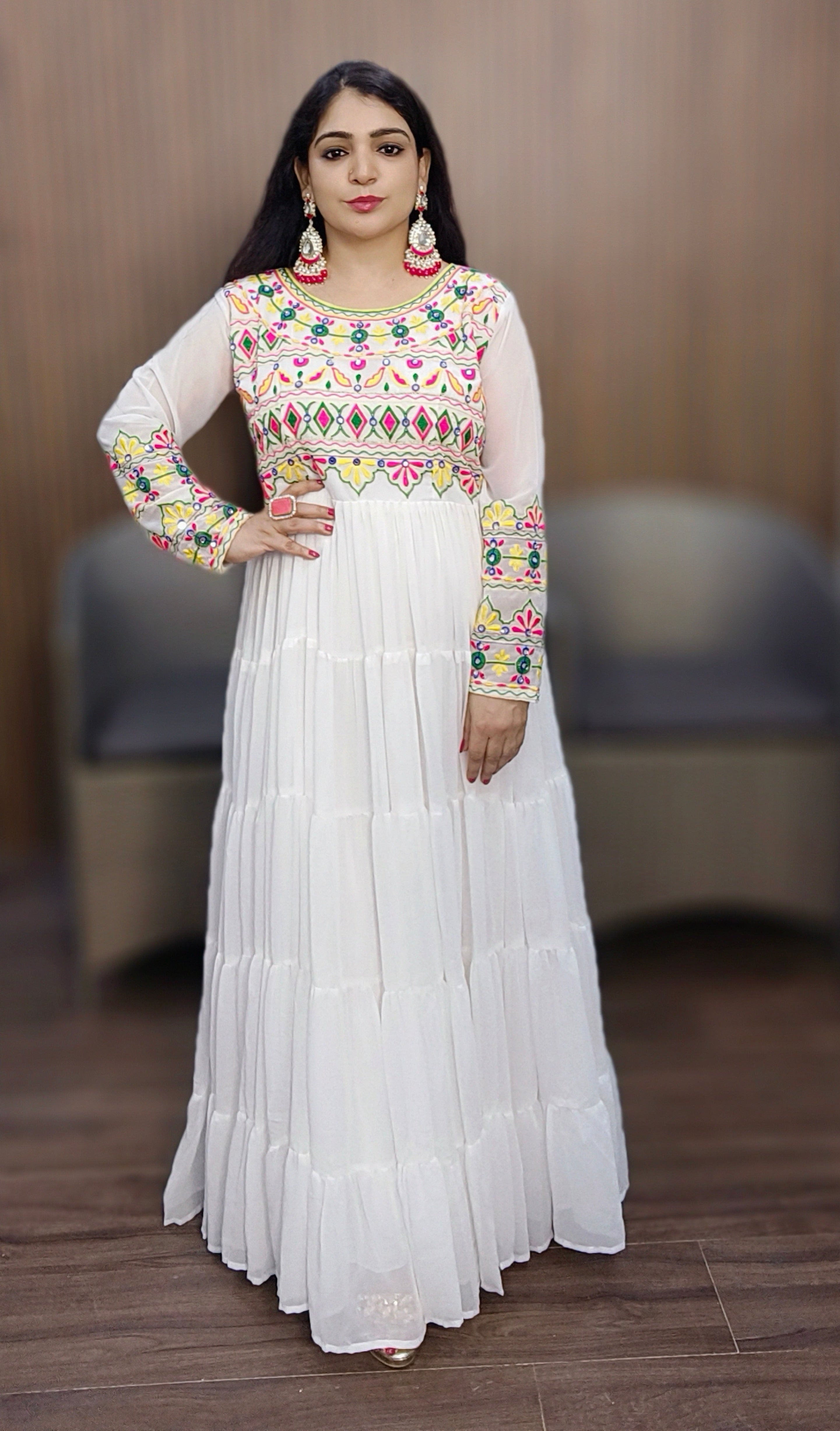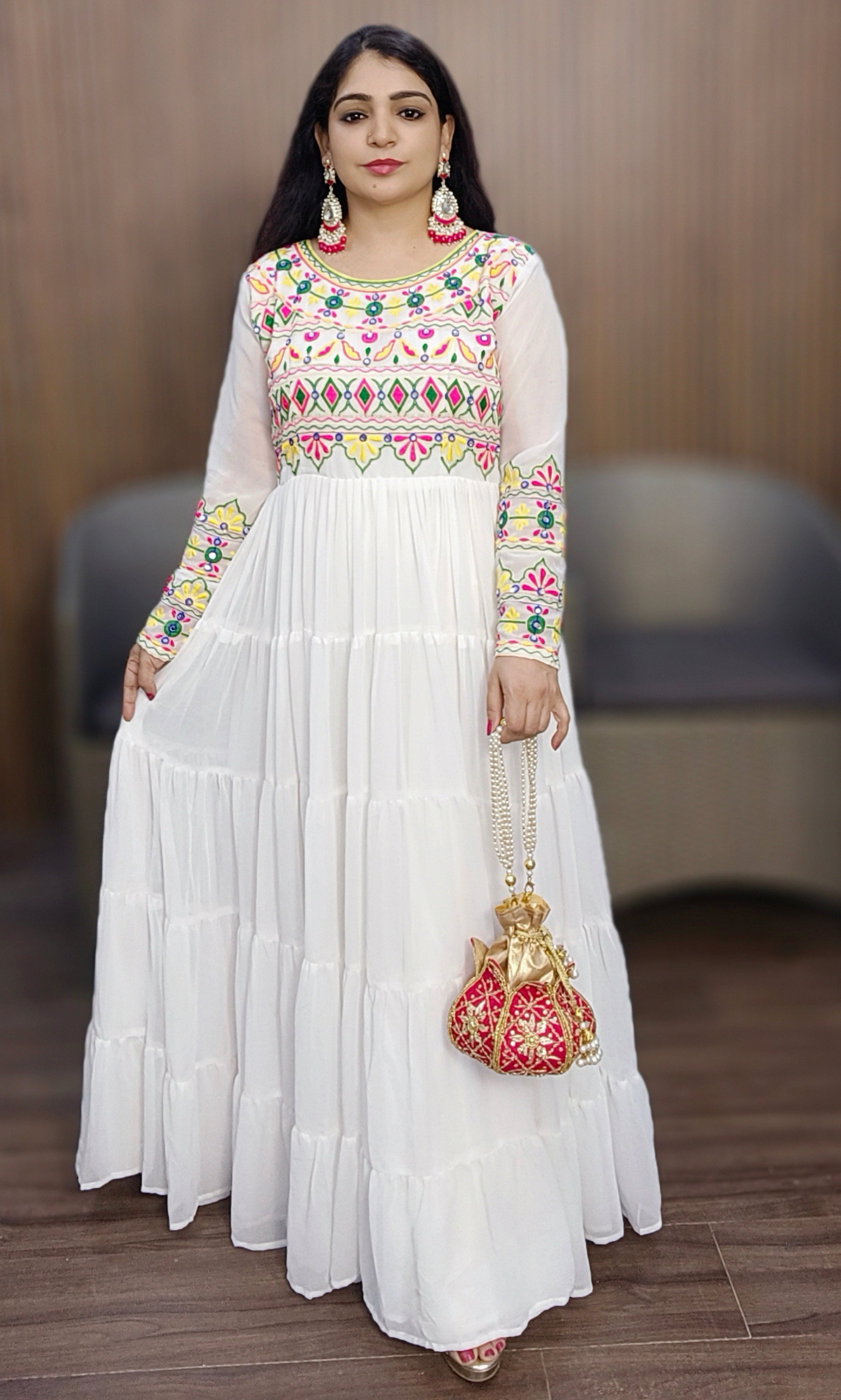 This elegant WHITE AND BLACK GEORGETTE FLAIRED GOWN features intricate floral embroidery, adding a touch of sophistication to your wardrobe. The suit comes with a matching dupatta, completing the look with a cohesive and stylish ensemble. Perfect for special occasions or formal events, this outfit is sure to make a statement and turn heads wherever you go.