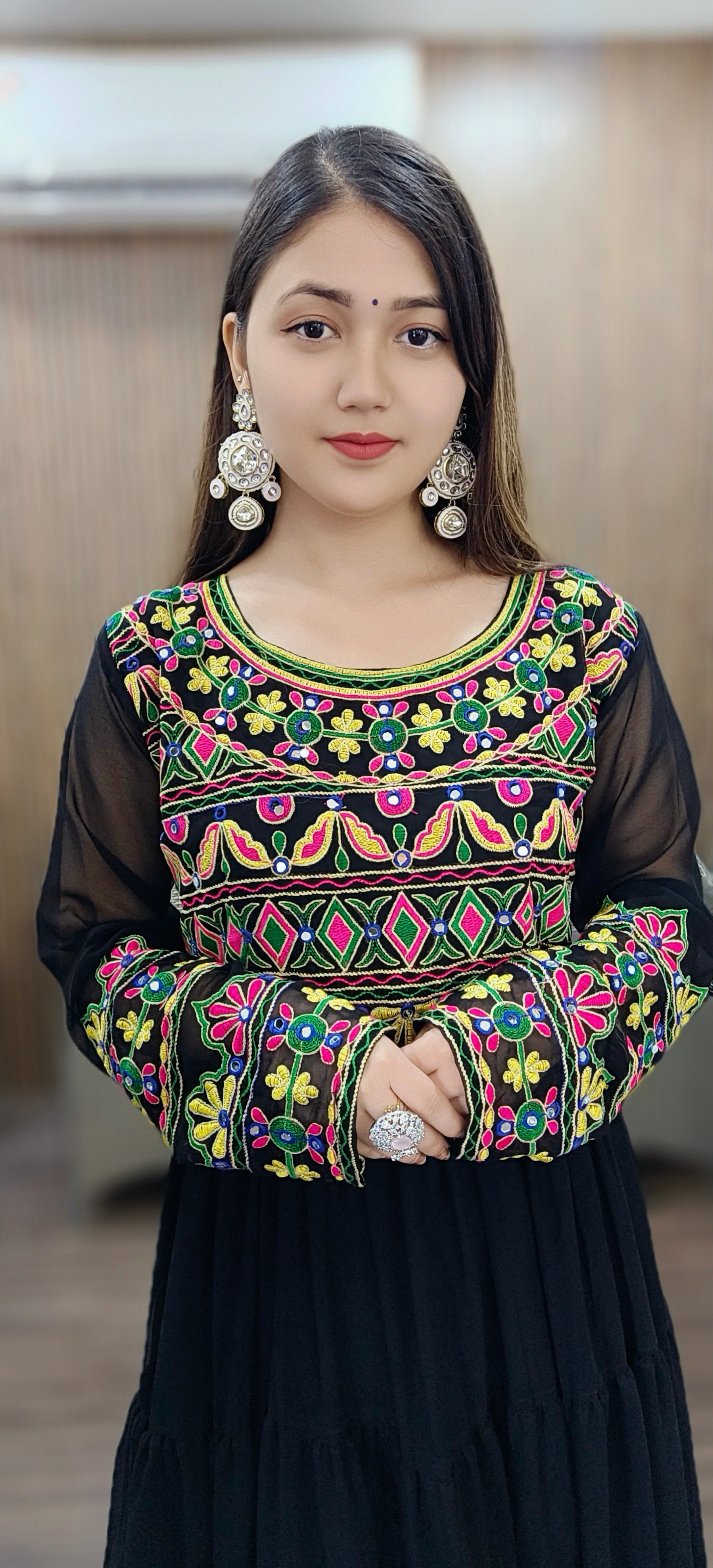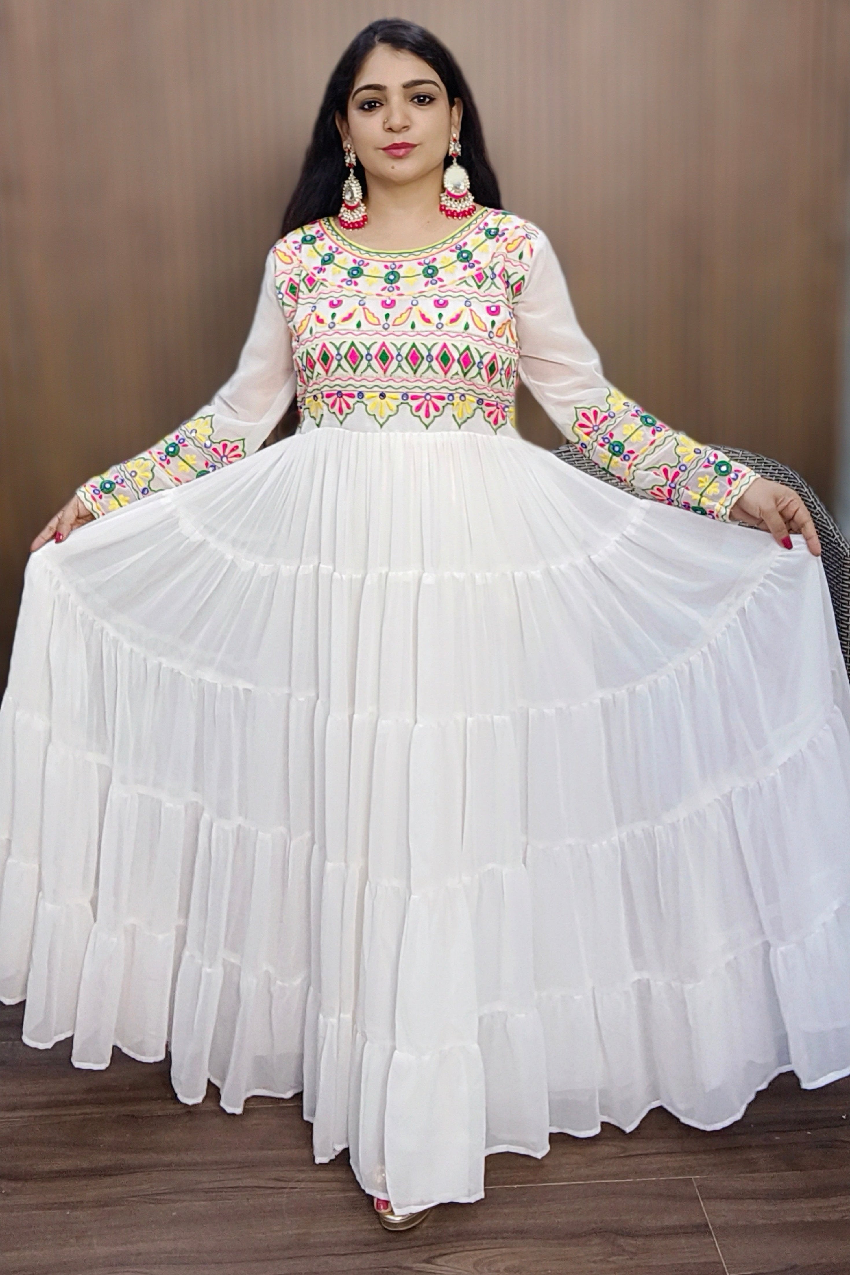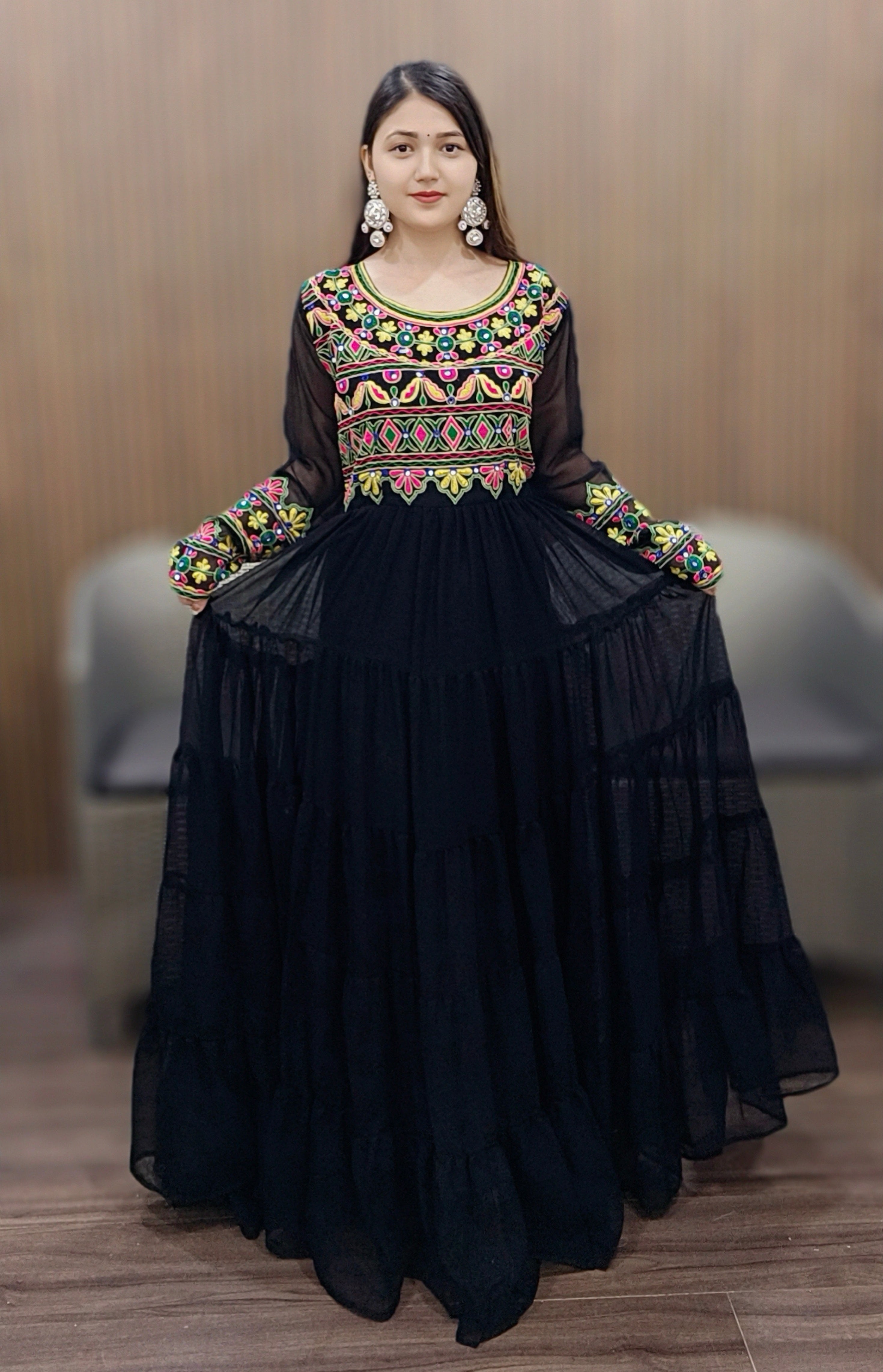 This elegant WHITE AND BLACK GEORGETTE FLAIRED GOWN features intricate floral embroidery, adding a touch of sophistication to your wardrobe. The suit comes with a matching dupatta, completing the look with a cohesive and stylish ensemble. Perfect for special occasions or formal events, this outfit is sure to make a statement and turn heads wherever you go.