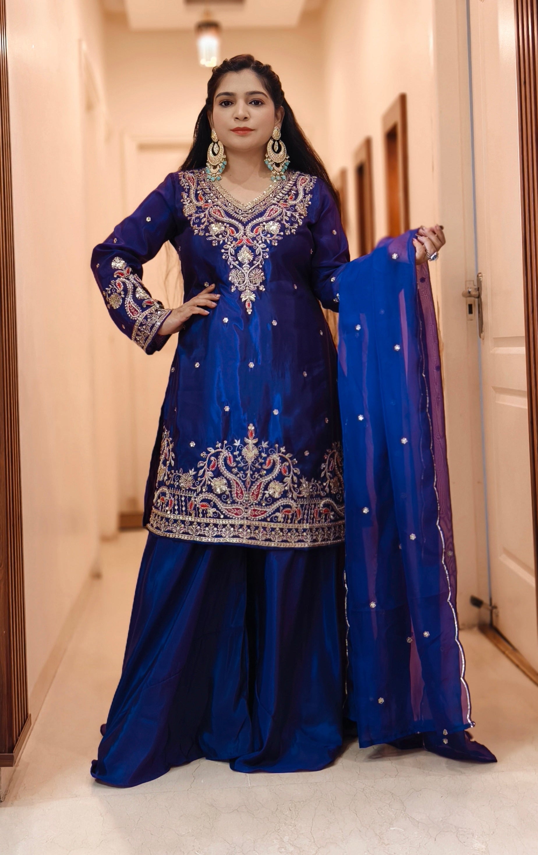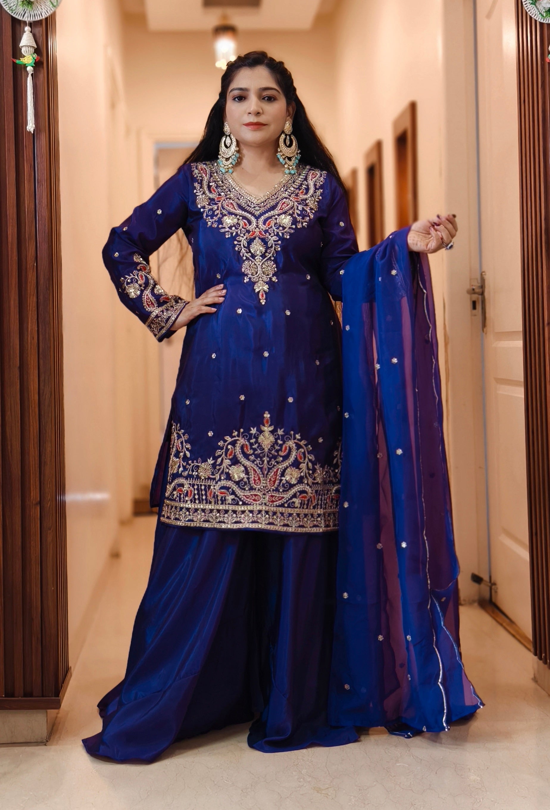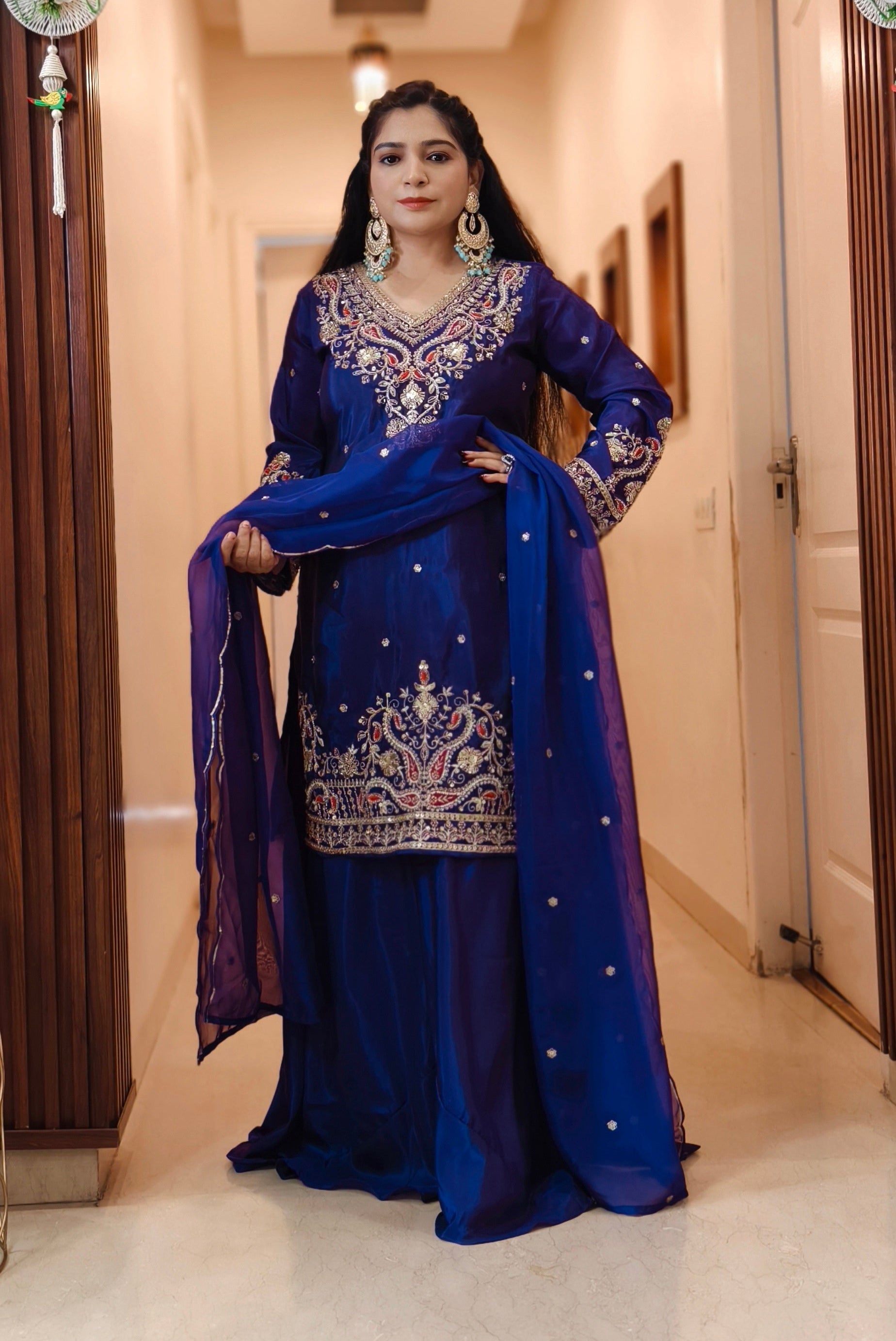 The PURPLE PURE CREPE SUIT WITH FULL FLAIRED DEVIDER WITH DUPATTA is a stunning ensemble that blends elegance and contemporary style. This lehenga features a rich emerald green base adorned with intricate floral patterns, creating a vibrant and captivating look. The flowing organza fabric adds a touch of ethereal grace, while the chic cape design provides a modern twist. Perfect for festive occasions or weddings, this outfit promises to make a statement, exuding sophistication and charm.
