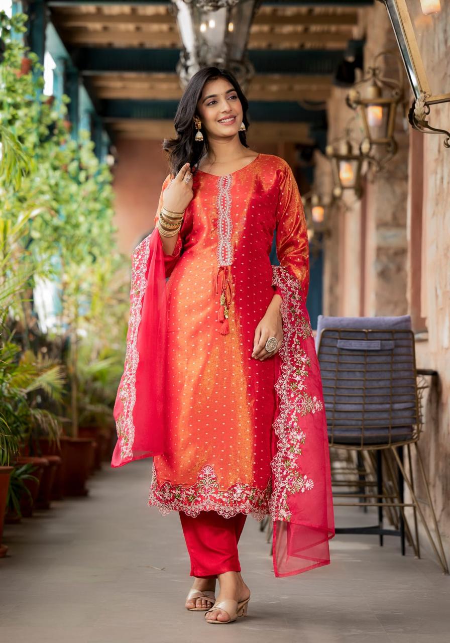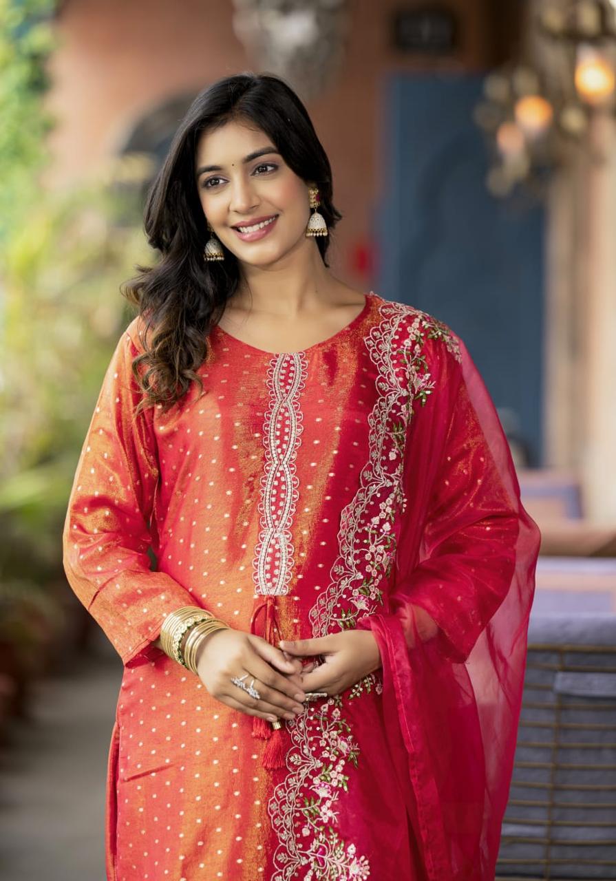 RANI AND RED GLASS TISSUE SUIT WITH DUPATTA