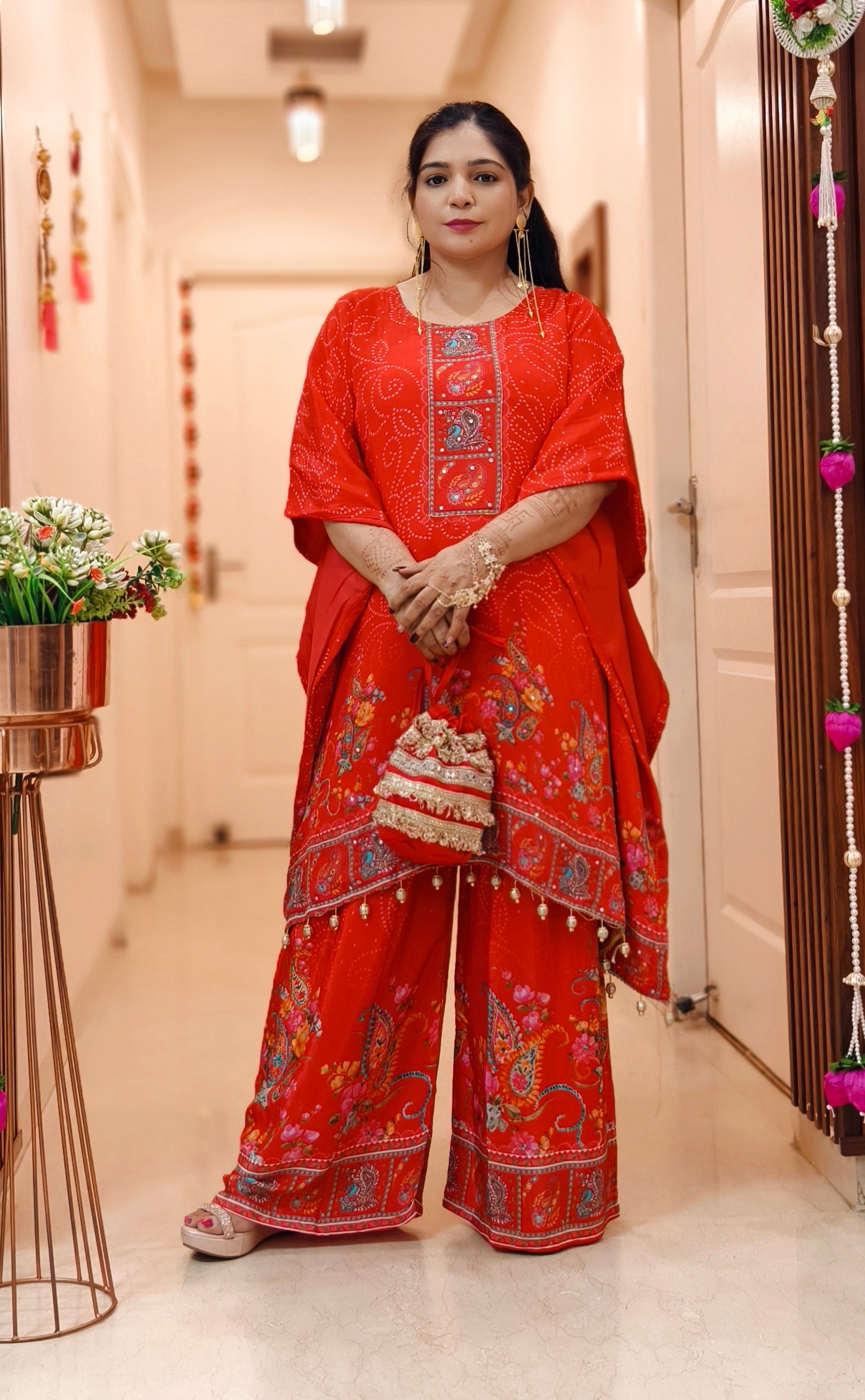 RED PREMIUM CREPE DESIGNER PARTY WEAR SHORT KAFTAN WITH FULL HANDWORK AND SARARA WITH POTLI