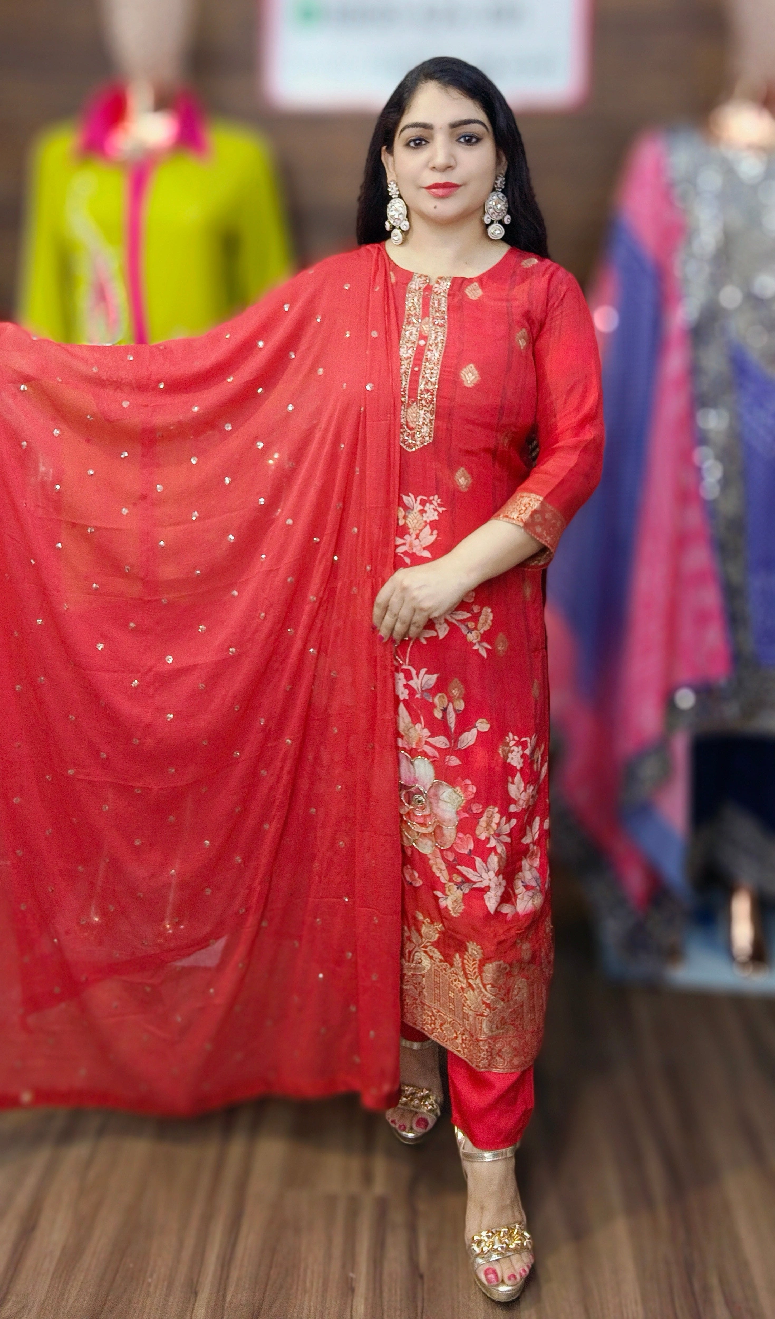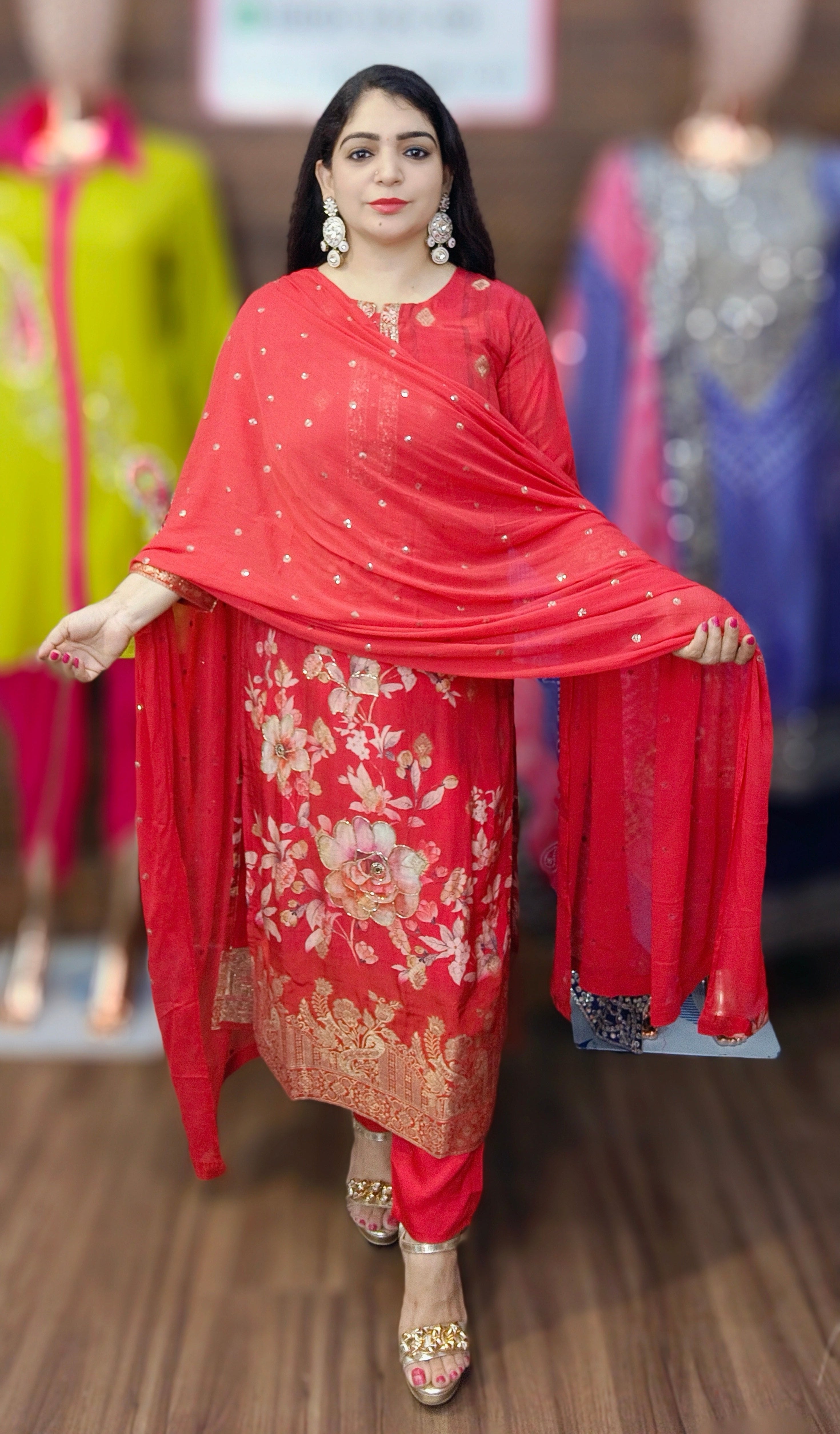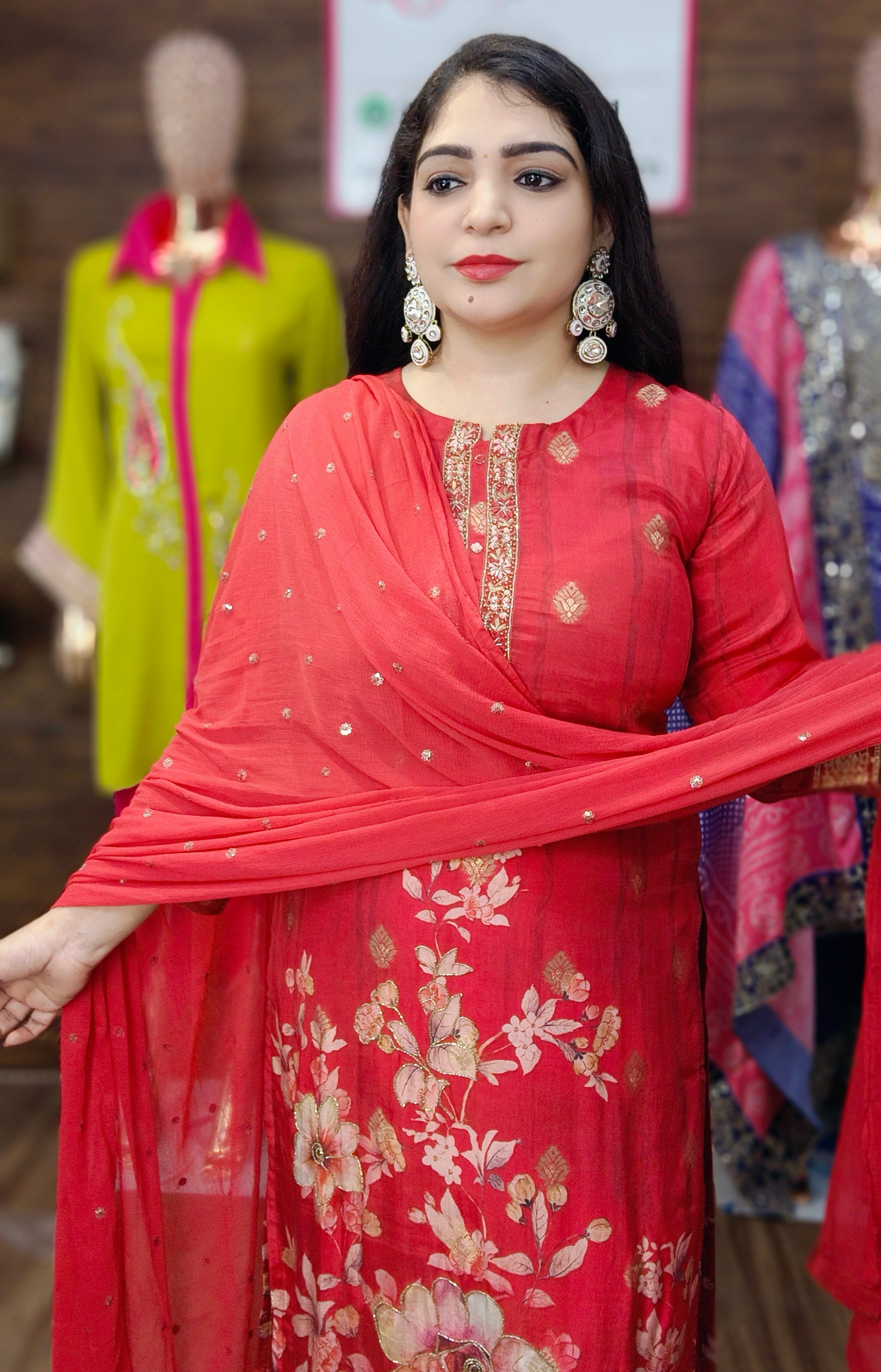 This elegant RED PURE SILK SUIT  features intricate floral embroidery, adding a touch of sophistication to your wardrobe. The suit comes with a matching dupatta, completing the look with a cohesive and stylish ensemble. Perfect for special occasions or formal events, this outfit is sure to make a statement and turn heads wherever you go.