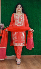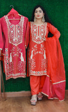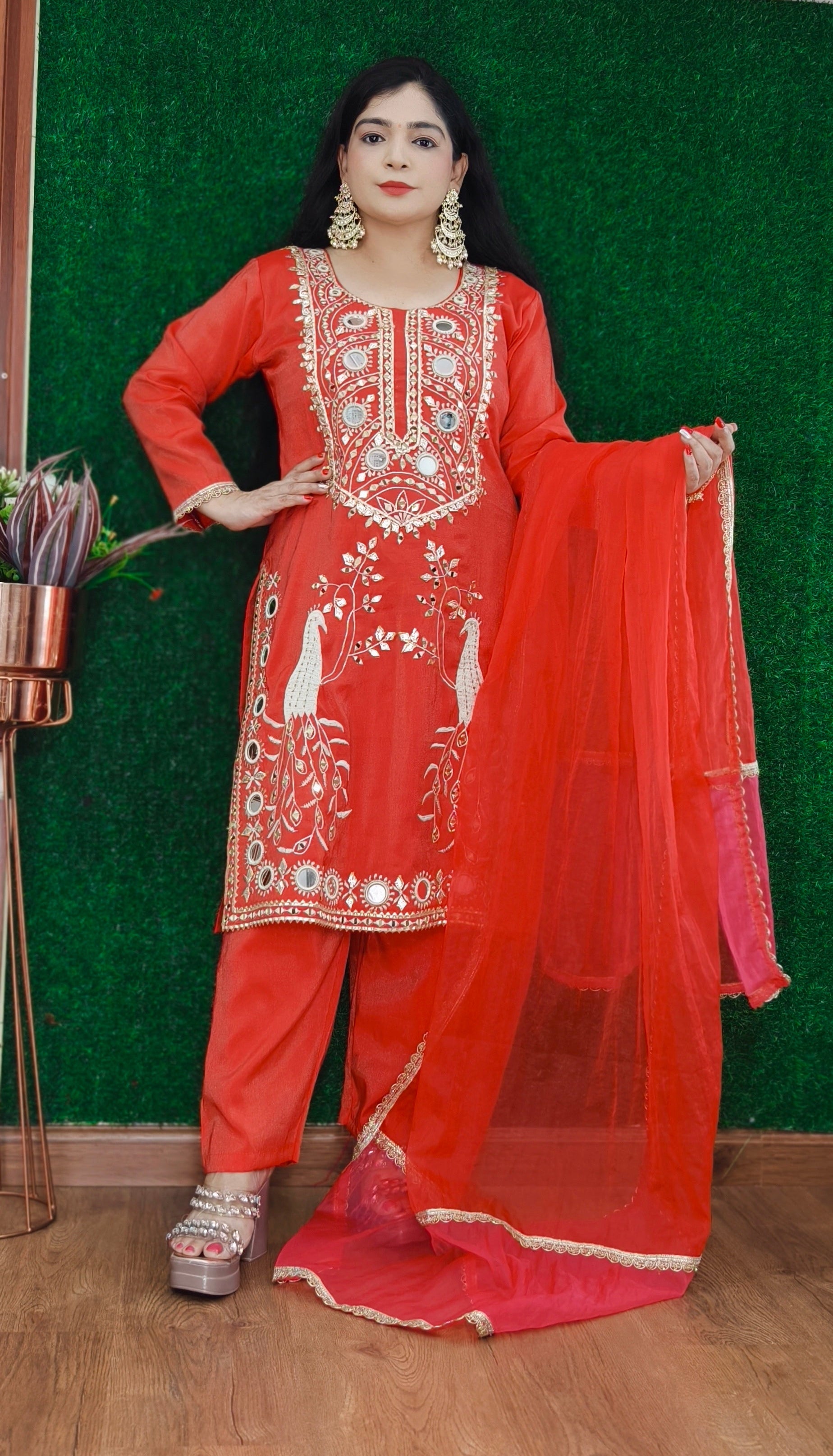 A must have RUST AND PINK PARTY WEAR TISSUE FABRIC SUIT WITH PANT  in your wardrobe.Perfect for any occasion in this Summer Season