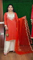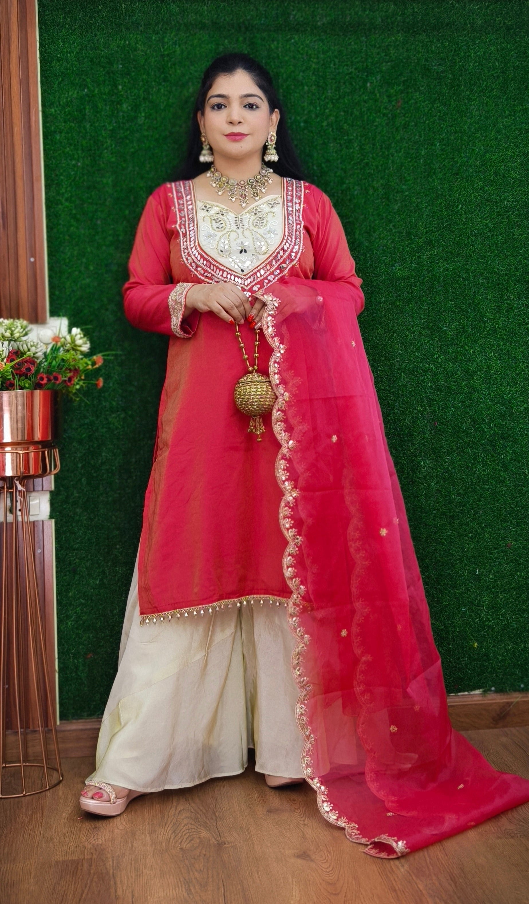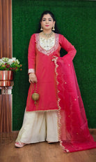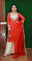 A must have RUST AND PINK PARTY WEAR TISSUE FABRIC SUIT WITH PLAZO in your wardrobe.Perfect for any occasion in this Summer Season