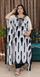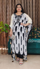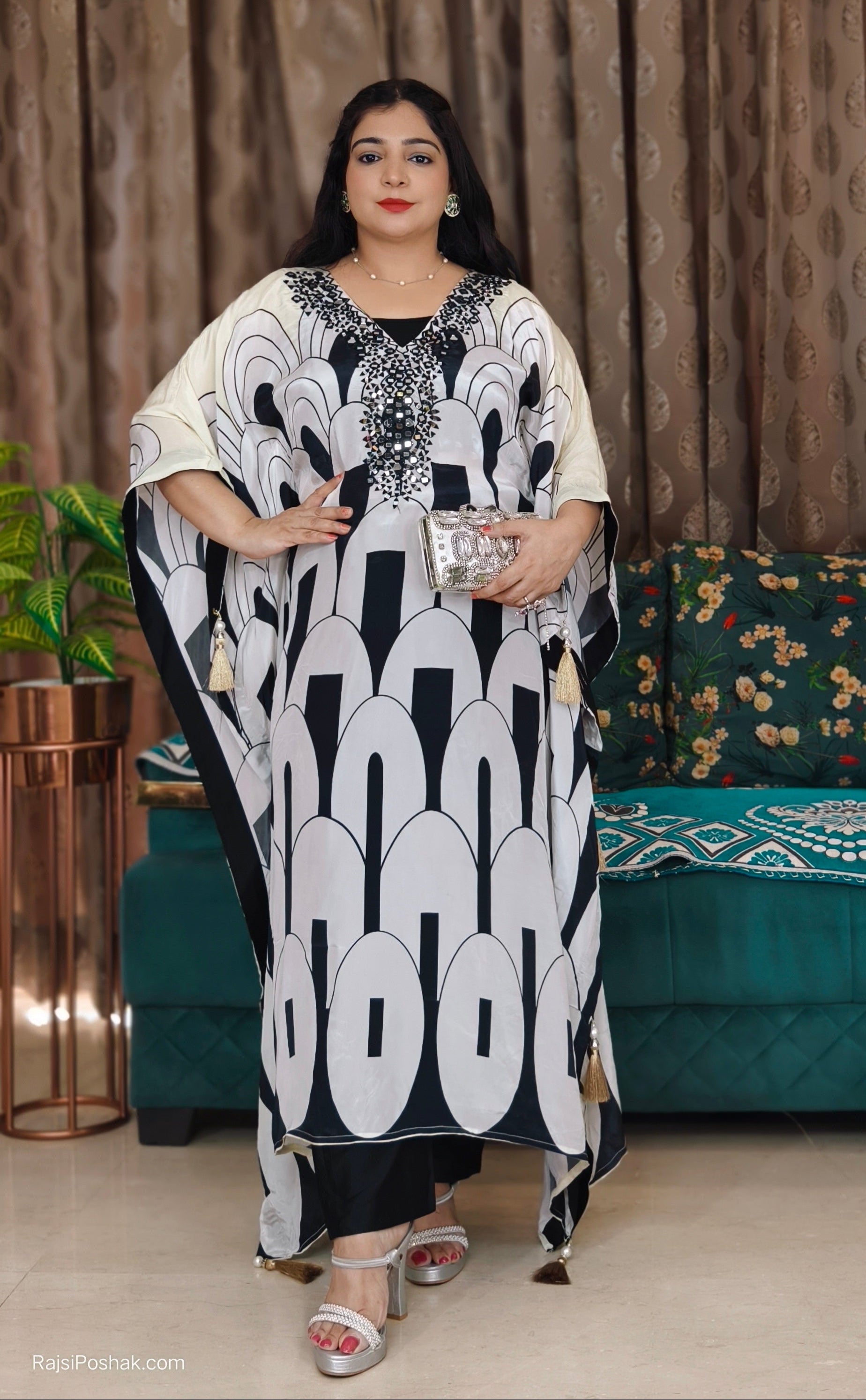 TRENDY WHITE/BLACK CREPE PARTY WEAR KAFTAN WITH PANT & MIRROR