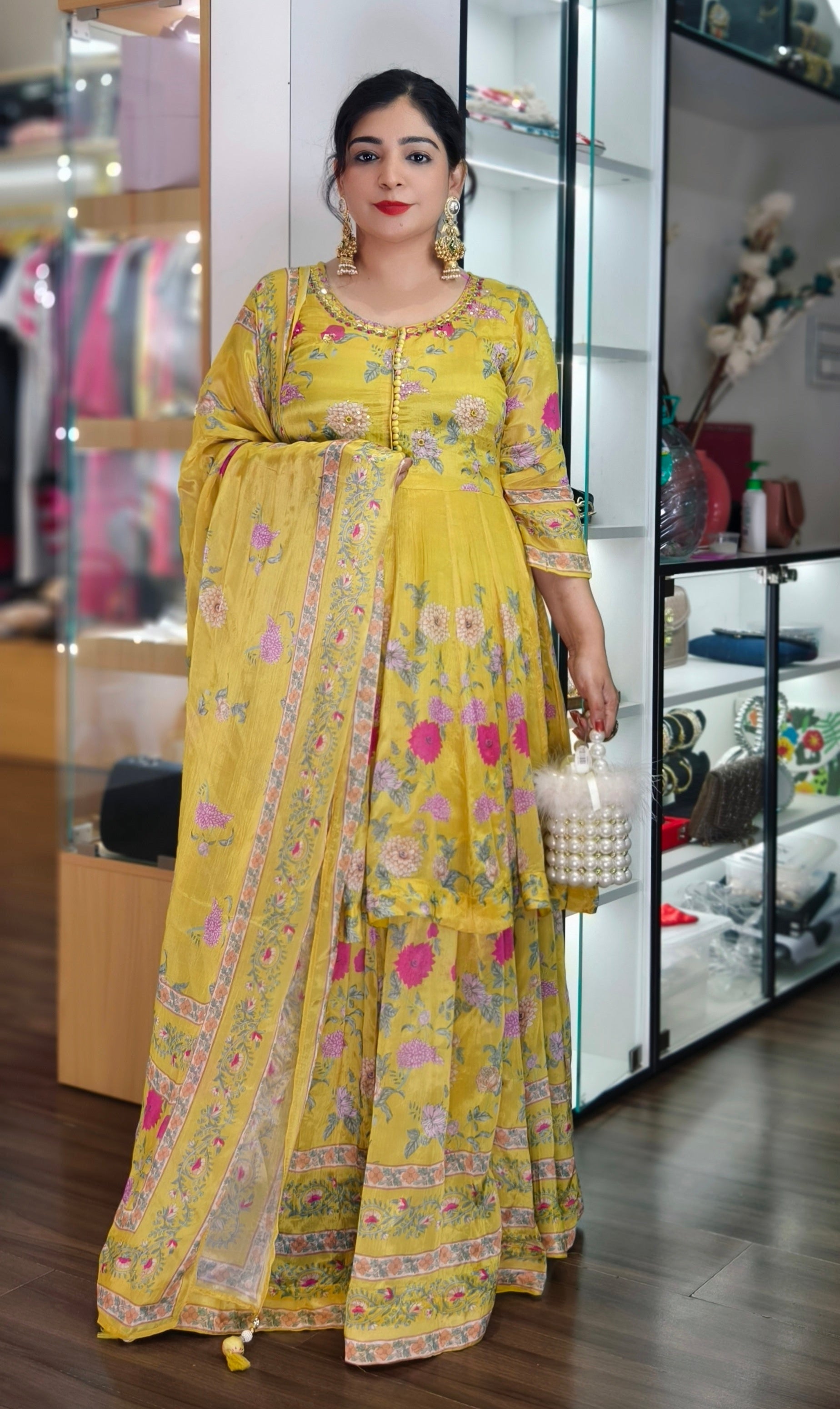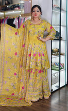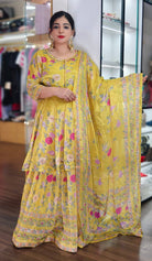 A must have WHITE AND YELLOW PREMIUM CREPE KURTI WITH FLARED SKIRT AND HEAVY DUPATTA in your wardrobe. Perfect for special occasions or formal events, this outfit is sure to make a statement with its stunning design and attention to detail. Made with high-quality materials, this suit is both stylish and comfortable, making it a versatile addition to any fashion-forward individual's collection.