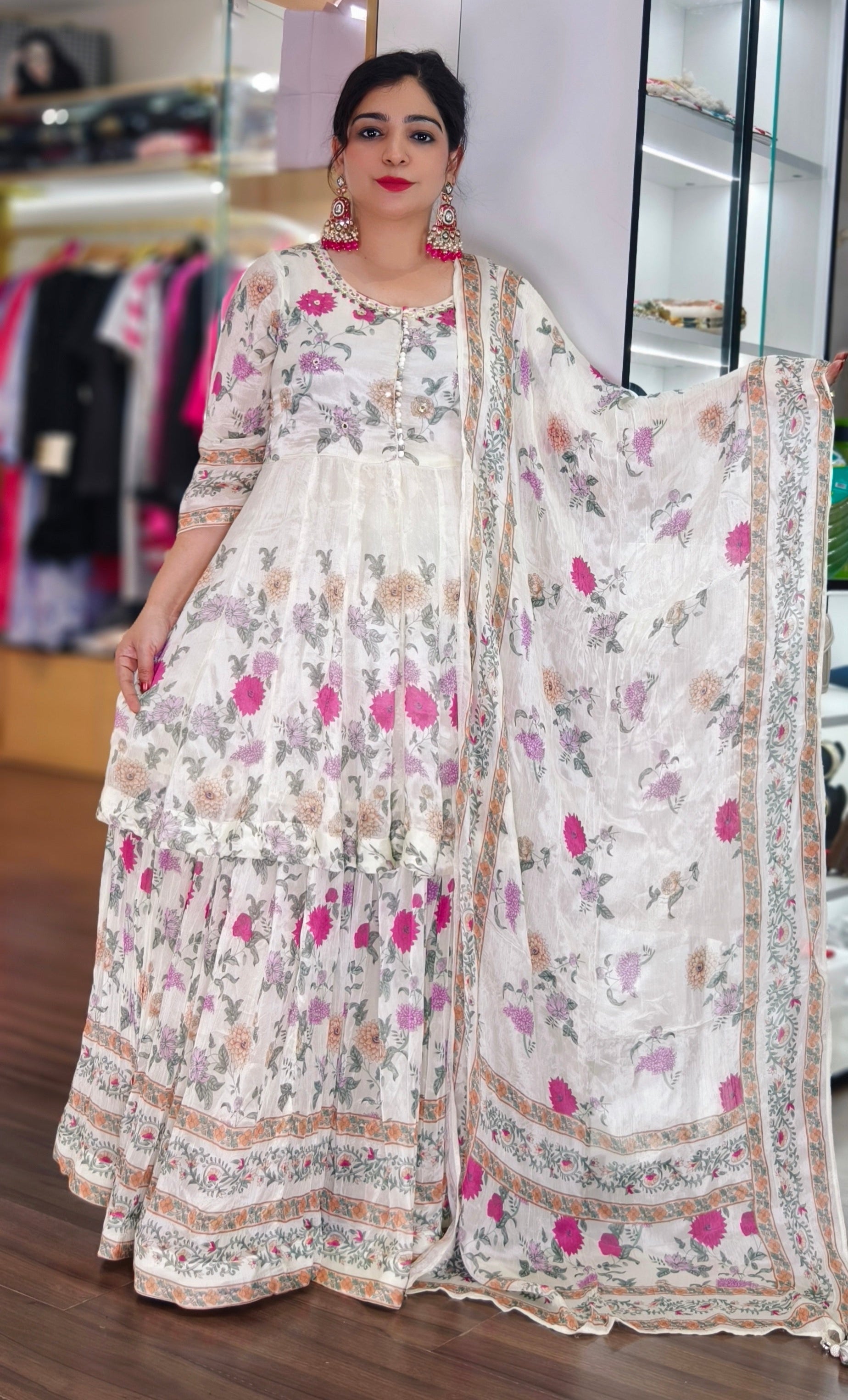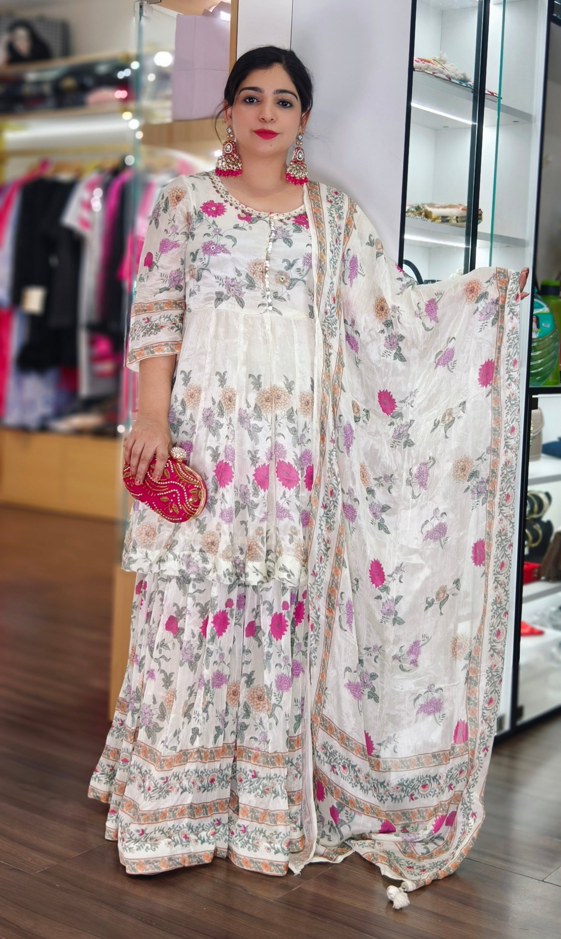 WHITE AND YELLOW PREMIUM CREPE KURTI WITH FLARED SKIRT AND HEAVY DUPATTA