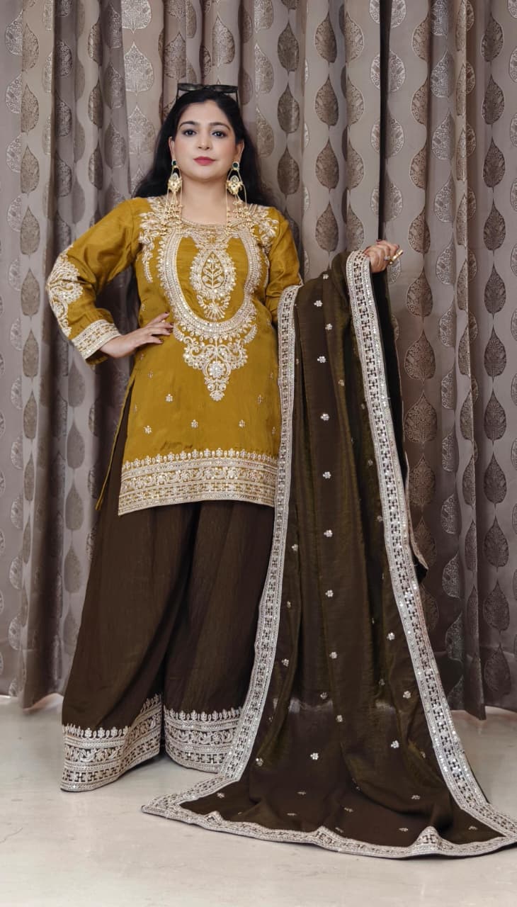 YELLOW AND MAROON CHINON SHARARA SUIT WITH ZARI AND SEQUENCE WORK AND FULL LINING