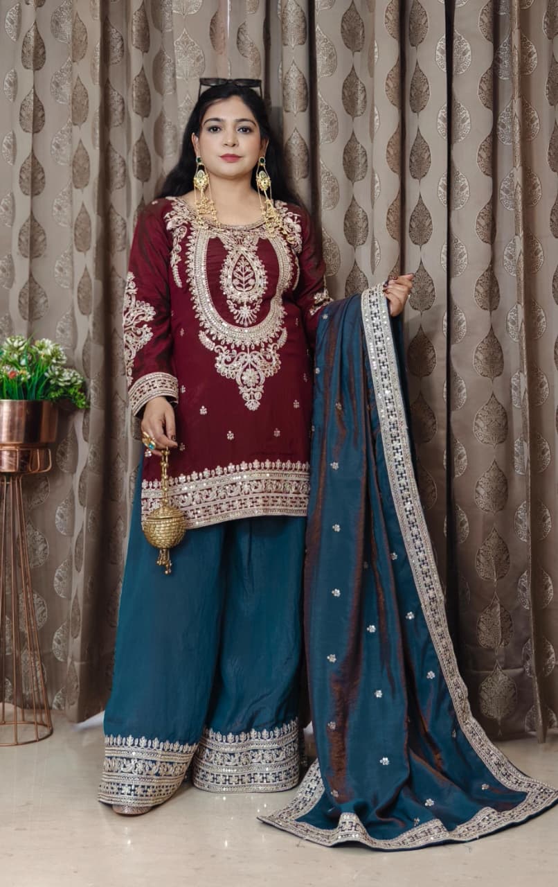 This YELLOW AND MAROON CHINON SHARARA SUIT WITH ZARI AND SEQUENCE WORK AND FULL LINING captivating image features three women adorned in vibrant, colorful outfits, each reflecting a unique style that celebrates individuality and cultural diversity. Standing confidently in front of an ornate building, the women exude a sense of camaraderie and joy, their attire harmonizing beautifully with the intricate architectural details of the backdrop. The building, characterized by its elaborate design and rich textures, serves as a stunning contrast to the lively hues of the women's clothing, creating a visually striking composition.