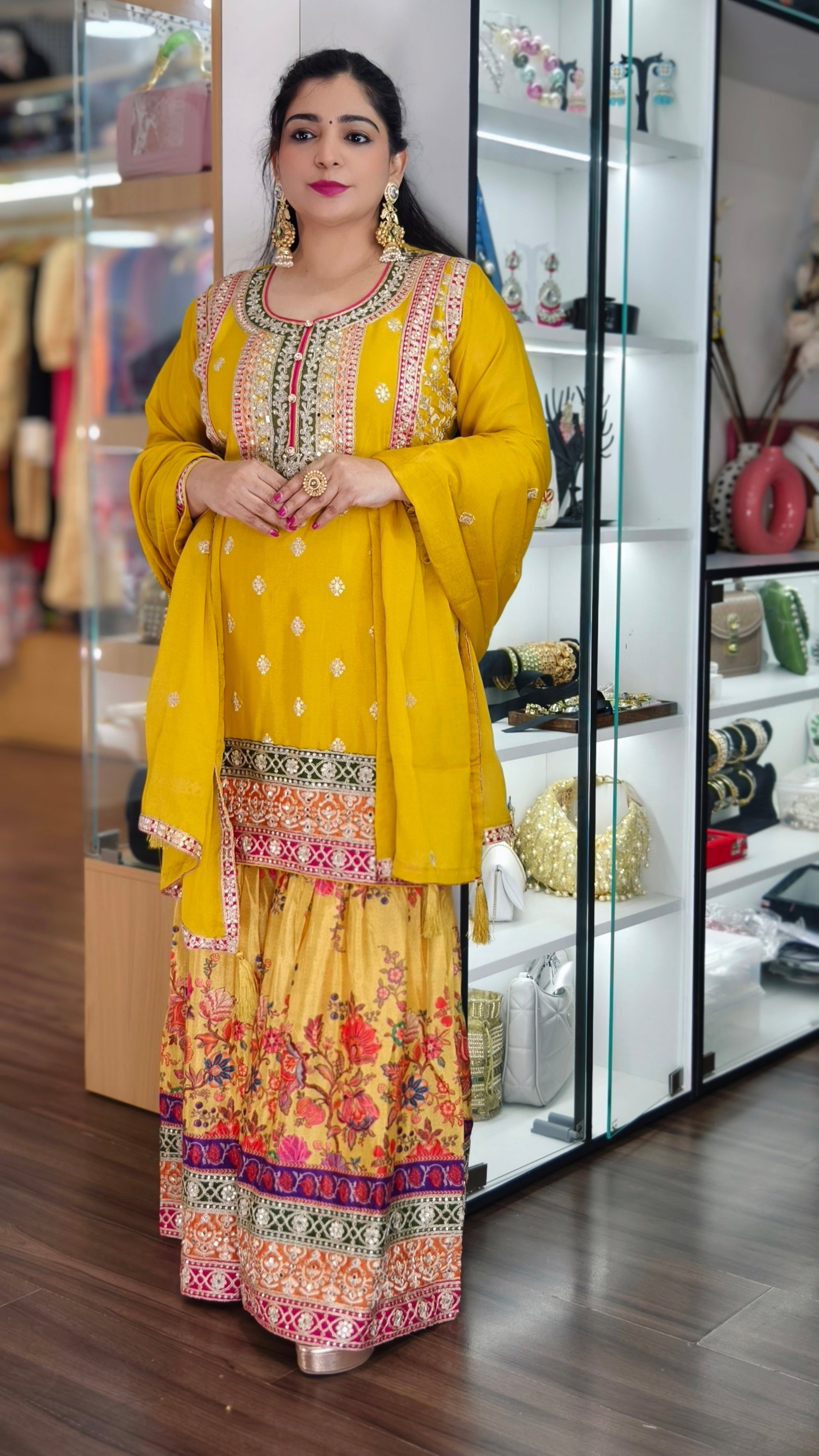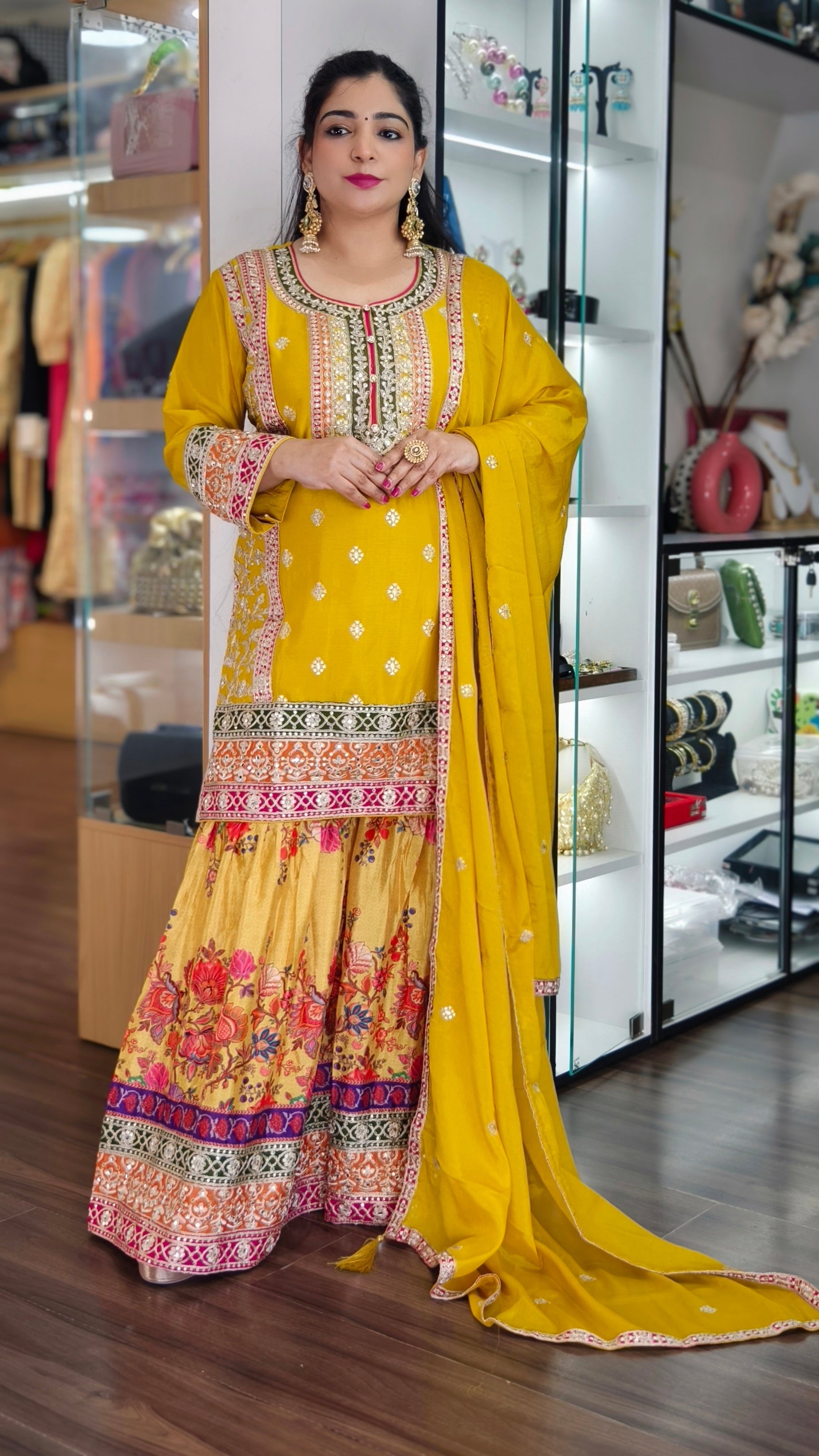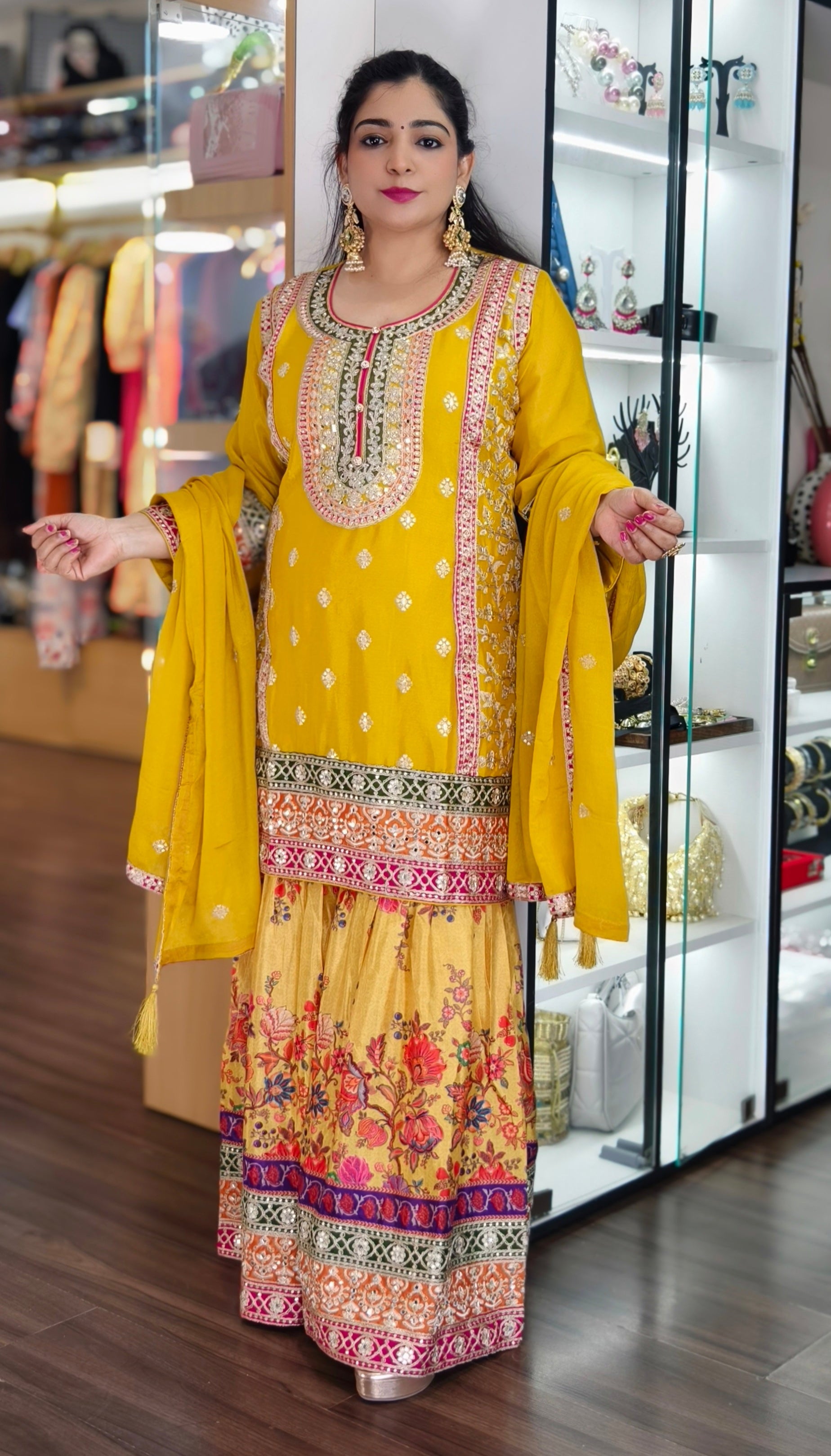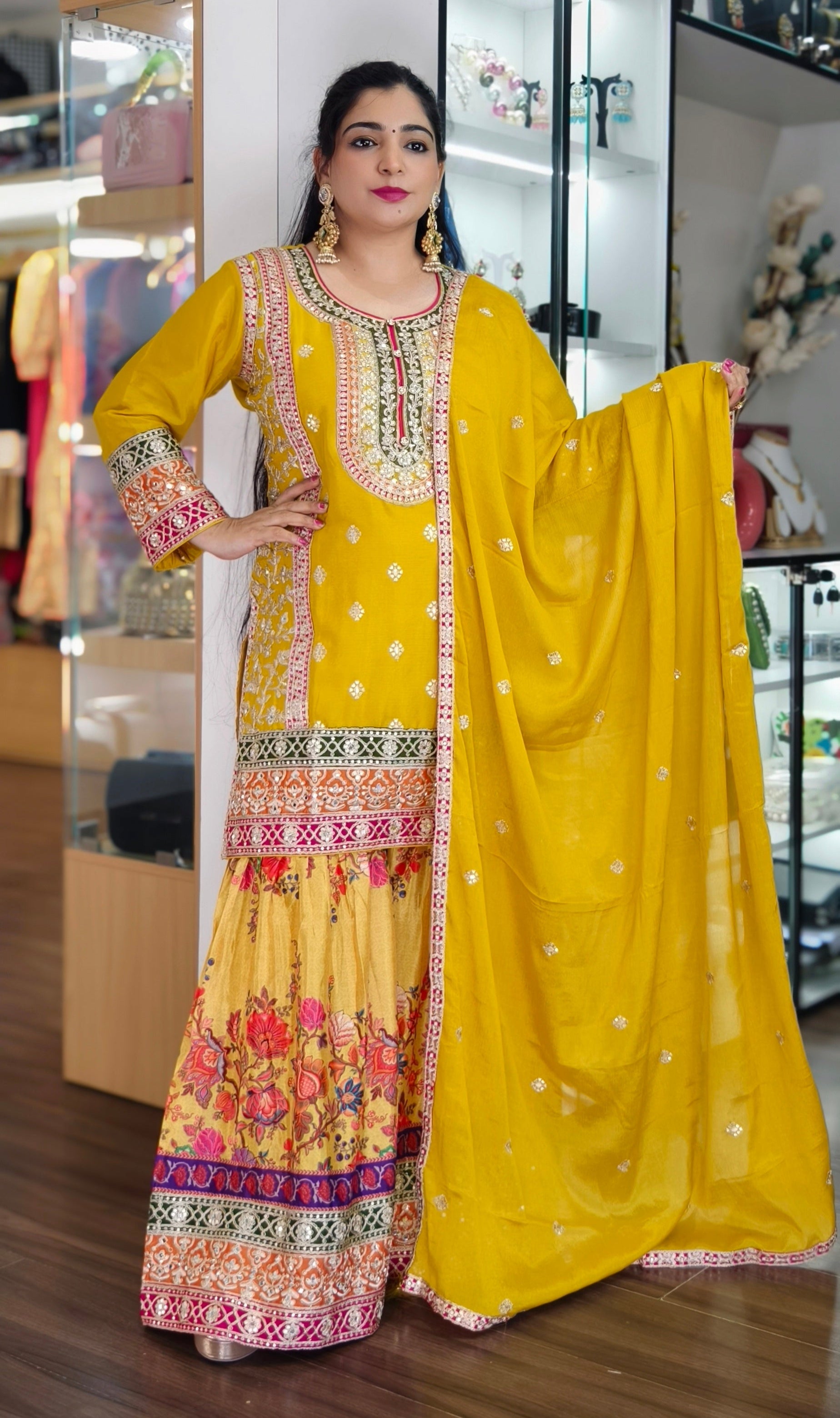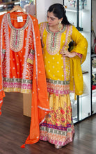 YELLOW AND ORANGE PREMIUM CHINON EMBRORAIRED CREPE SHARARA SUIT WITH FULL DUPATTA