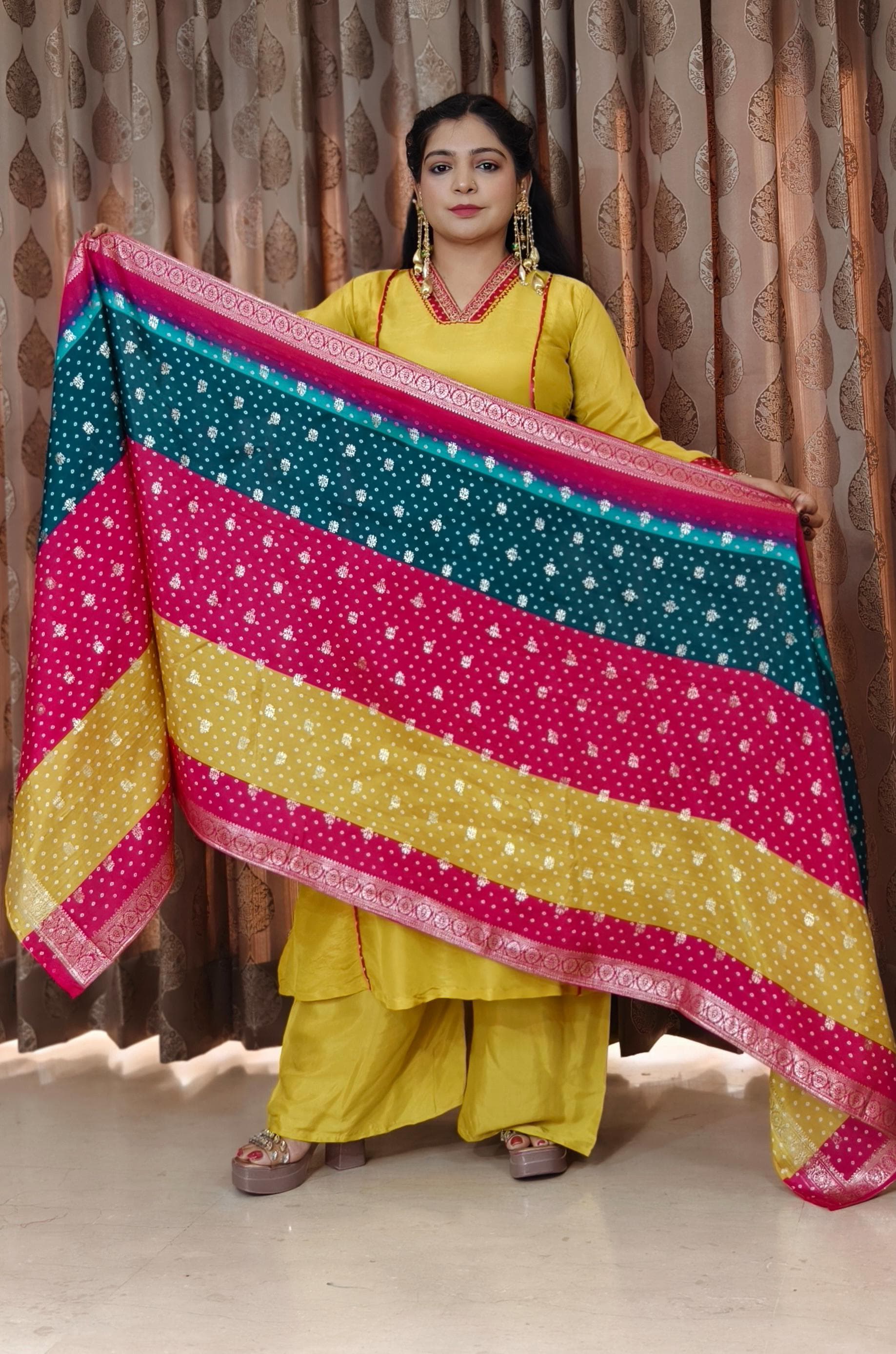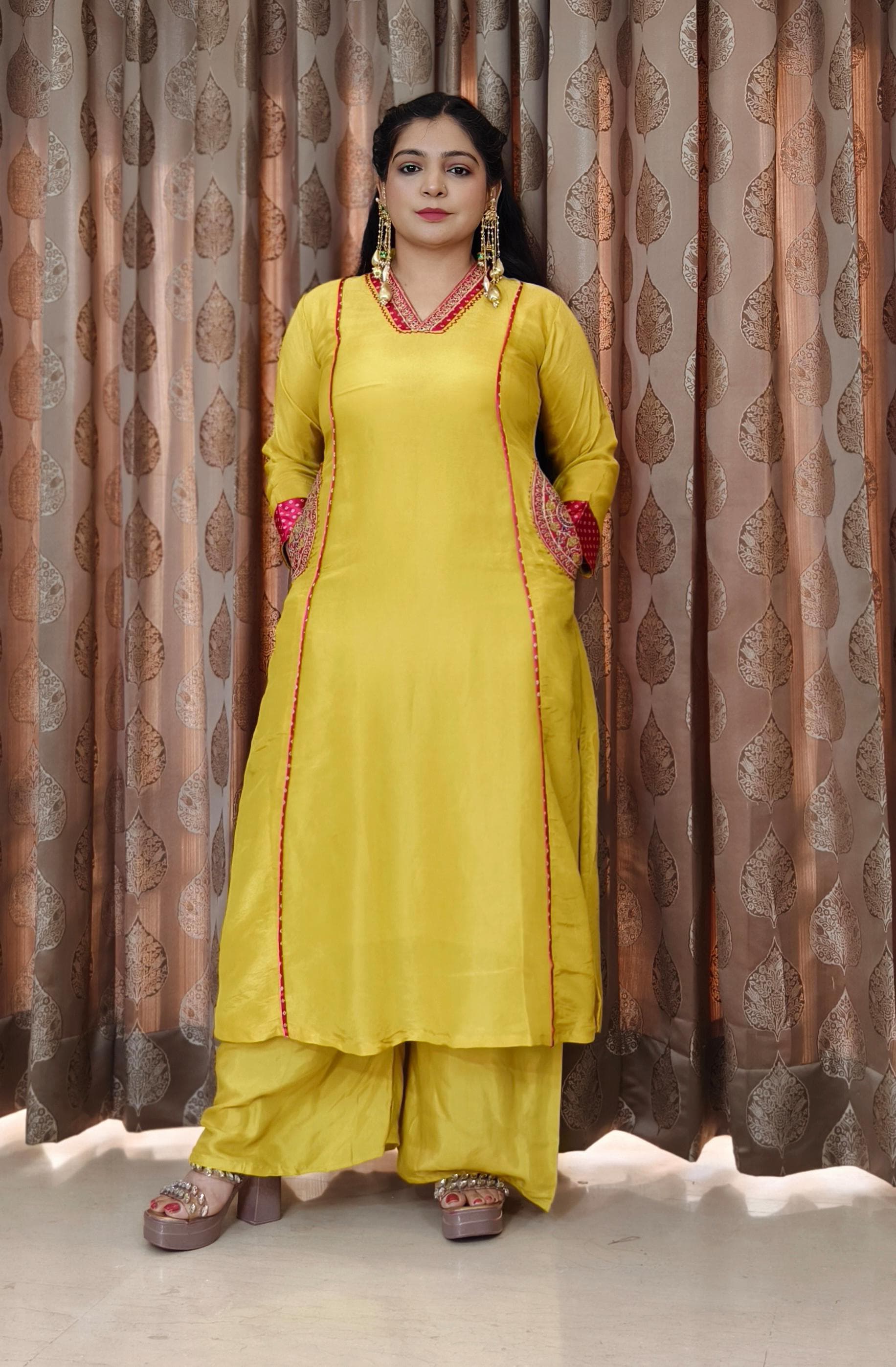 This elegant ensemble features a YELLOW PURE DOLA SILK A-LINE TOP FEATURING INTRICATE ALL-OVER HANDWORK,WITH BANARSI DUPATTA AND PLAZO designed with intricate all-over handwork that adds a touch of sophistication. The top is adorned with exquisite delicate lace detailing, enhancing its visual appeal. It is paired with a Premium Shantoon Bottom, offering both comfort and style. Perfect for special occasions, this outfit exudes timeless charm and elegance.