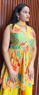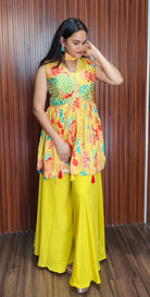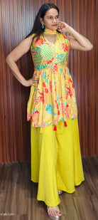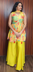 Embrace Timeless Elegance with Our YELLOW SHORT PEPLUM SUIT WITH SHARARA CHOKAR DUPATTA