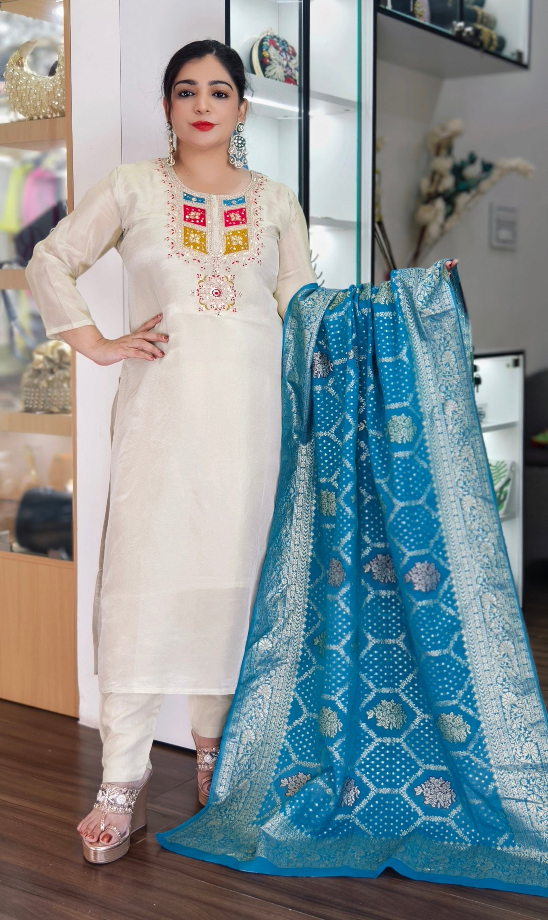 This elegant ensemble features an Off-White Tusse with a delicate subtle shimmer, offering a soft, radiant glow that adds a refined touch to the outfit. Paired with it is a luxurious Banarasi Dupatta, known for its intricate weaving and rich patterns, showcasing traditional artistry. The Banarasi dupatta, with its heavy zari work, enhances the overall beauty, making this combination perfect for special occasions like weddings, festivals, or elegant gatherings. The fusion of shimmer and traditional craftsmanship creates a sophisticated and timeless look.