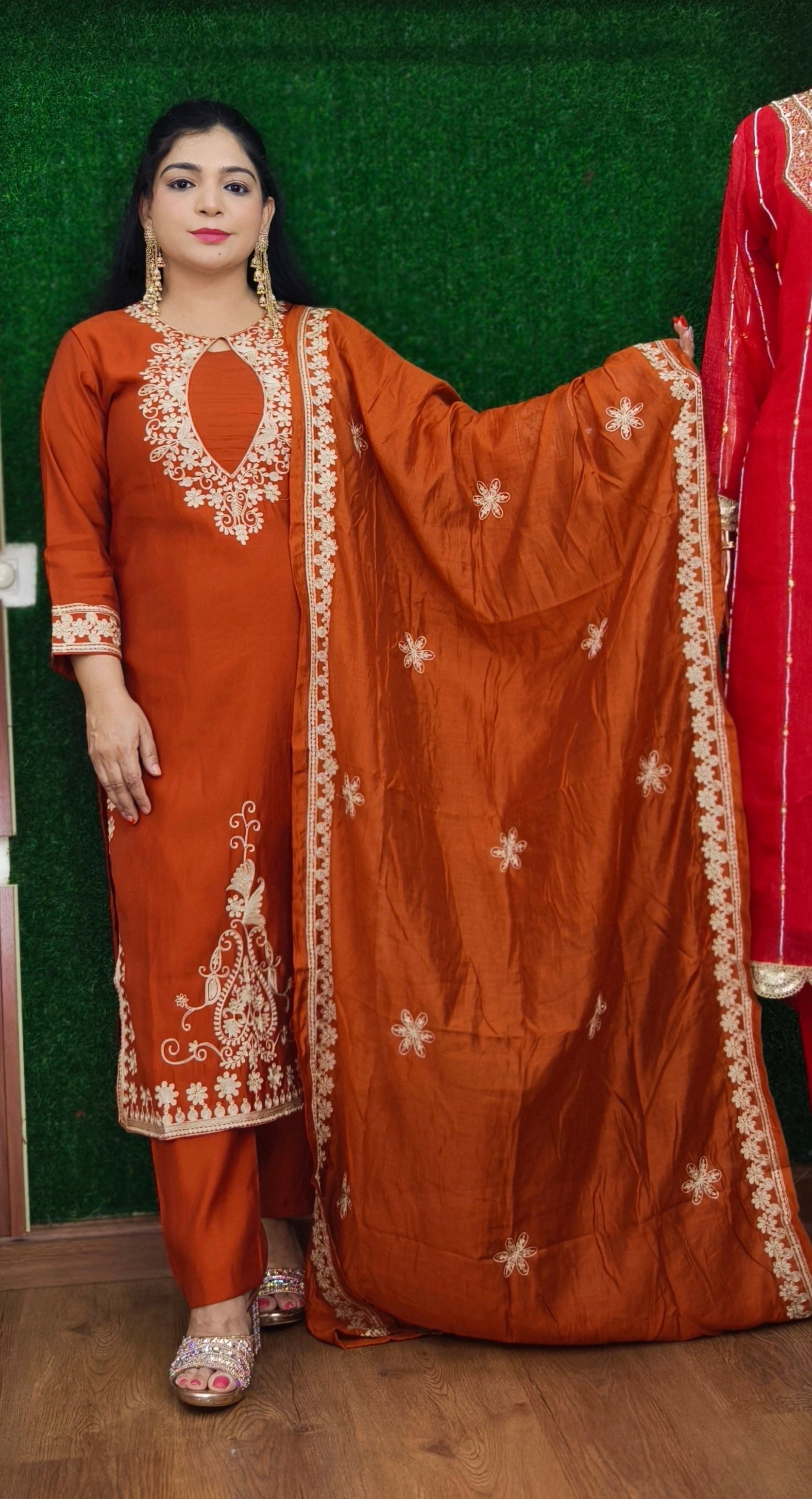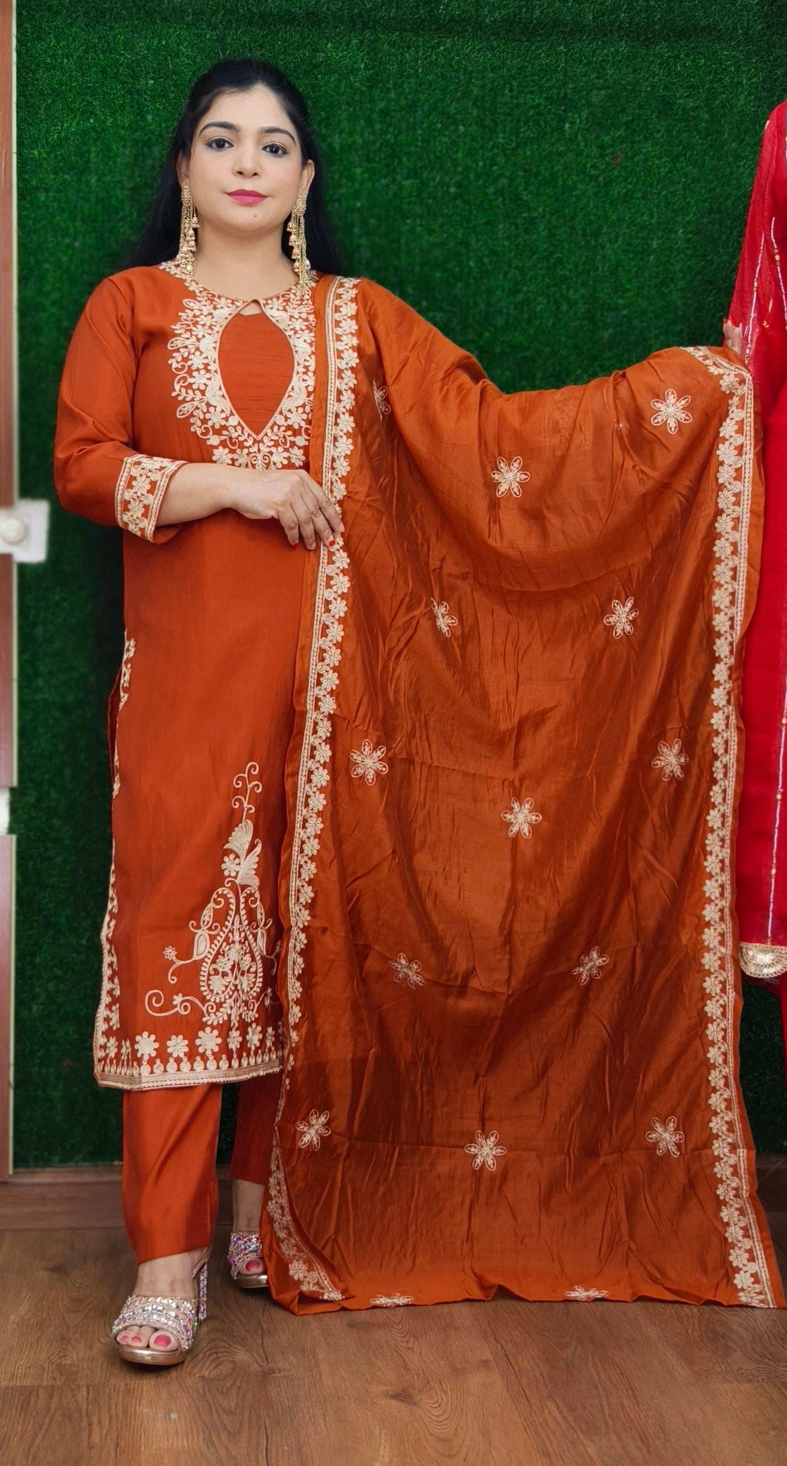 RUST AND BROWN RUSSIAN SILK SUIT WITH PANT AND DUPATTA