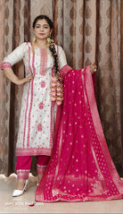 WHITE SILK EMBROIDERED SUIT WITH COTTON LINING & BANARSI DUPATTA