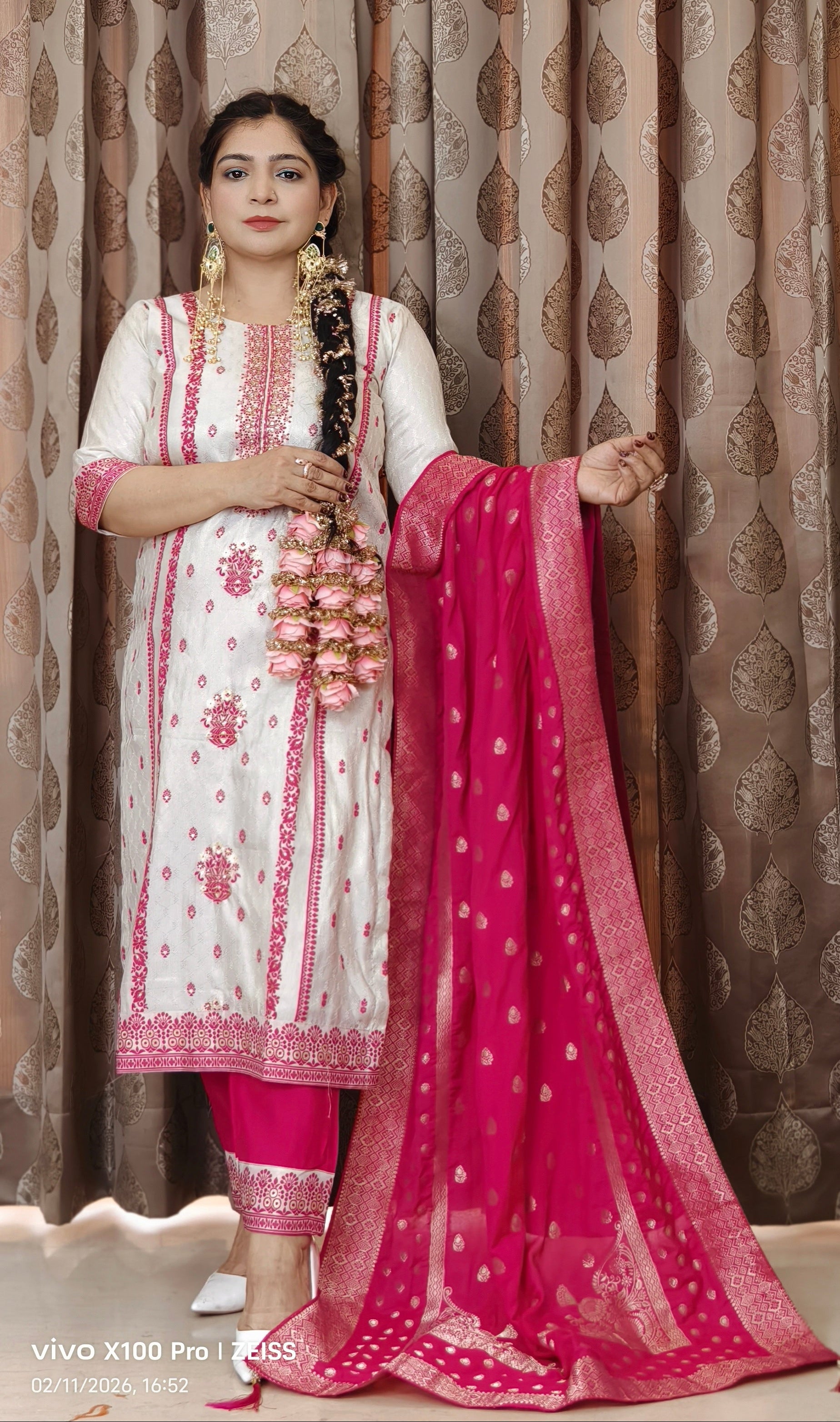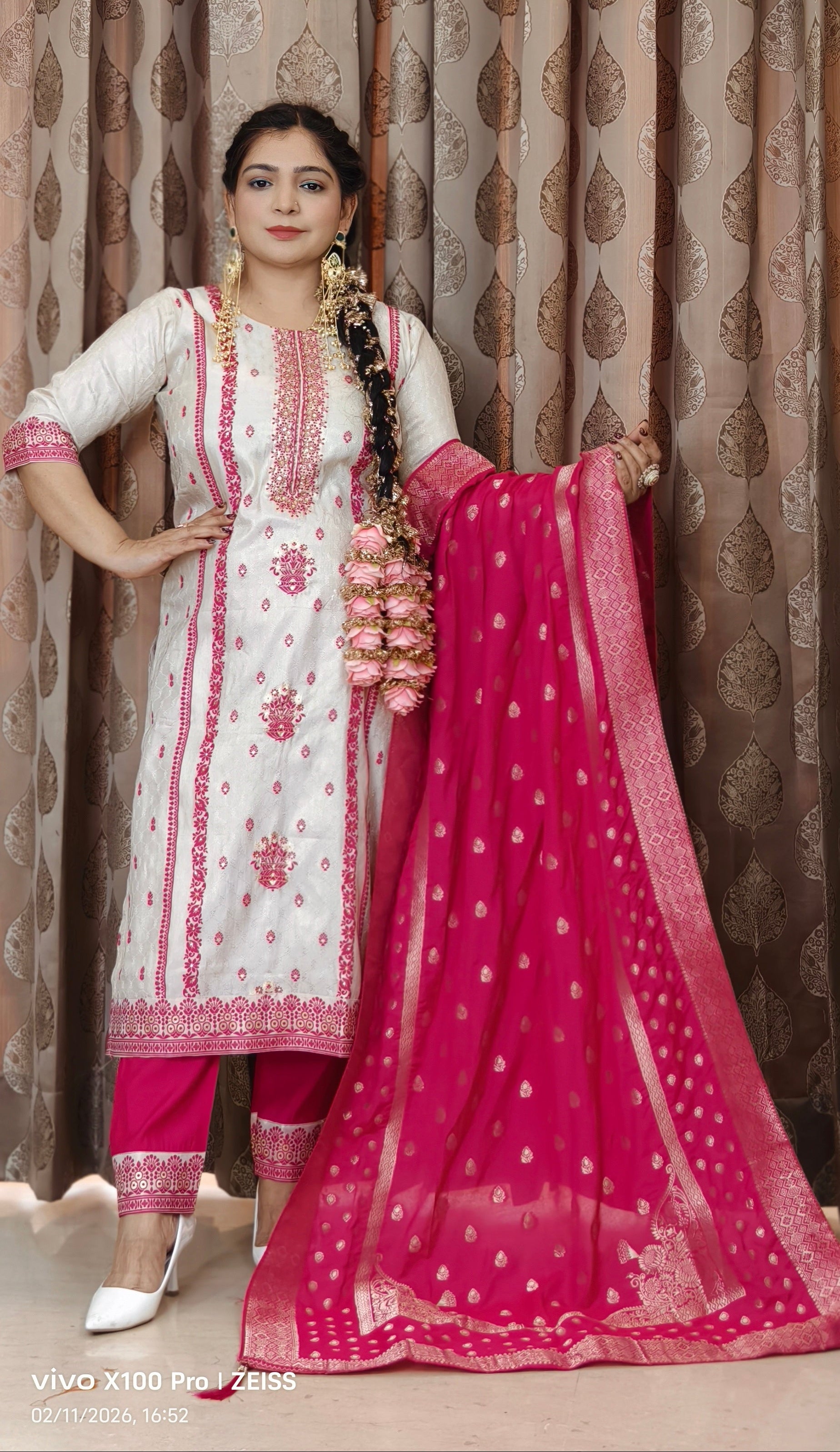 This elegant WHITE SILK EMBROIDERED SUIT WITH COTTON LINING & BANARSI DUPATTA embroidered suit with a dupatta is the perfect addition to your wardrobe. The intricate embroidery and delicate detailing make it a timeless and sophisticated choice for any special occasion. Made with high-quality fabric, this suit is not only stylish but also comfortable to wear. Whether you're attending a wedding, a party, or a festive celebration, this suit is sure to make you stand out in the crowd.
