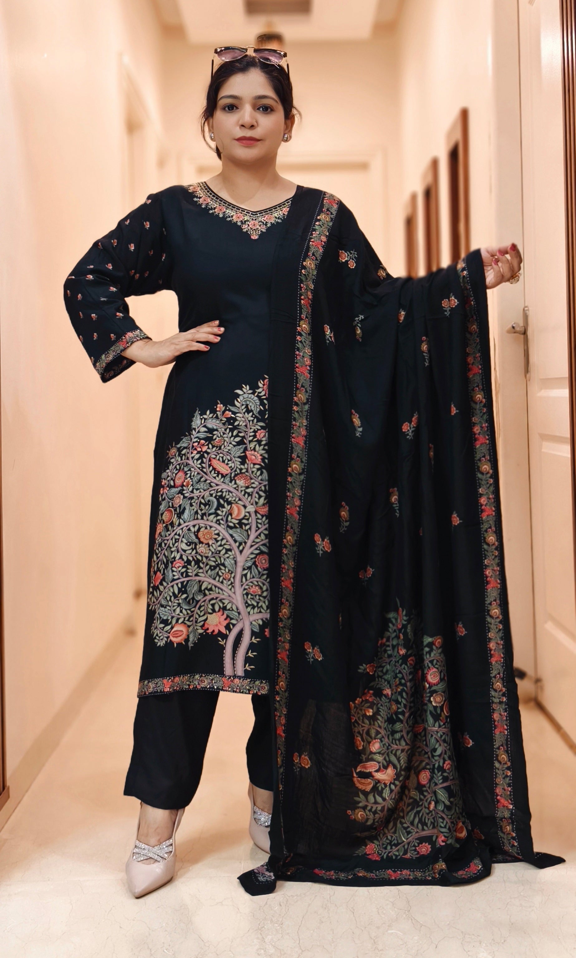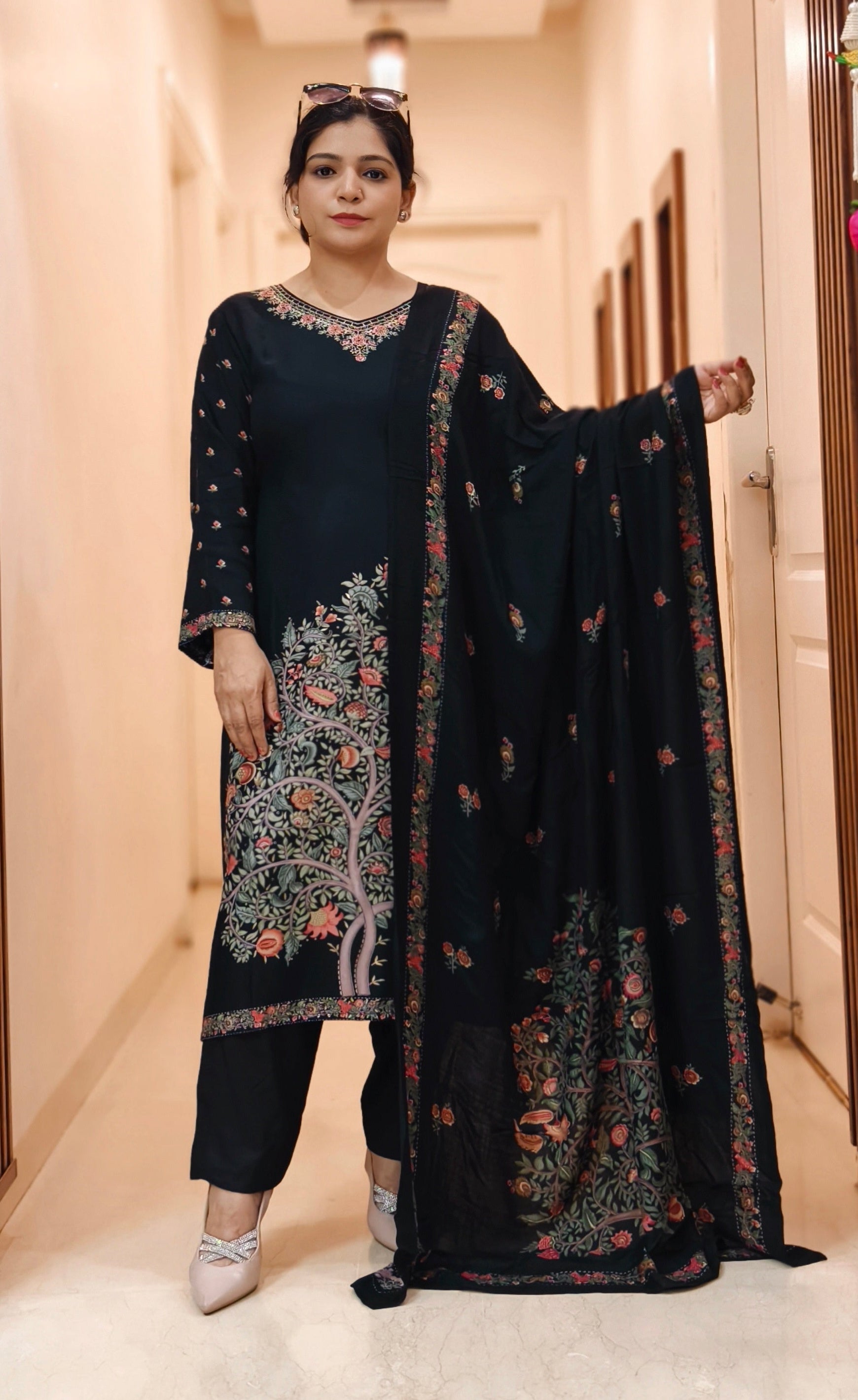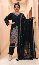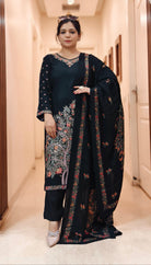 A must have BLACK,MAROON,YELLOW AND PURPLE PASHMINA WINTER  DESIGNER SUIT WITH DUPATTA  with  in your wardrobe.